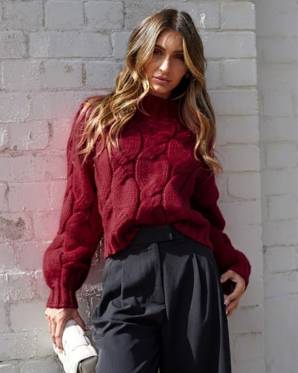 Our Hadi Knit comes in a beautiful wine colour. Make everyone in awe with this captivating knit that features a high round neckline, long extended sleeves, relaxed fit and textured fabric. Look perfect for your comfy casual look with a pair of straight jeans!