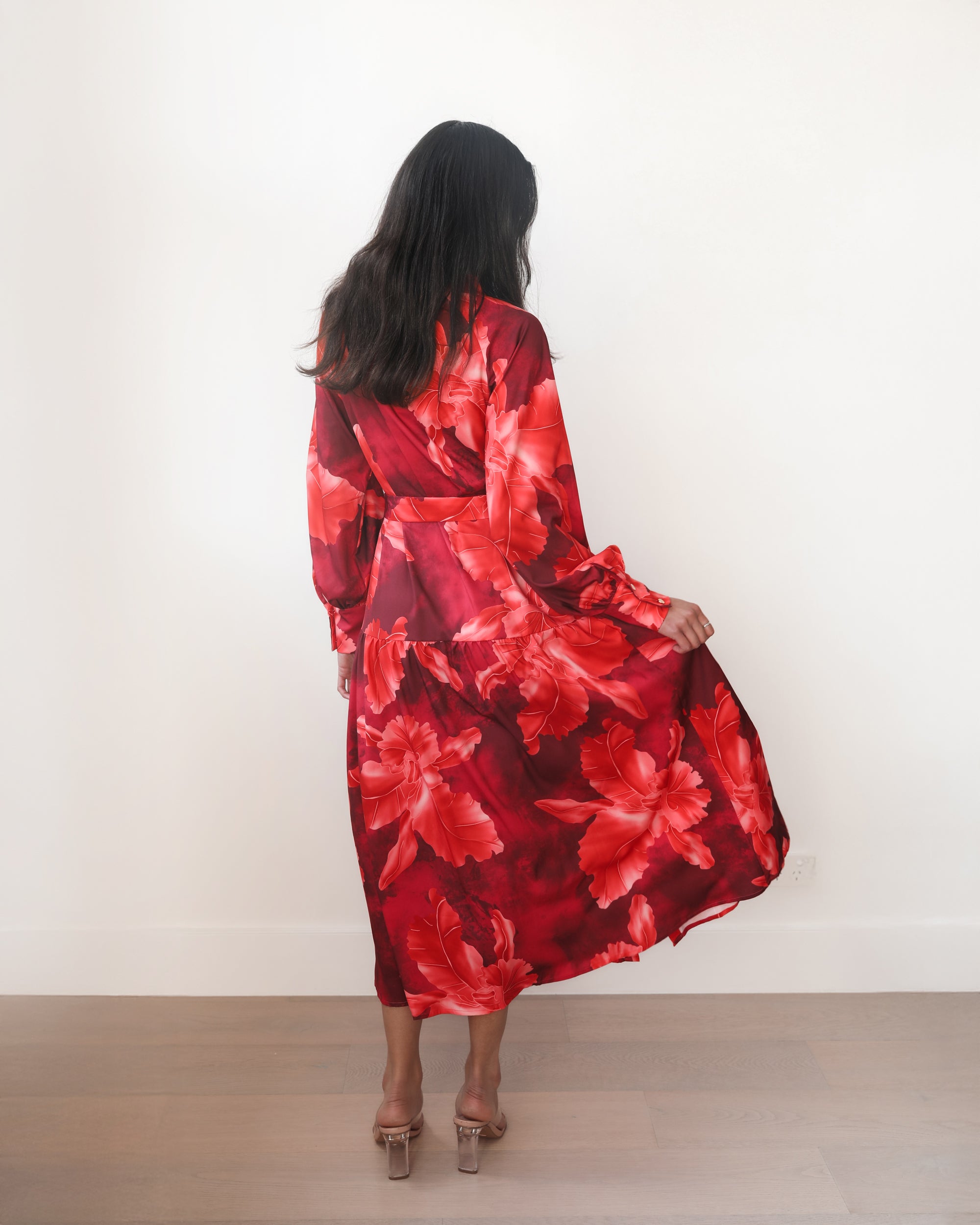 Our Zirella Dress comes in shades of red. Your floral-powered power move, this one-piece wonder features a collar, centre-front buttons, long balloon sleeves with cuffs, waist belt, flowy skirt and maxi length hem. Look extra beautiful with strappy heels, a tousled ponytail, and your signature lipstick!