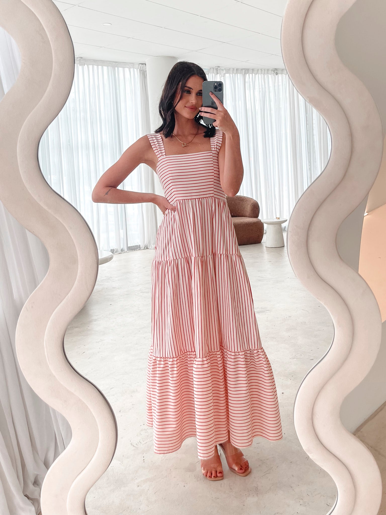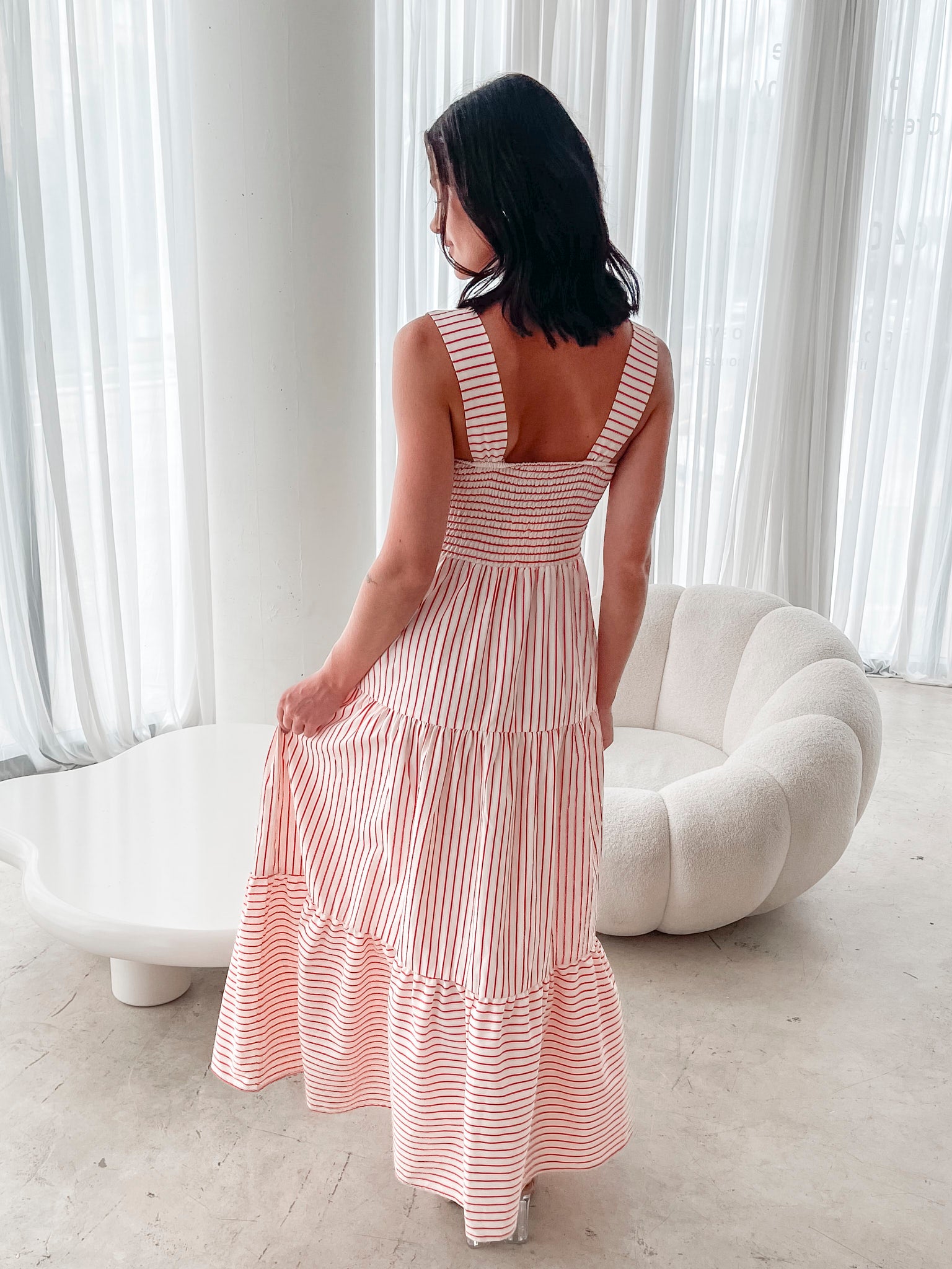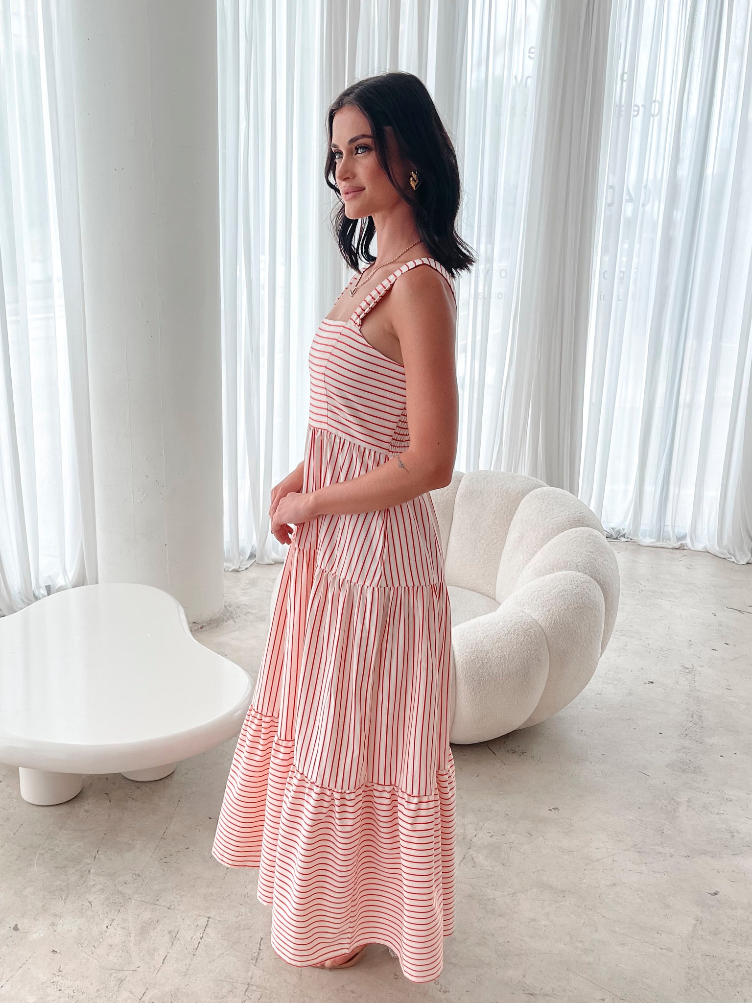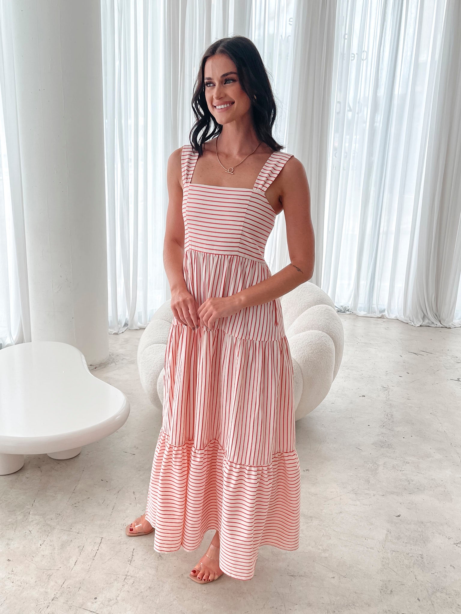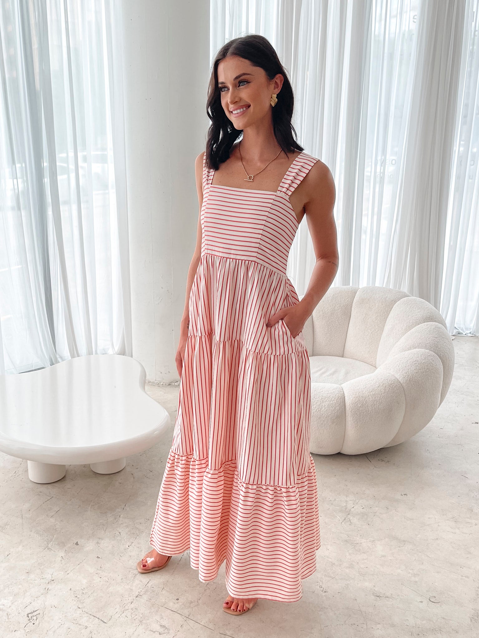Our Galathea Dresss comes in shades of red. A perfect blend of nautical charm and modern elegance, this piece features wide straps, square neckline, flowy tiered skirt and maxi length hem. Pair it with espadrilles for a chic coastal vibe or elevate it with heels for a striking city look.