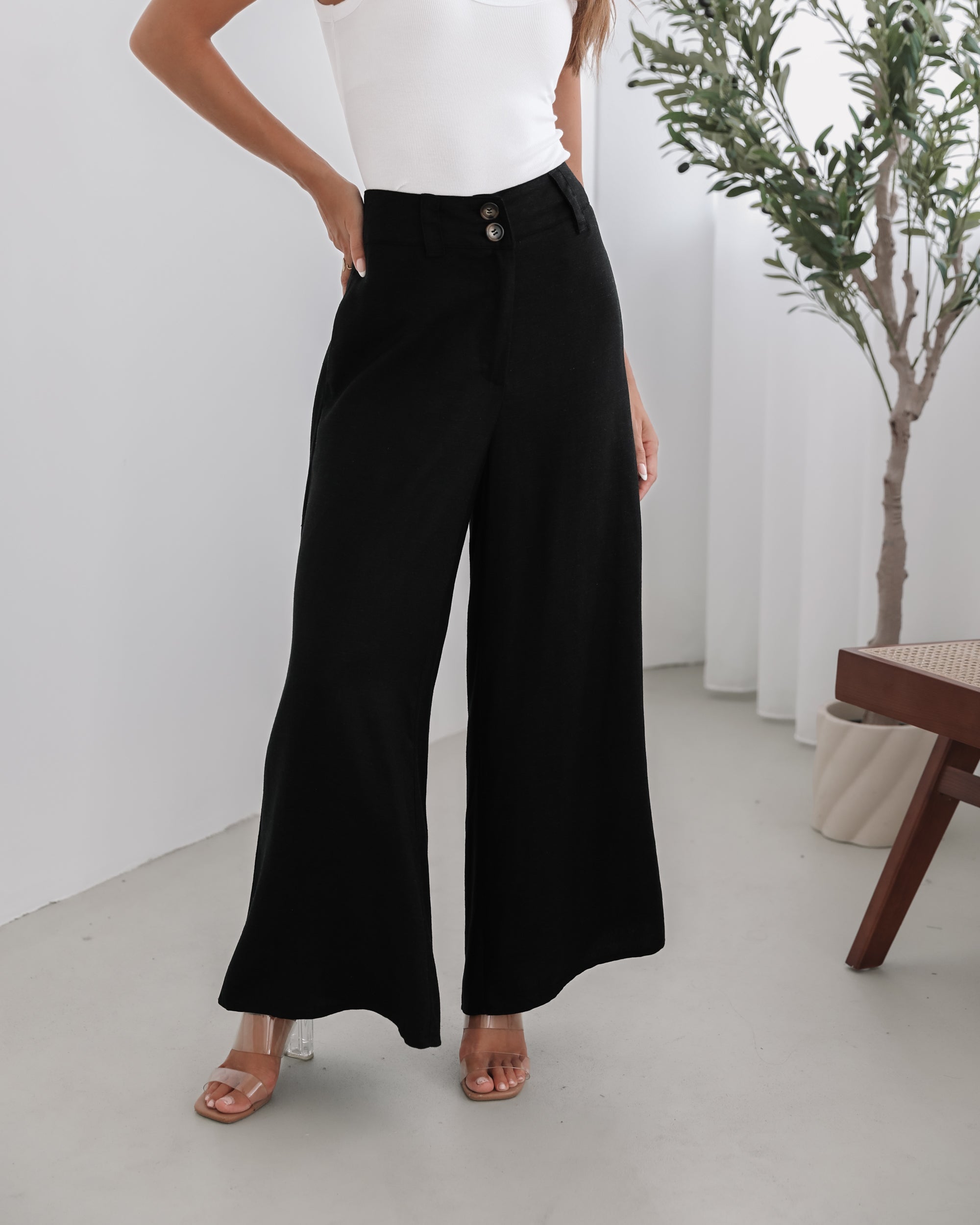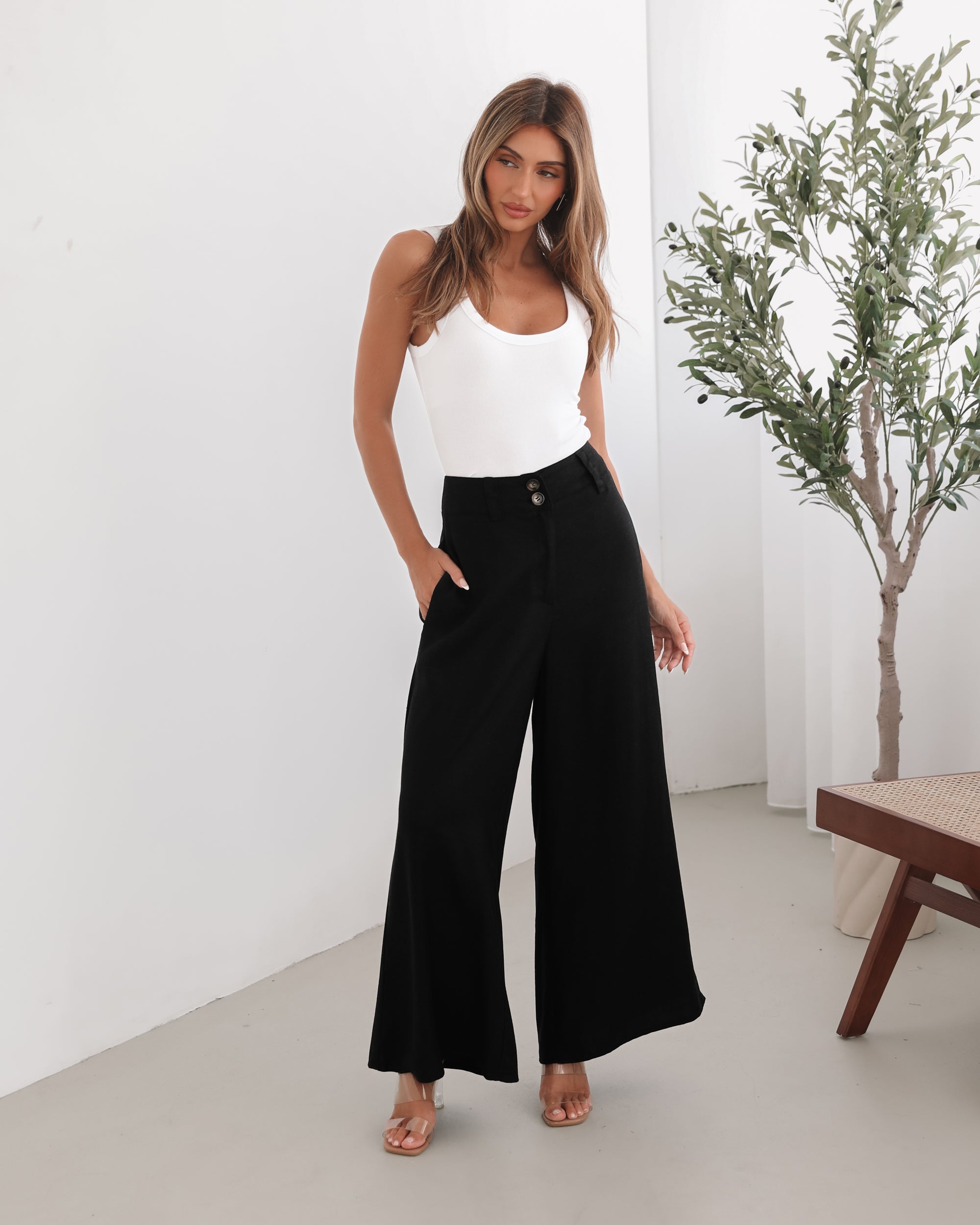 Our Alka Pants come in a black colour. A delicate look to make that subtle statement, this number is high waisted and features a button and zip closure, belt loops, side pockets, long length hem and wide leg fit. Style with a cami and flat sandals!
