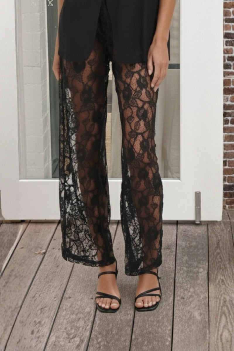 - Key Features: Sheer black floral lace fabrication (designed to be layered). Flattering high-waisted fit. Dramatic semi-wide-leg silhouette for movement. Scalloped edge detailing along the hemline.