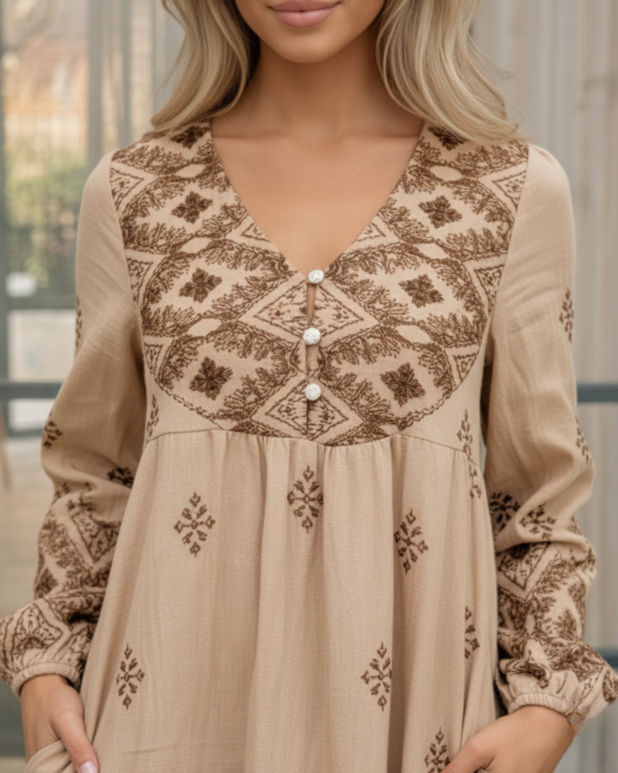 - Key Features: V-neckline with buttons. Long bishop sleeves. Relaxed fit. Knee length hem.