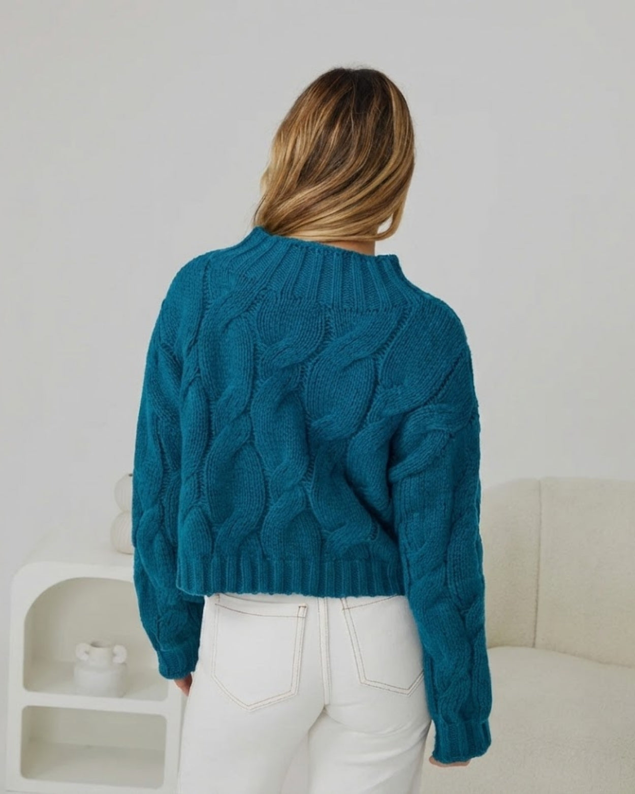 - Key Features: Features a stunning, oversized cable-knit pattern that adds depth and a premium feel to your ensemble. A sophisticated jewel tone that breathes life into your neutral winter staples. Boasts a relaxed fit with a chic high neckline and slightly ballooned sleeves for a contemporary edge. Crafted from a soft, high-quality blend designed to keep you warm without the bulk.