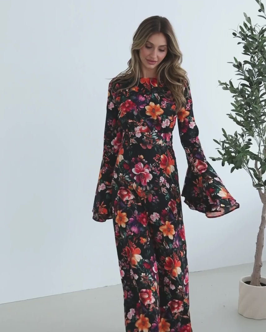 Our Amareya Dress comes in a black base with a multicoloured floral print. Making every moment feel a little more magical, this stunner is designed with a straight neckline, trumpet sleeves, flowy skirt and maxi length hem. Look classic chic with block-heel mules and a structured mini bag!