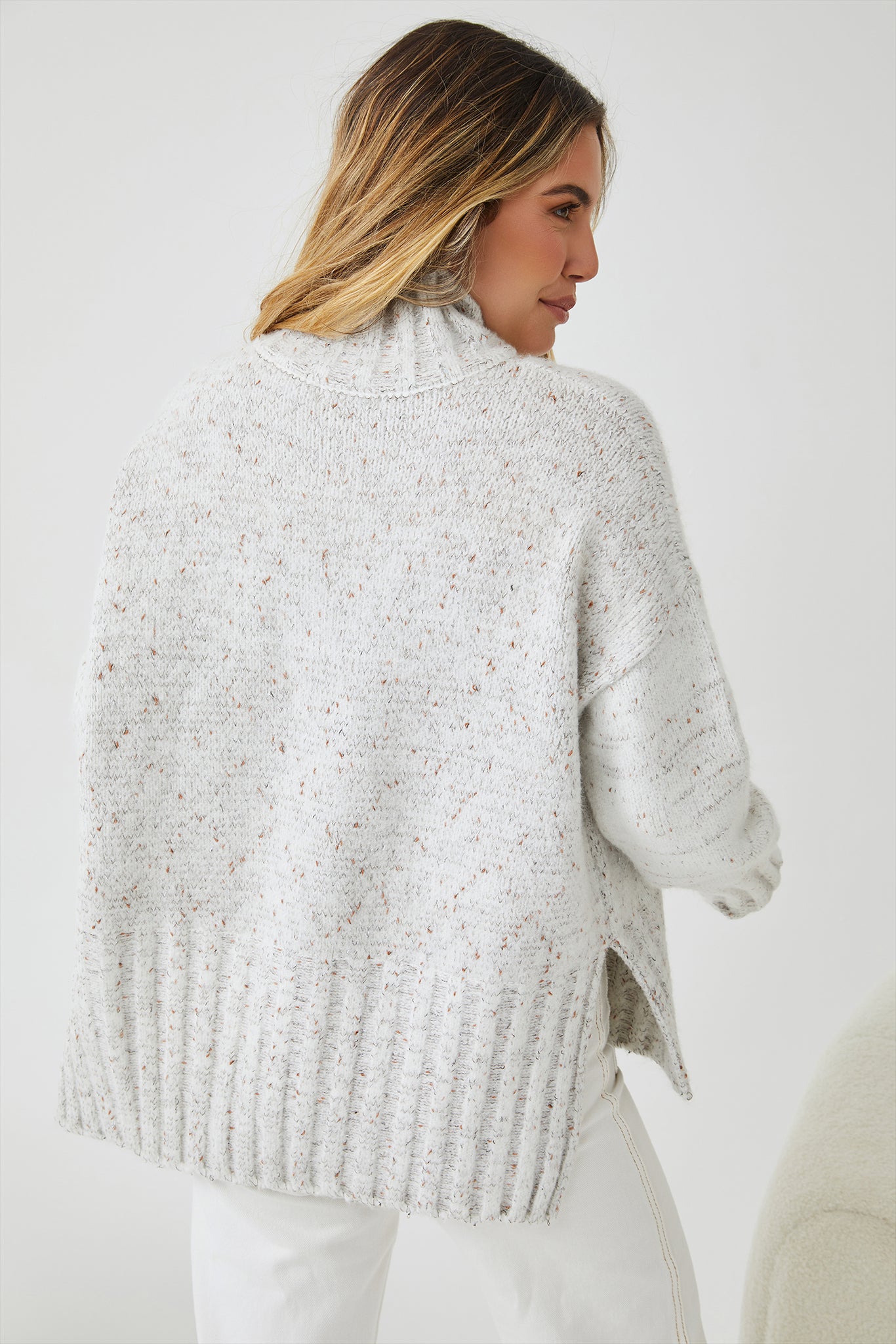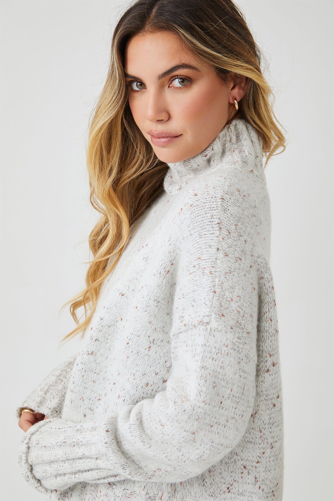 • Key Features: Grey Speckle. Medium weight minimal-stretch fabric. Unlined (not sheer). High neck. Drop long sleeves. Oversized. Relaxed fit. Bump friendly.