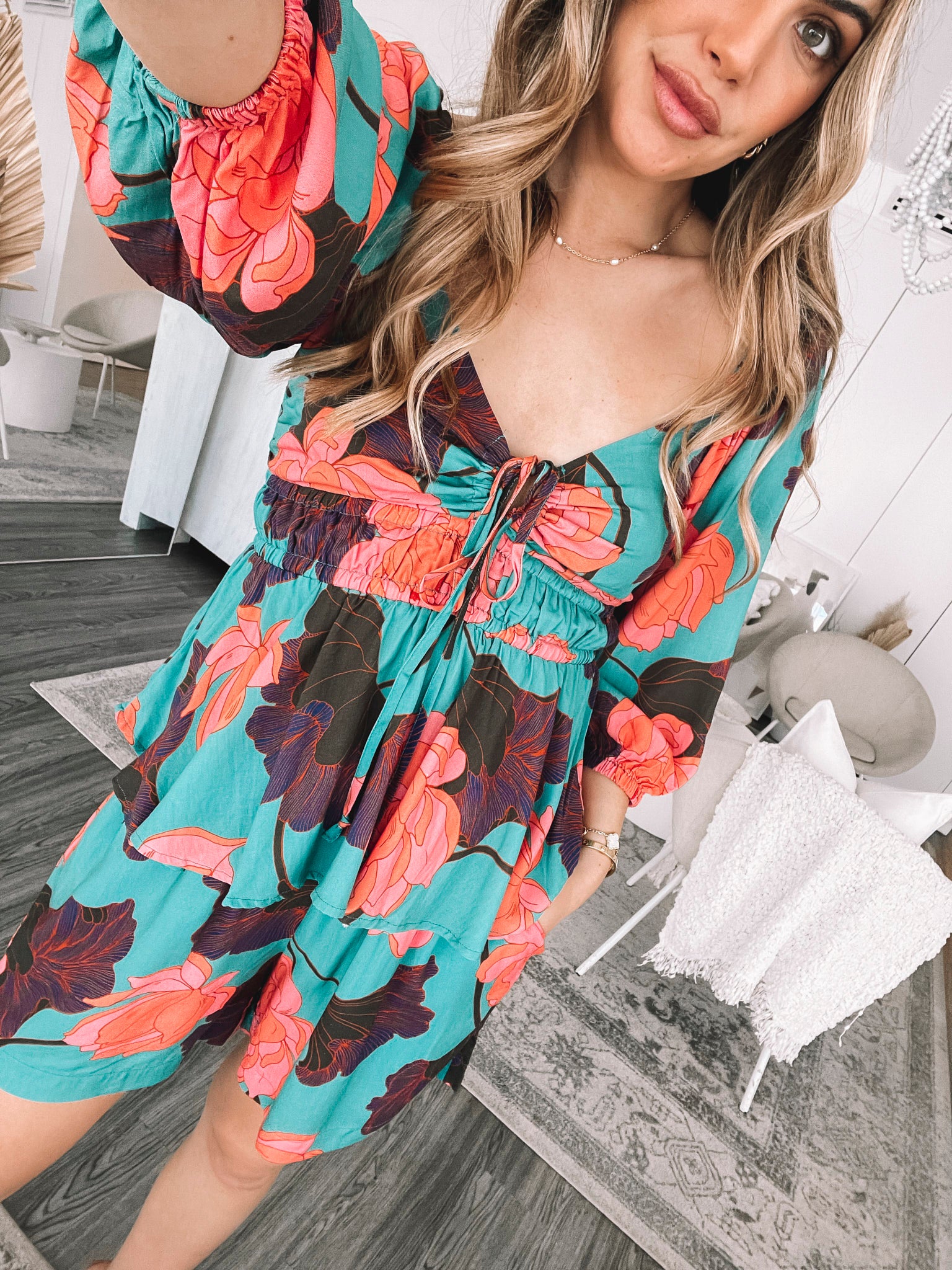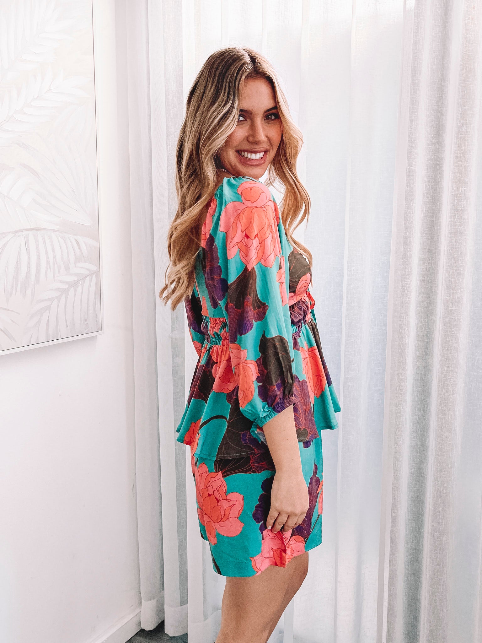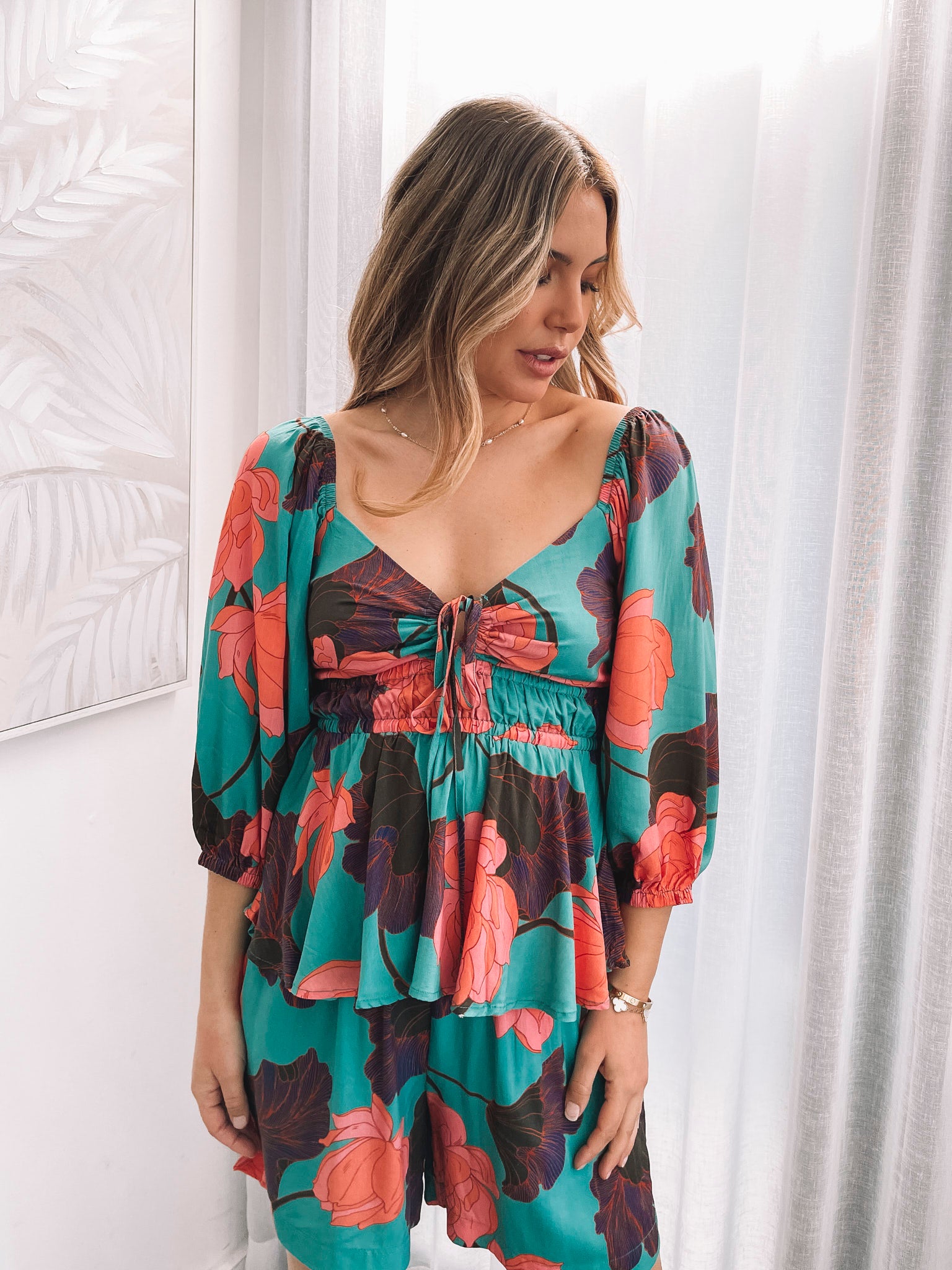 Our Conley Top comes in a botanical turquoise print. Offering you the right amount of magnificence, this piece is designed with a sweetheart neckline with cutout & string, short bubble sleeves and flowy peplum style. Complete the look with our Conell Shorts!