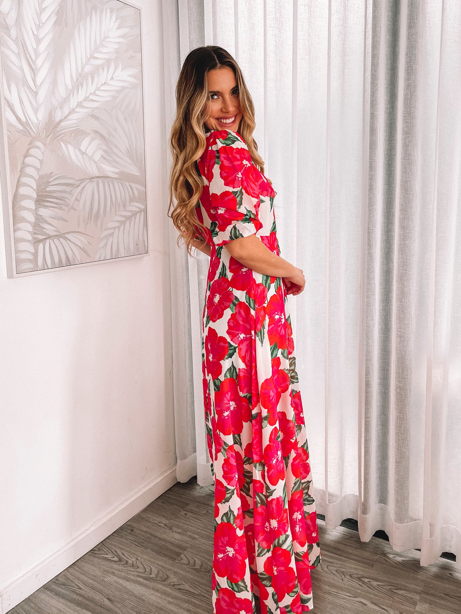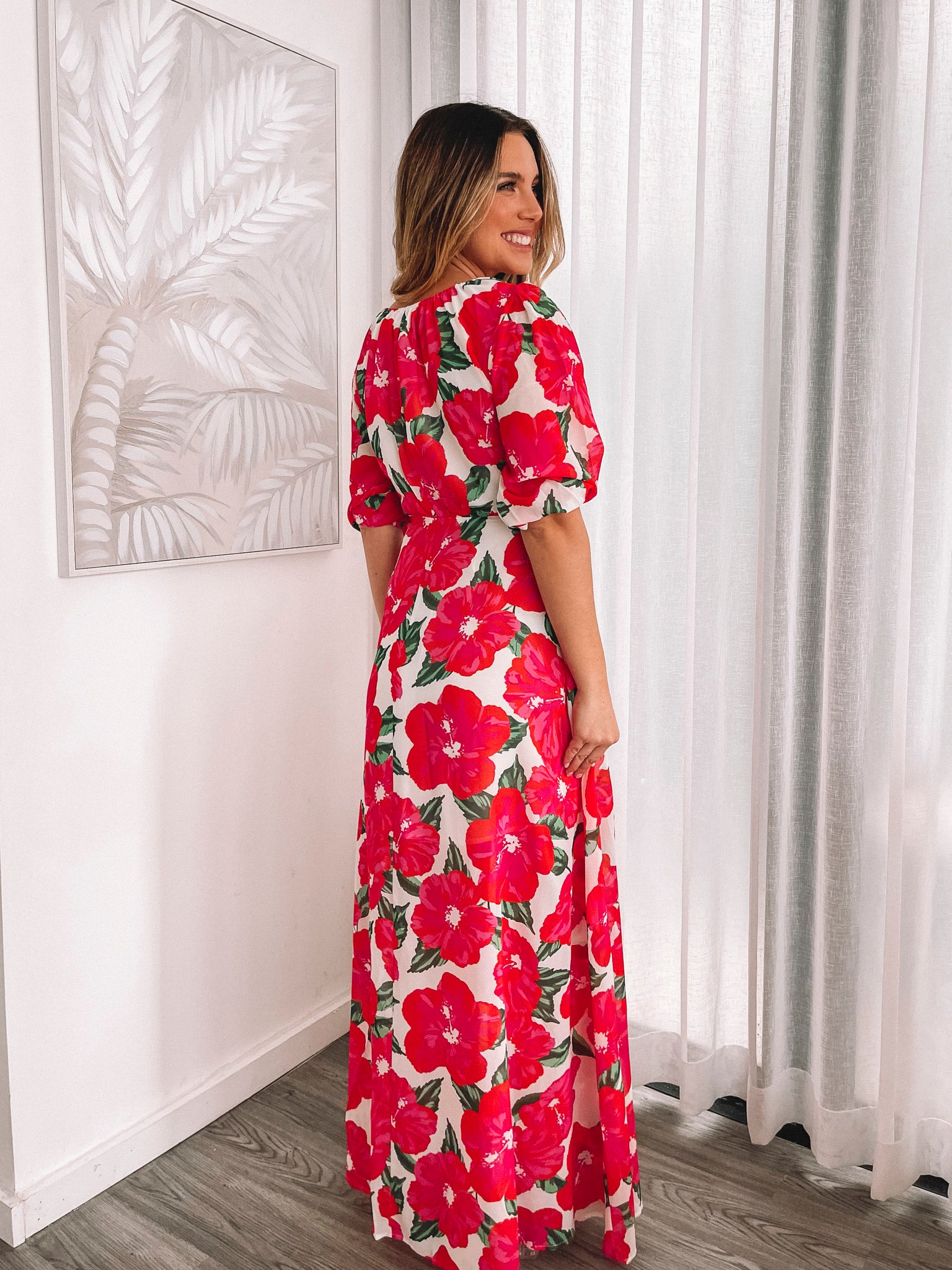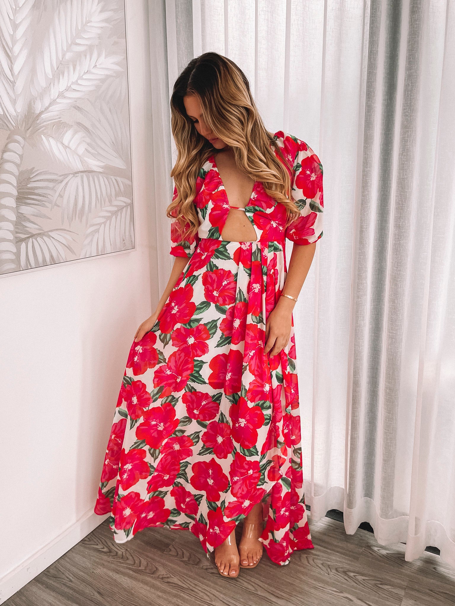 Our Delarina Dress comes in a white base with floral prints in pink colour. A feminine charm for your summer festivities, this maxi is designed with a v-neckline, cut out on the waist, puff sleeves and a-line skirt with a slit. Style with gladiator heels!