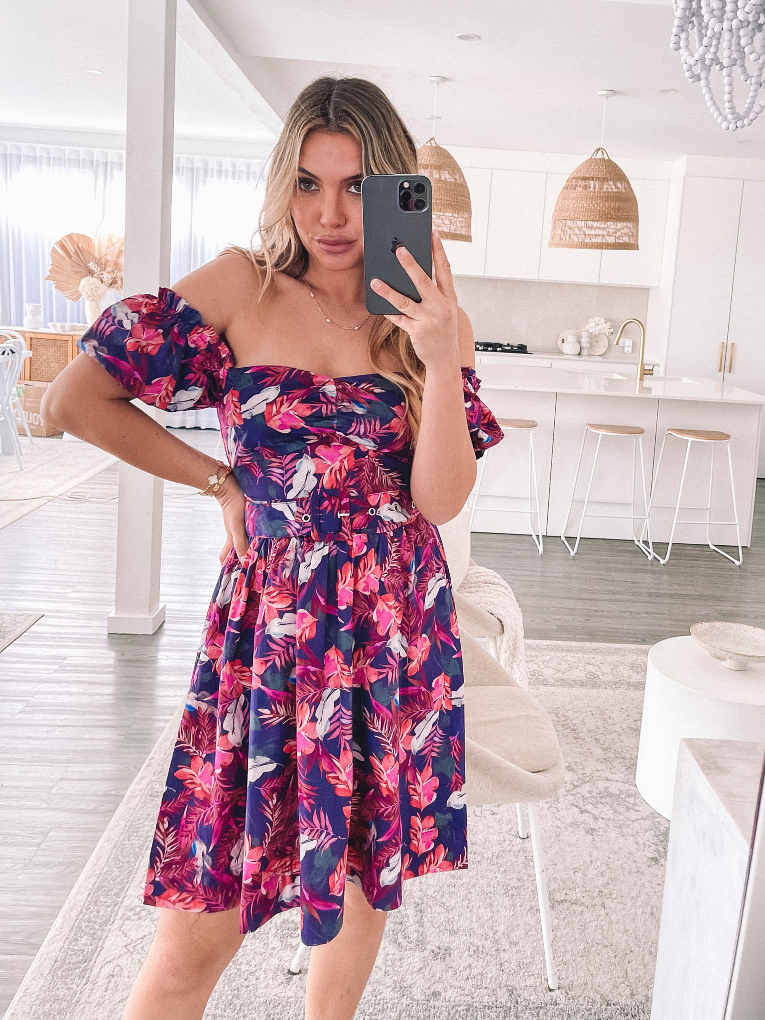 Our Devira Dress comes in a multicoloured print. A great spring style, this number is designed with an off shoulder neckline, short sleeves, waist belt and flowy skirt. Match with a classy clutch bag!