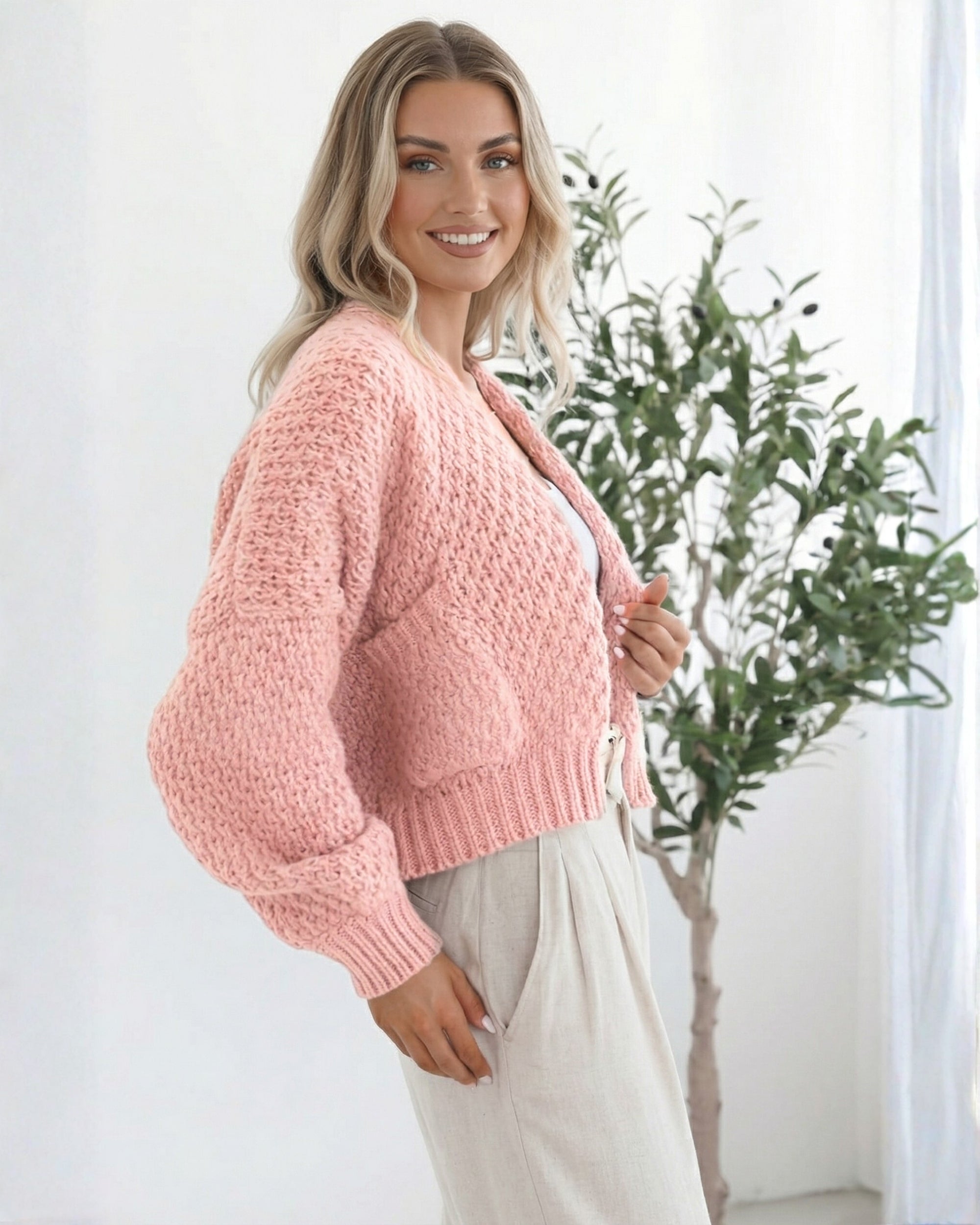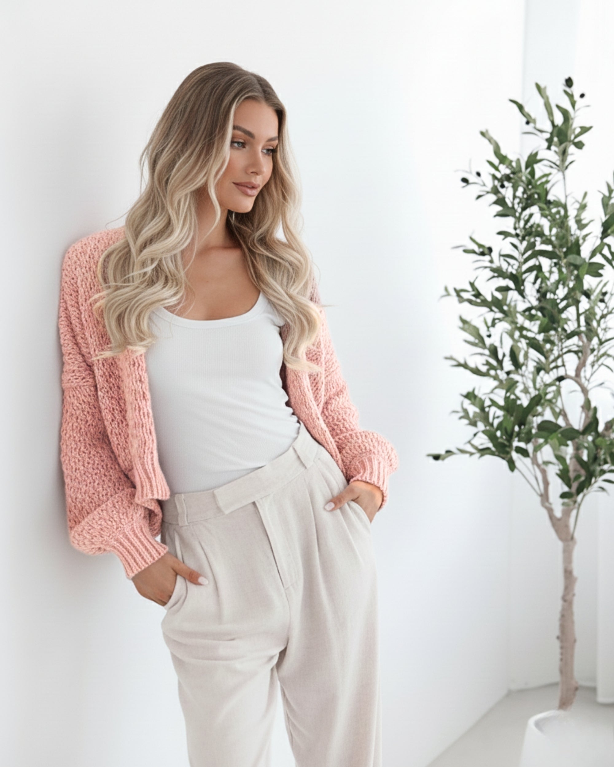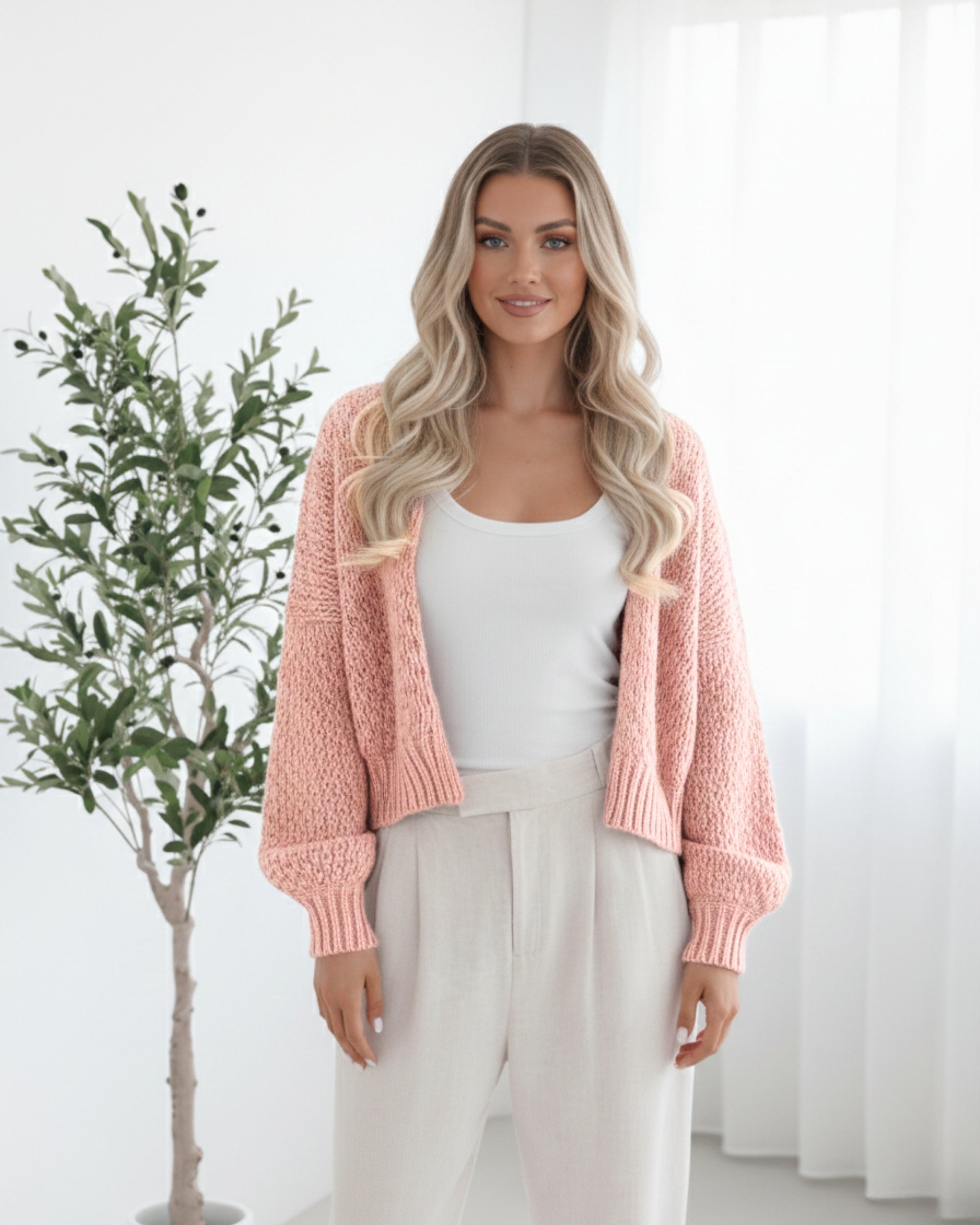 Embrace effortless style and dreamy softness with the Dorine Cardigan in beautiful Soft Pink. This must-have knitwear piece is designed to be your go-to layer, transitioning flawlessly from a chic daytime look to a cozy evening companion. The gorgeous chunky knit texture and soft pink hue add a perfect touch of feminine charm to any outfit.