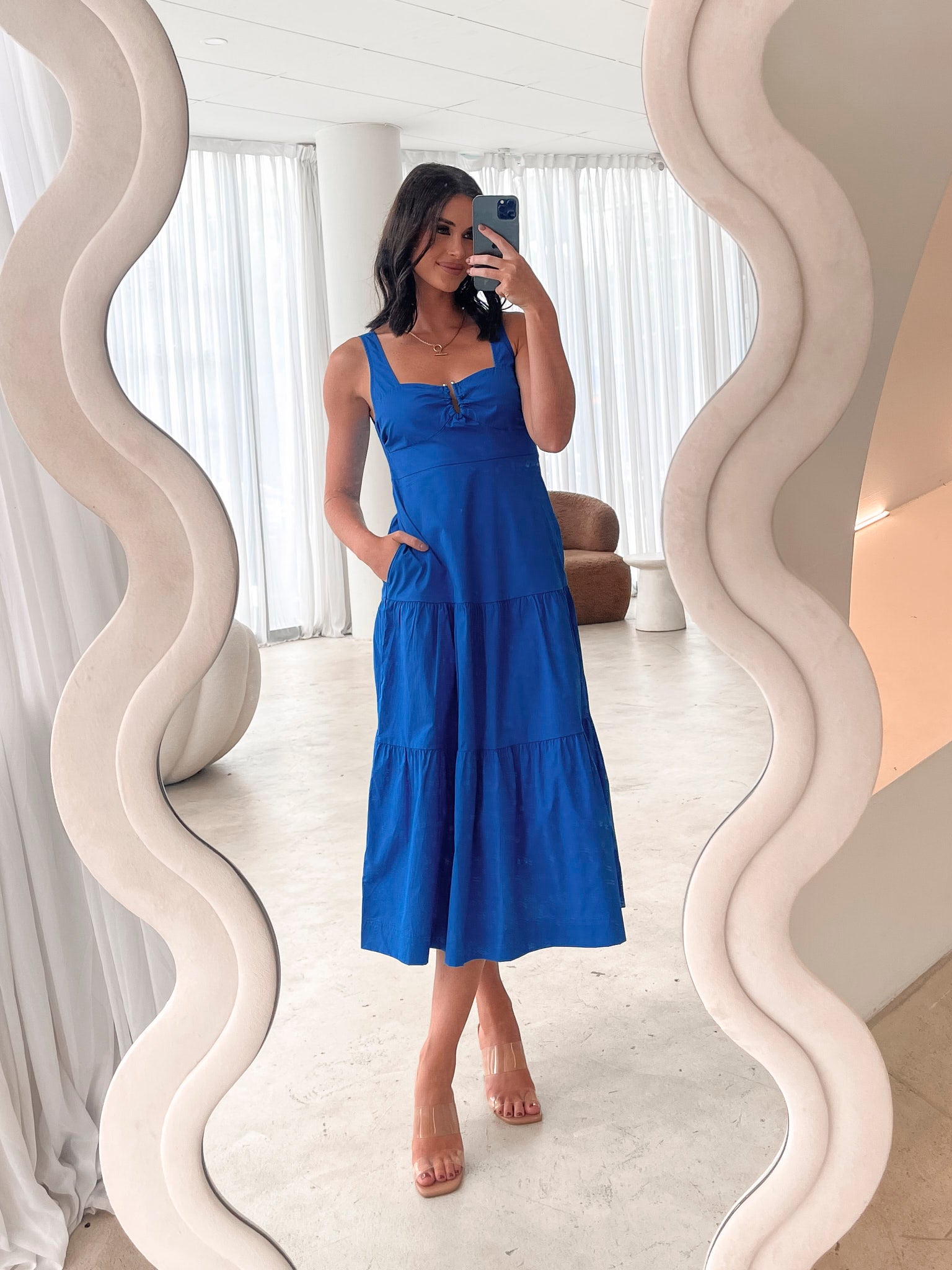 Our Eline Dress comes in a cobalt blue colour. A pop of drama that will excite you, this piece is designed with a sweetheart neckline with a metal u ring, flowy tiered skirt and midaxi length hem. Be the prettiest in the room with a hair accessory and high heels!