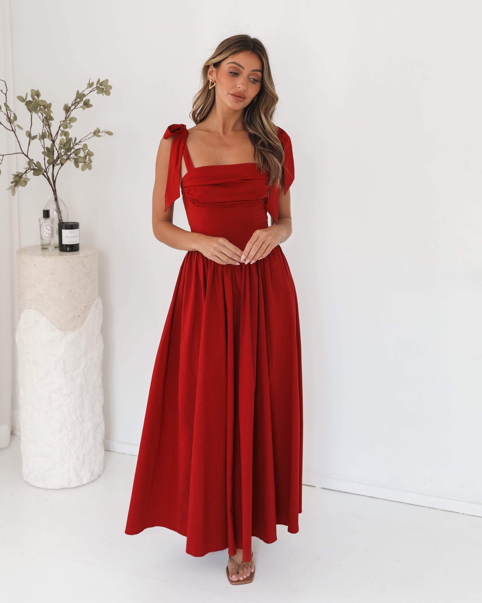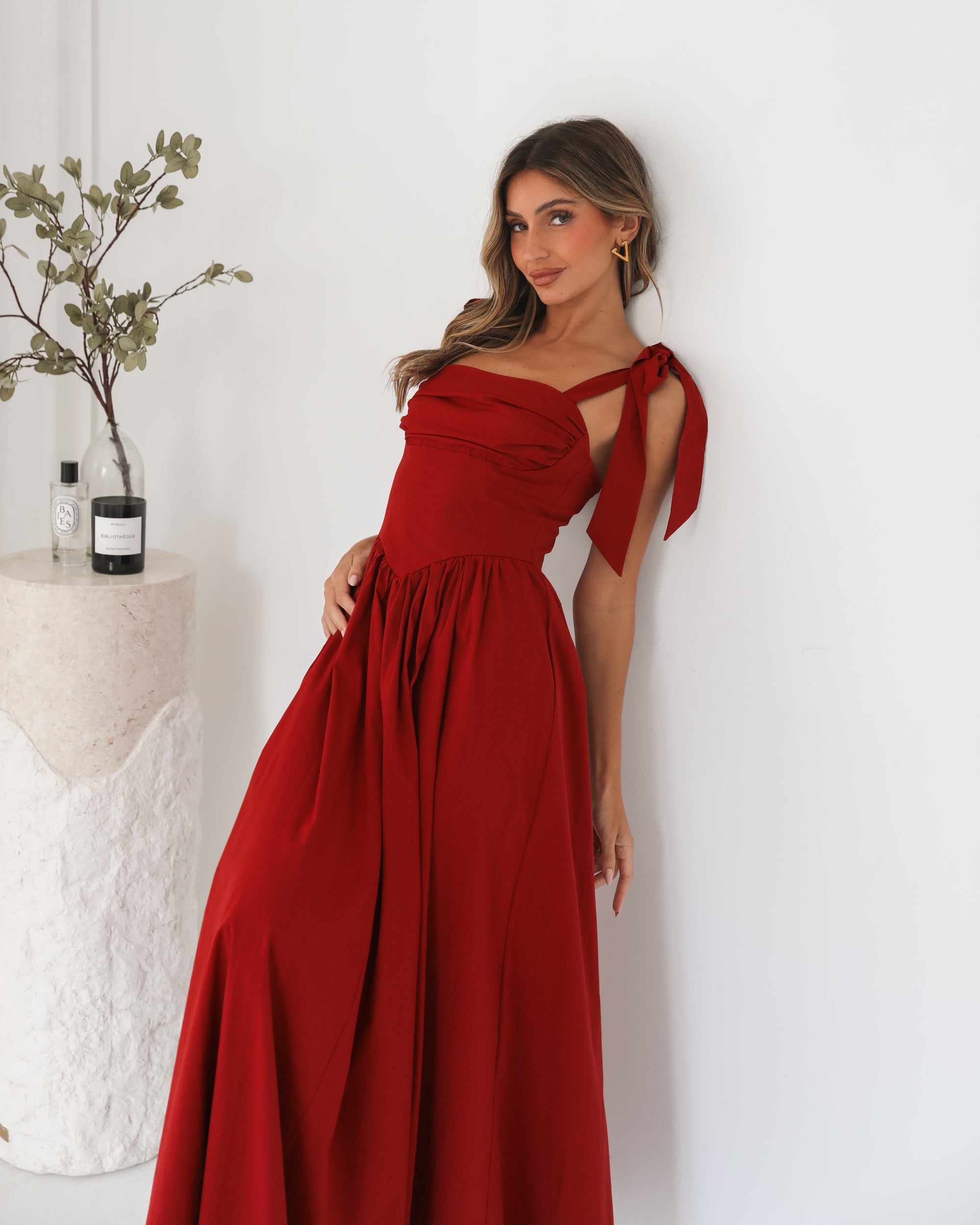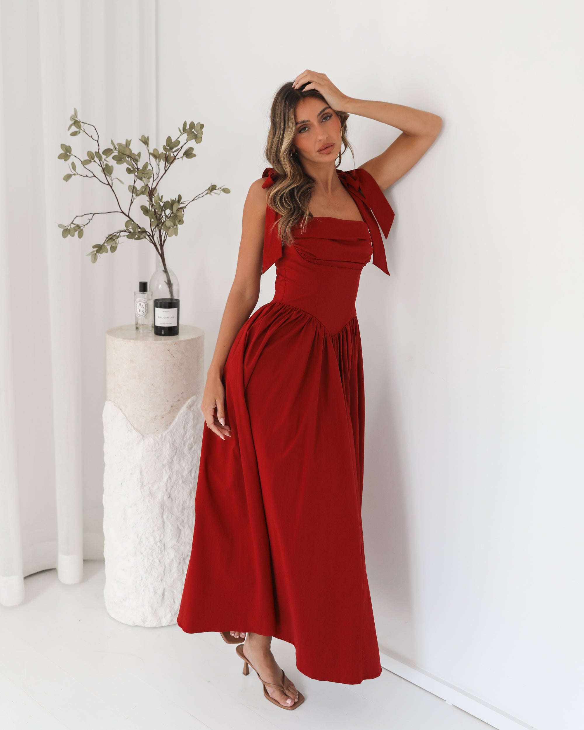 Our Elvianne Dress comes in a wine red colour. Your moment in motion, this number is designed with self tie straps, ruching on bust, full skirt and midaxi length hem. Ensure all eyes are on you with lace-up sandals and gold accessories!