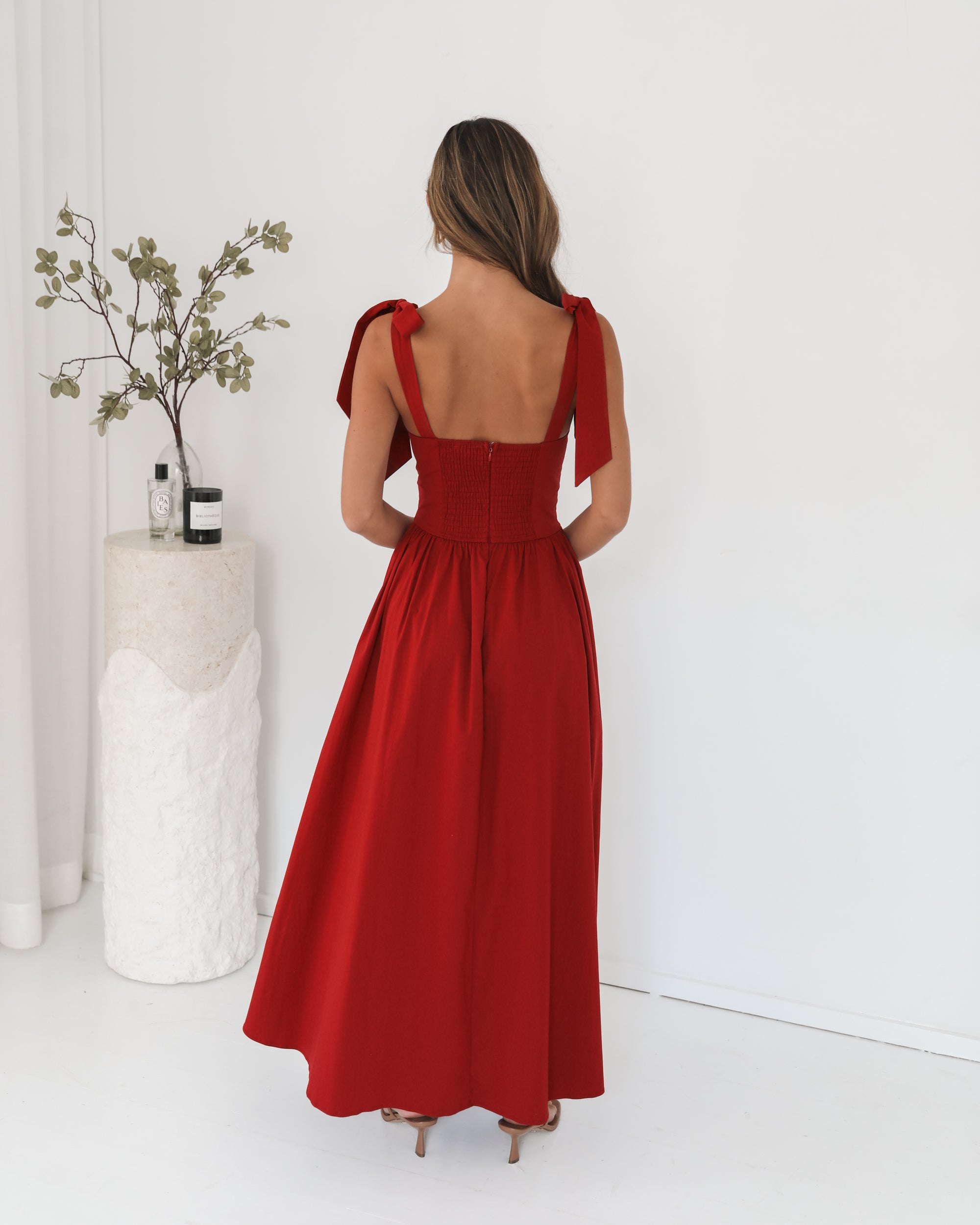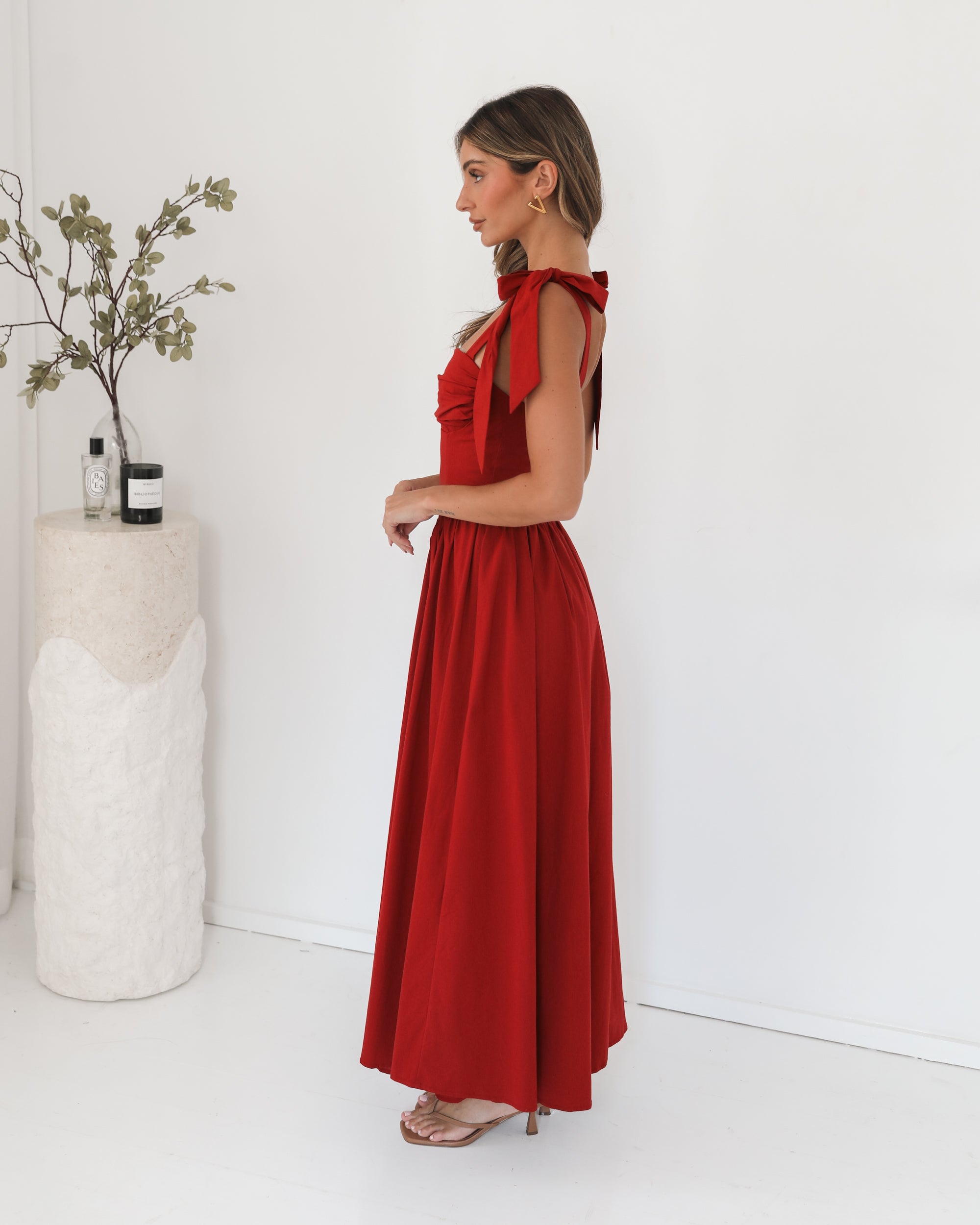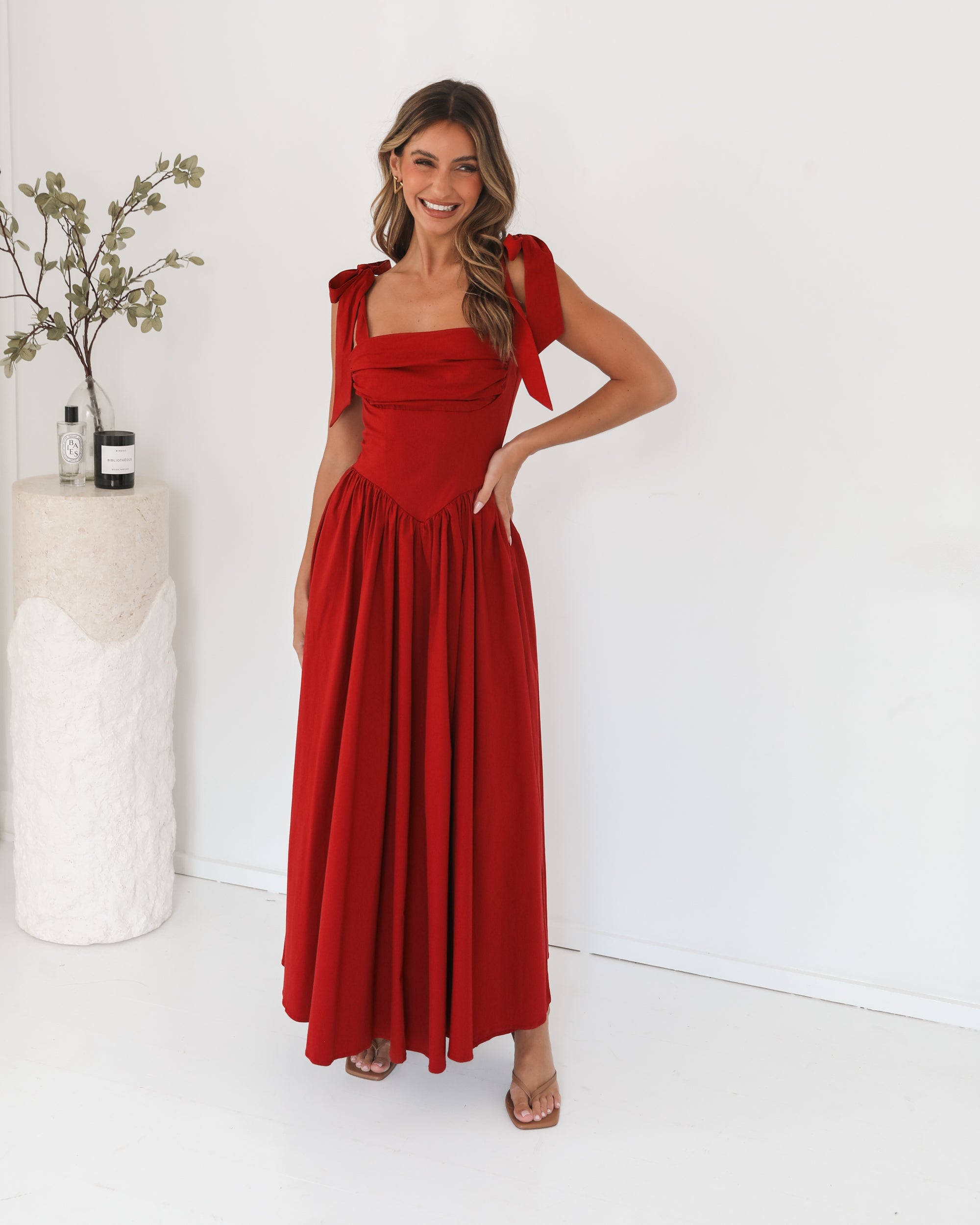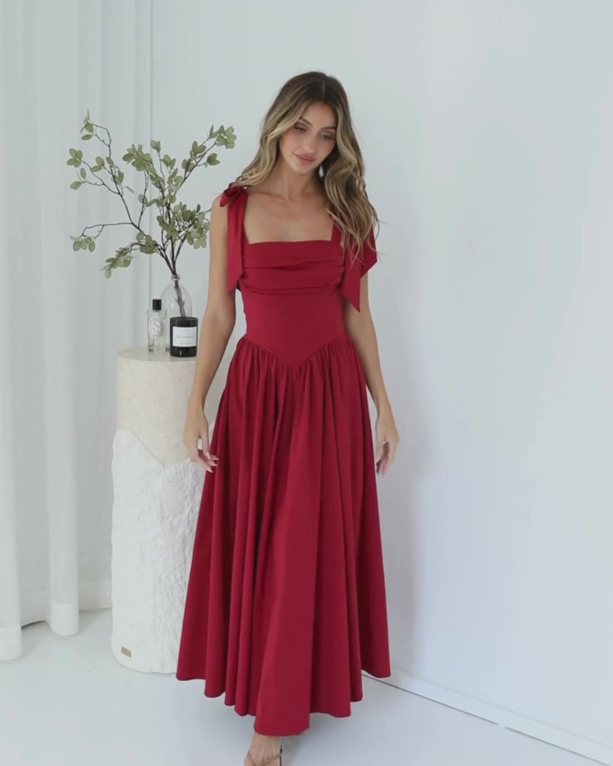 Our Elvianne Dress comes in a wine red colour. Your moment in motion, this number is designed with self tie straps, ruching on bust, full skirt and midaxi length hem. Ensure all eyes are on you with lace-up sandals and gold accessories!