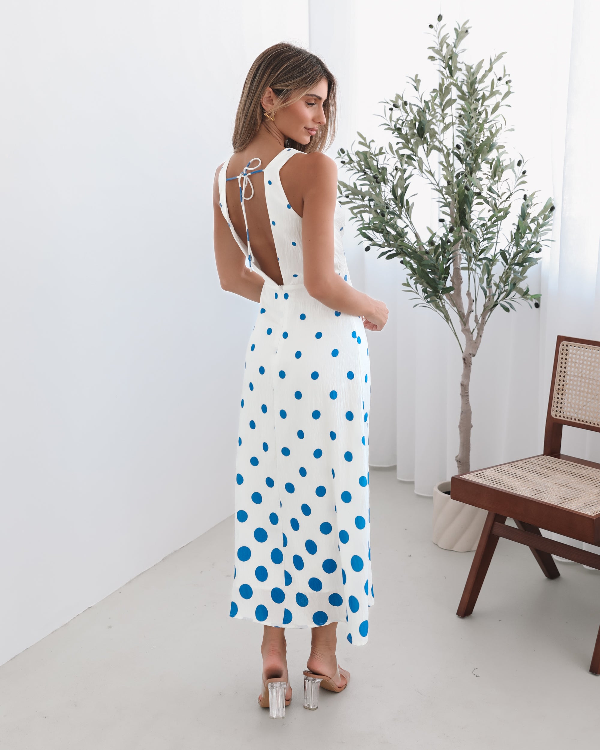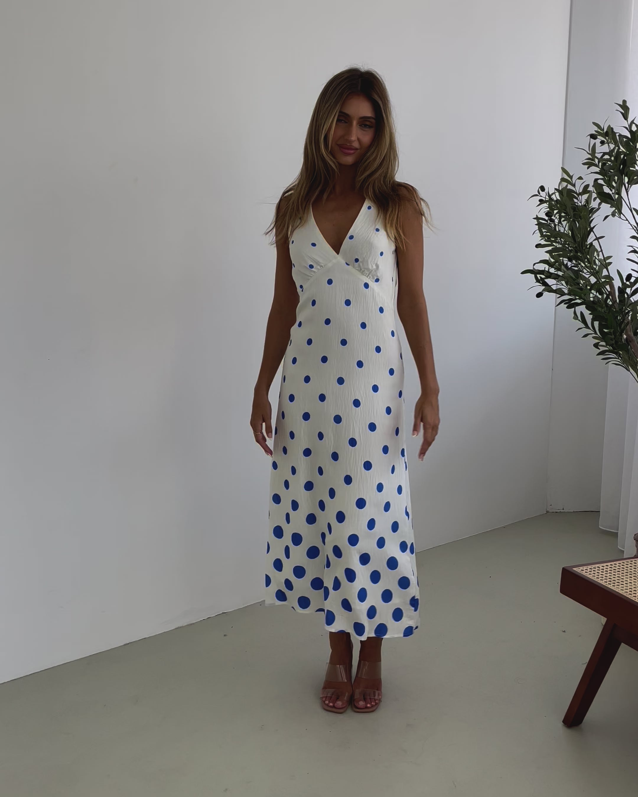 Our Fiorenza Dress comes in white and blue tones. Dripping in effortless luxury, this showstopper features a low v-neckline, fit to flare silhouette and midaxi length hem. For evening elegance, style it with strappy champagne heels and crystal drop earrings!