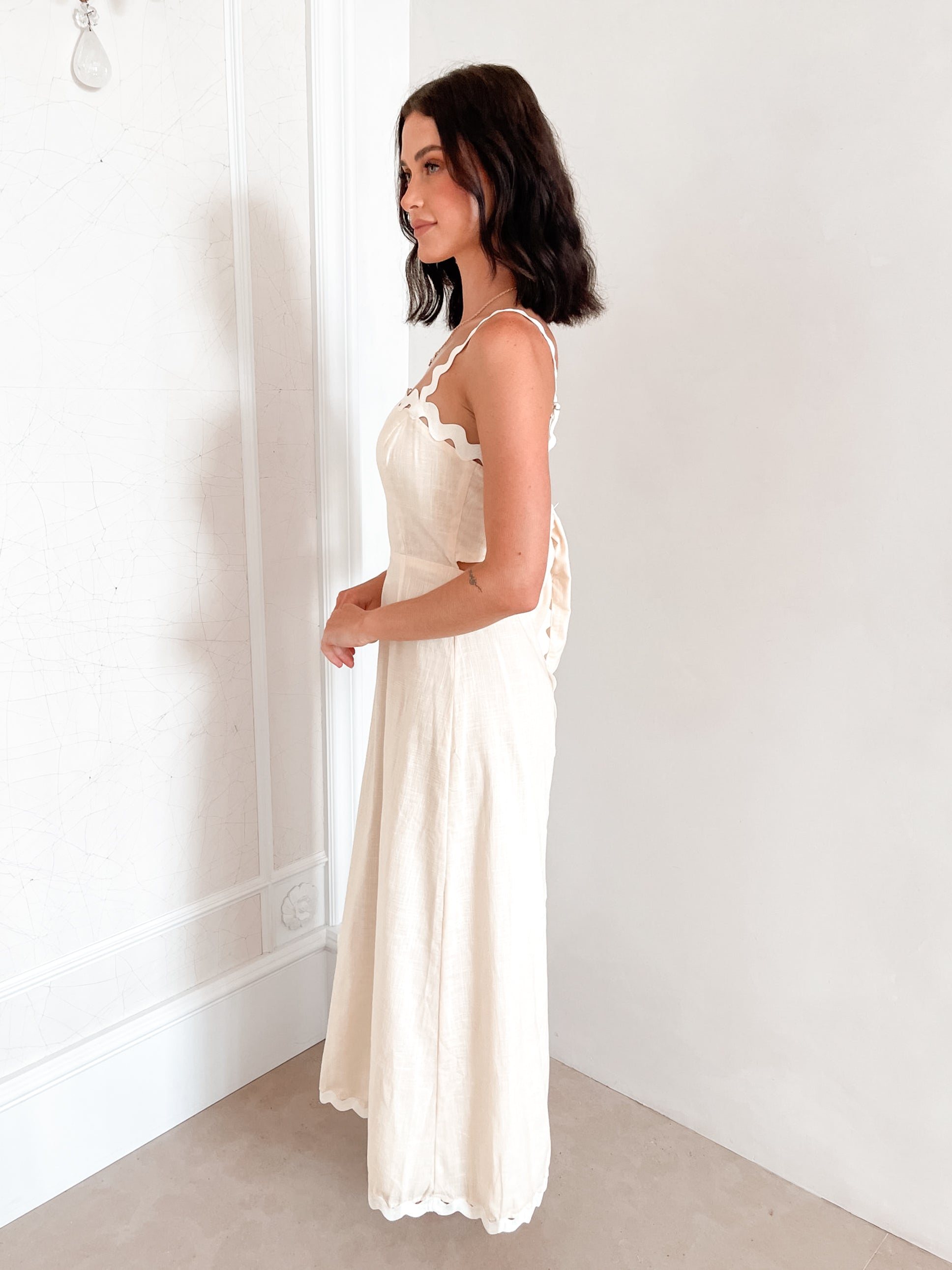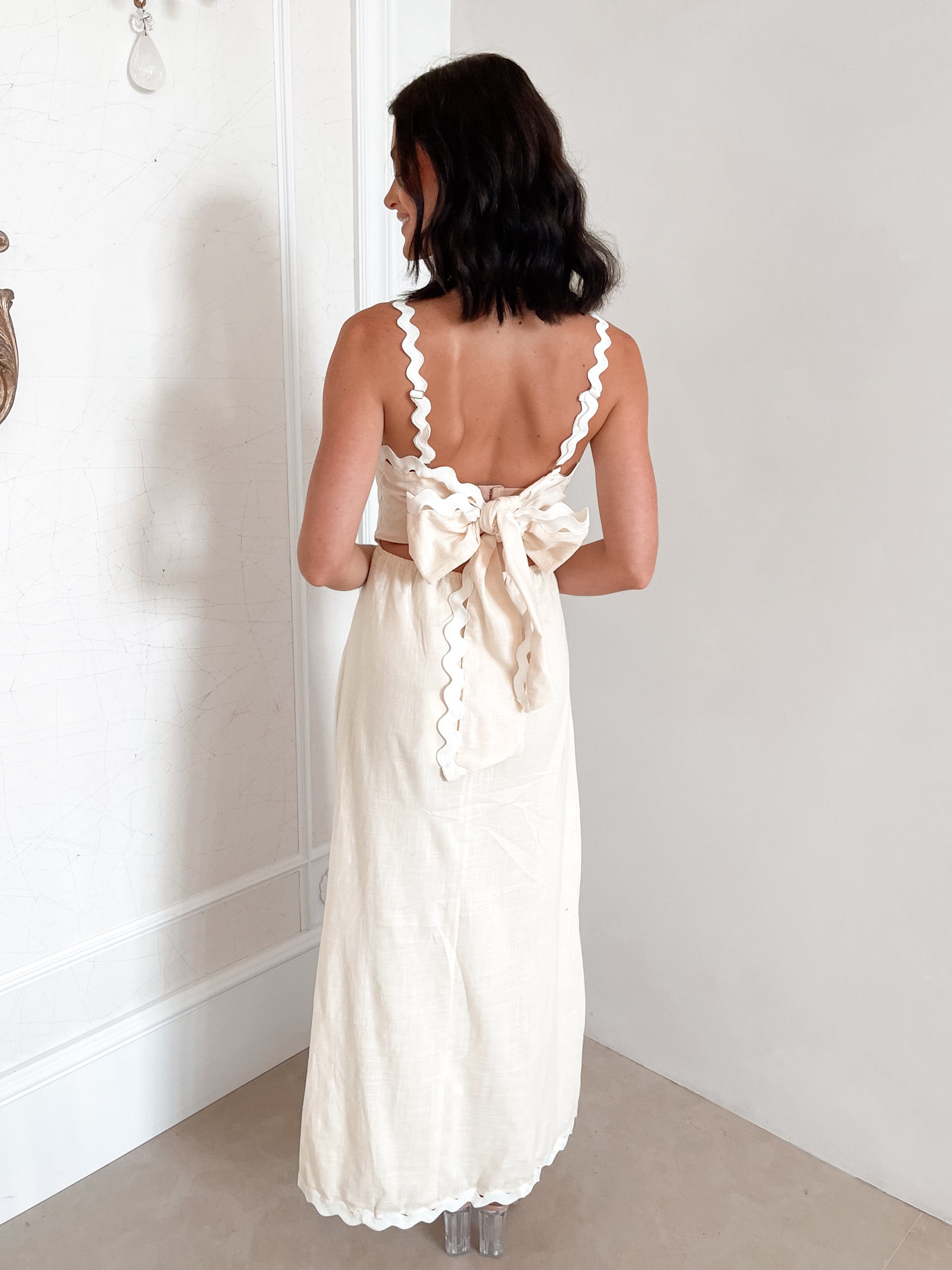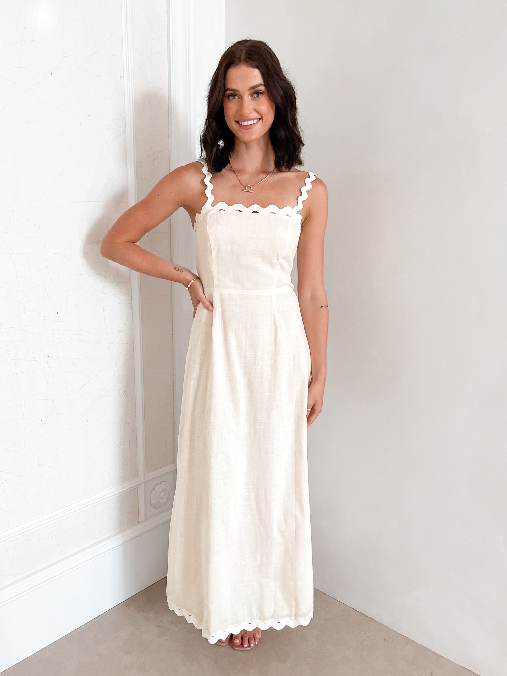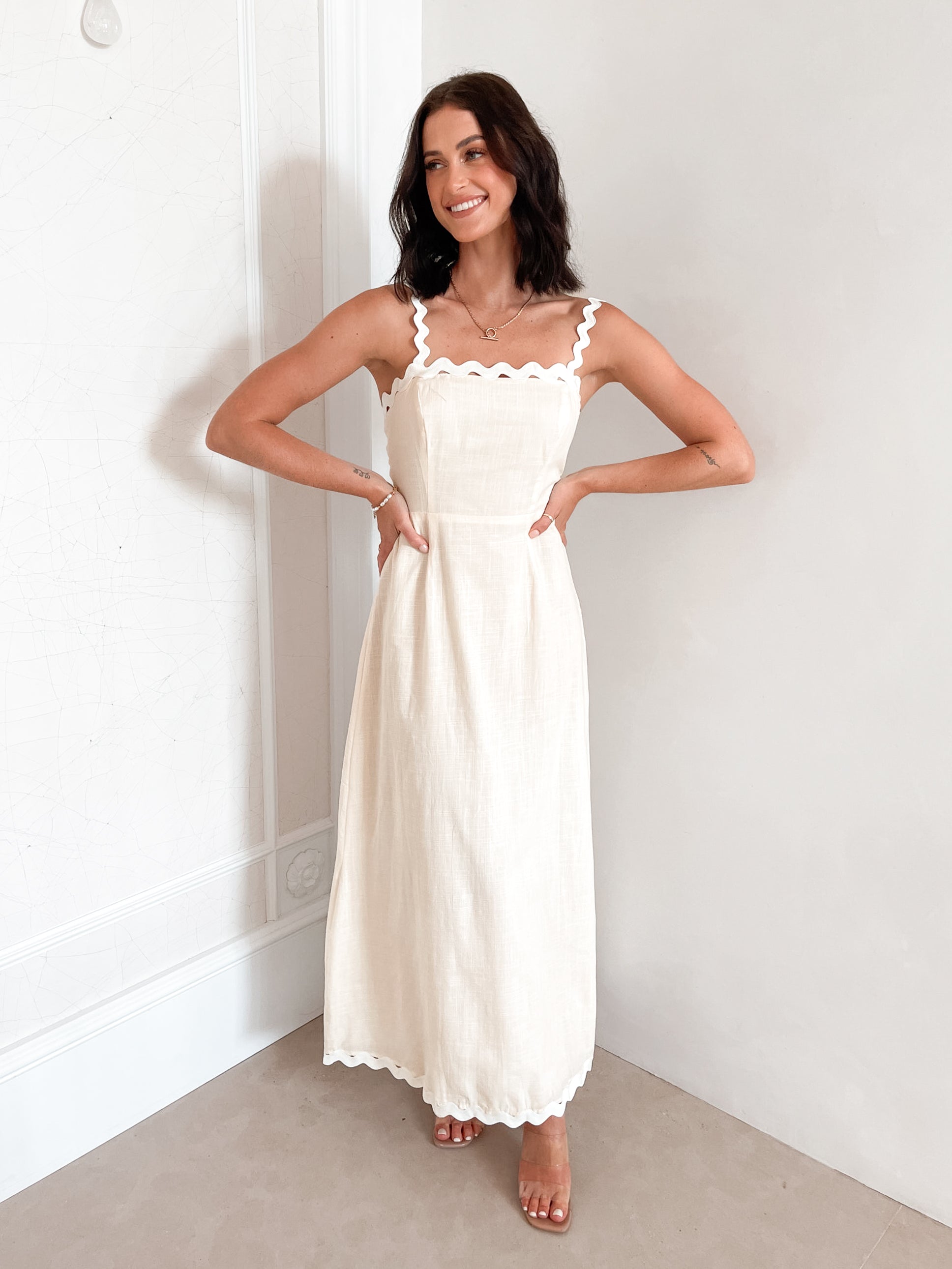 Our Gylfie Dress comes in an oat colour. Your new secret weapon for laid-back luxury, this piece is designed with a square neckline, semi-relaxed skirt and maxi length hem. Look extra sophisticated with classic heels!