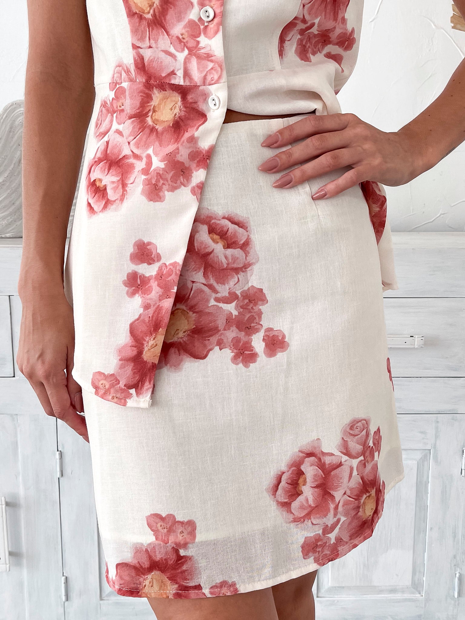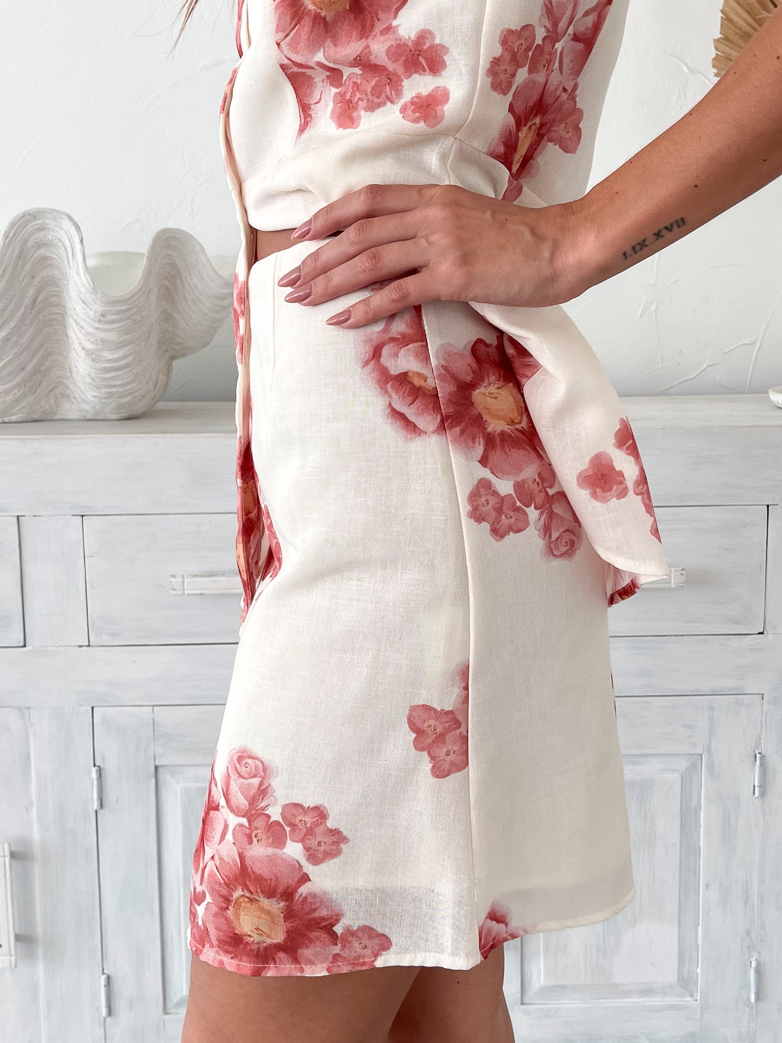 Our Harleigh Skirt comes in a cream base with red floral patterns. This piece featuring a high waist fit, a-line silhouette and mini length hem is a girly staple that’s perfect for picnics, weekend getaways, or wherever your day takes you. Complete your look with our Harleigh Top!