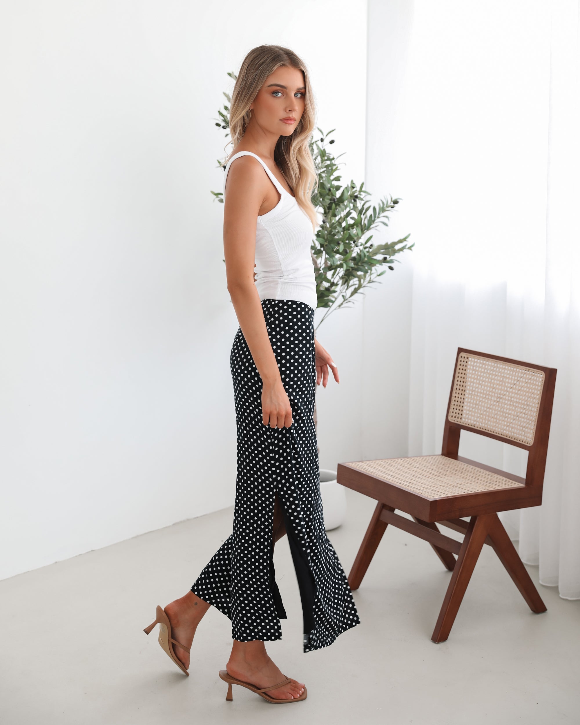 - Key Features: High-waisted. Flared silhouette. Side slit. Midaxi length hem.