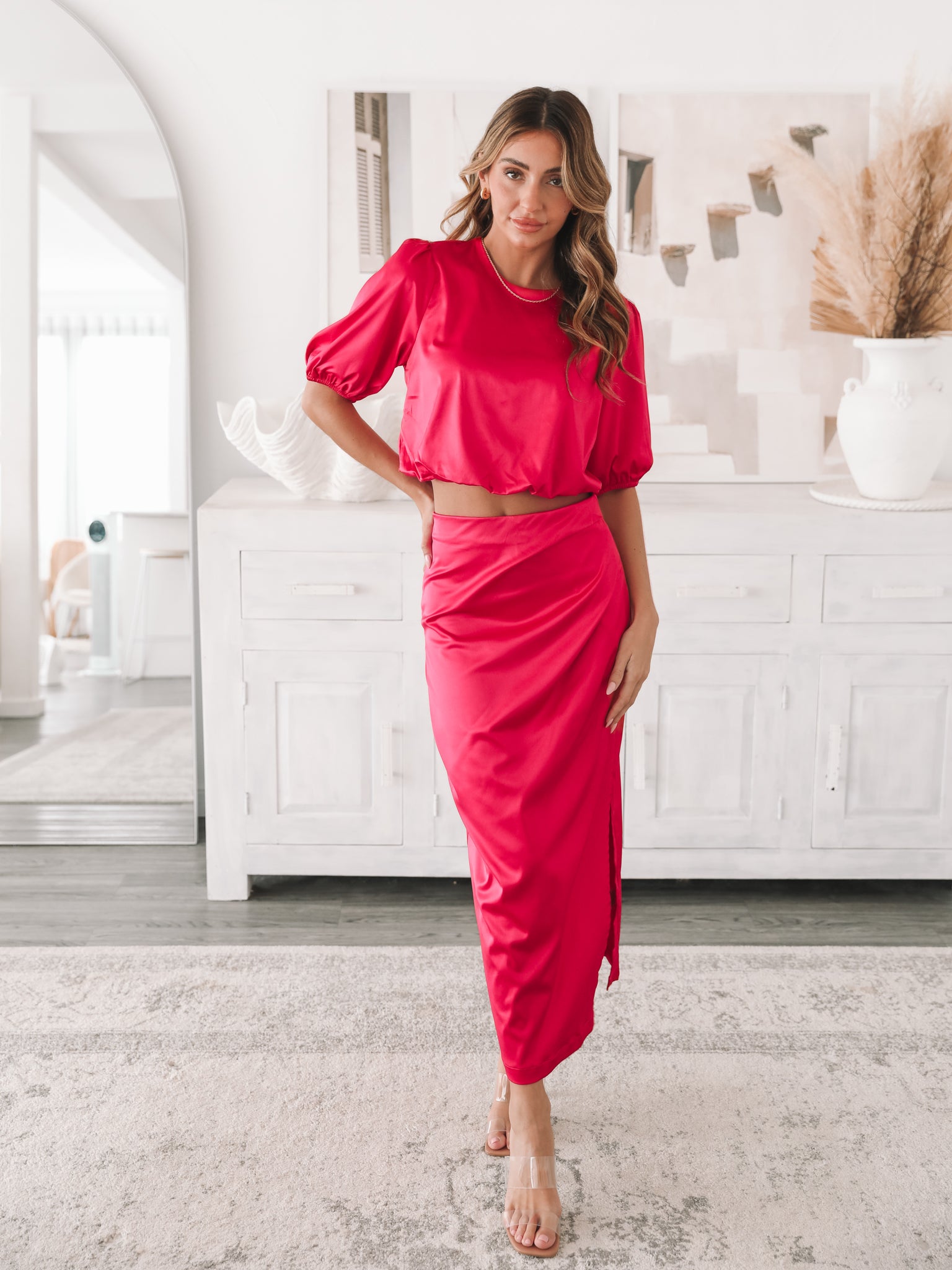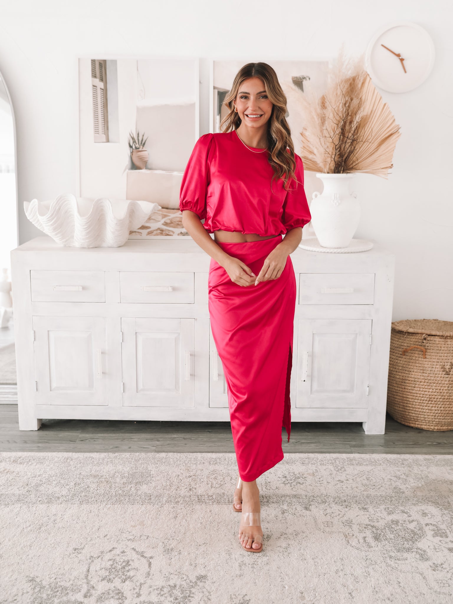 Our Kerize Top comes in a hot pink colour. Feel like a million bucks in this top that features a round neckline, short puff sleeves and crop length hem. Complete the look with our Krissa Skirt!