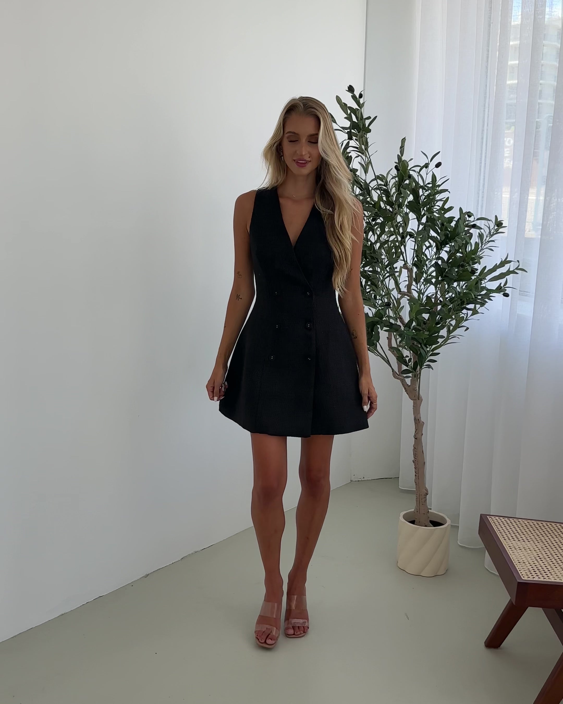 Our Laurenza Dress comes in a black colour. A statement of confidence wrapped in effortless elegance, this piece is designed with a v-neckline, buttons on waist, pleated skirt and mini length hem. Pair with strappy stilettos for a leg-lengthening effect!