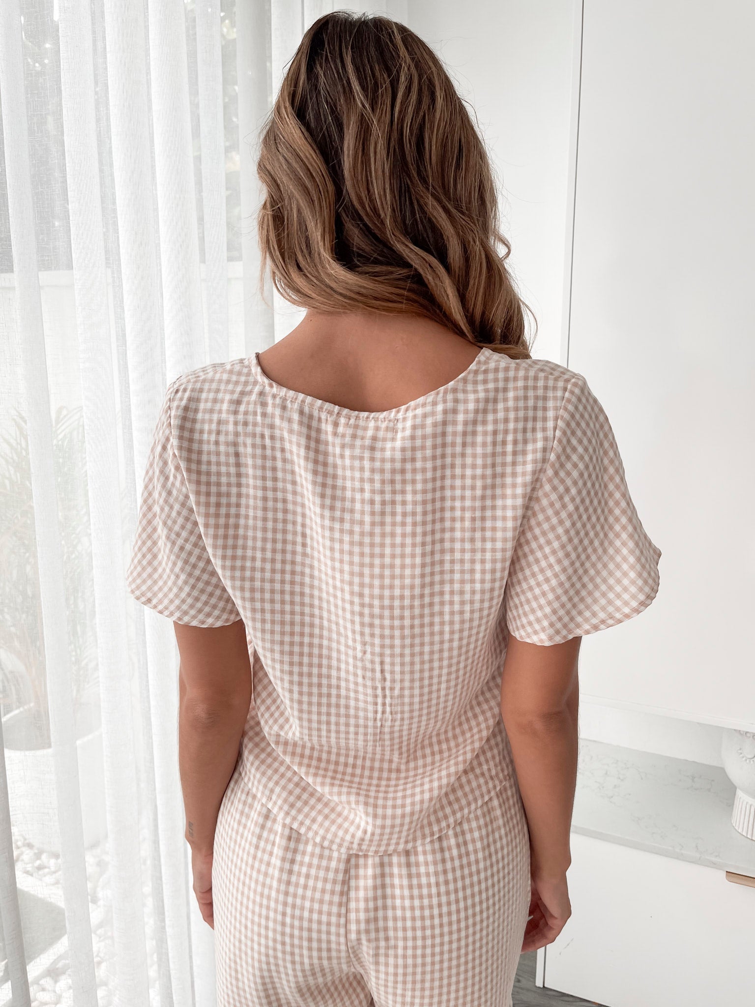 Our Lyricia Top comes in beige and white. Reimagined with a modern flair, this piece is designed with a v-neckline, short sleeves, front tie closure and crop length hem. Complete your look with the Lyricia Shorts!