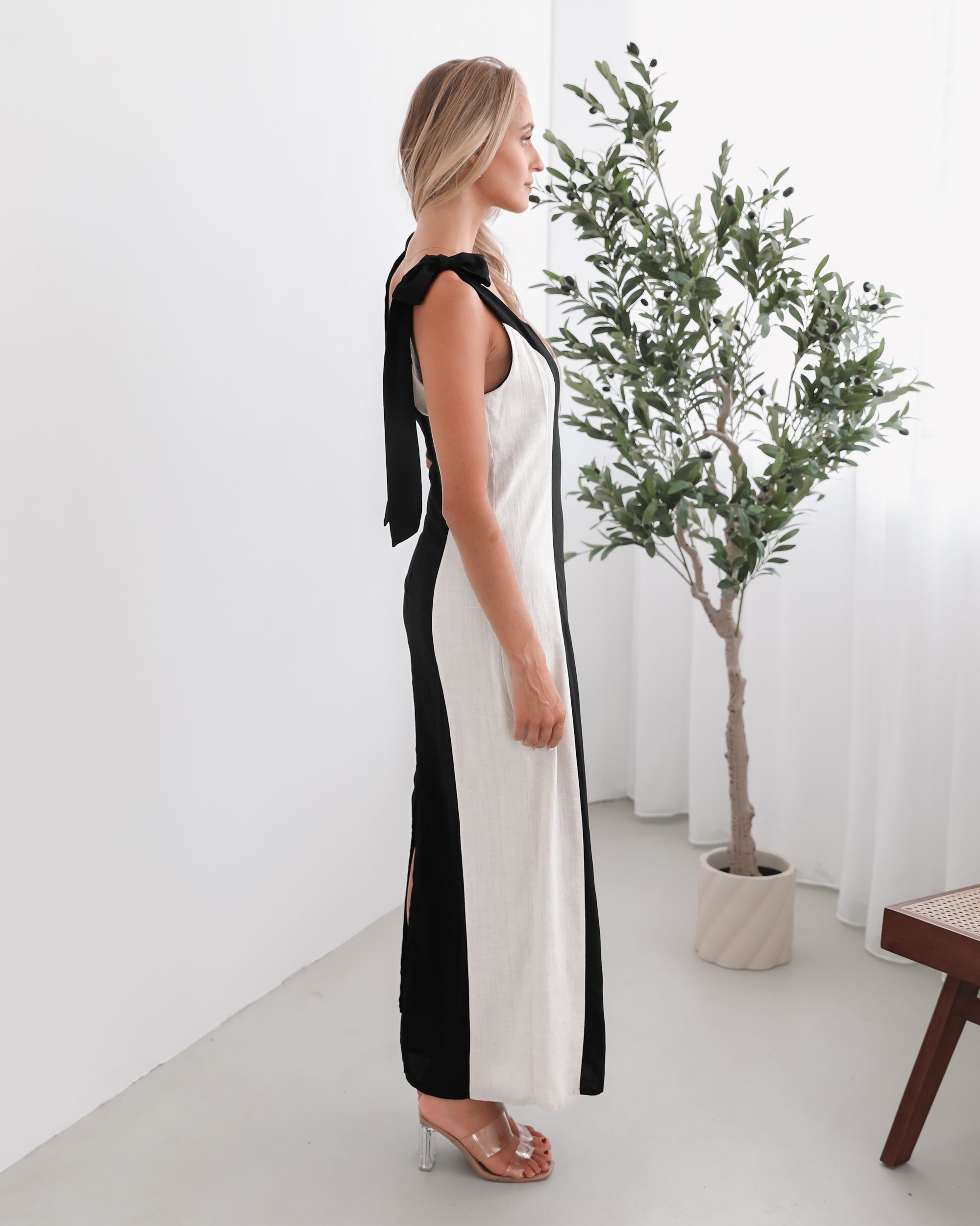 Our Morticia Dress comes in black and beige tones. Dare to embrace the dark romance of this number that features a fit and flare silhouette, scoop neckline, self-tie straps and maxi length hem. Keep it effortlessly cool with block heels and a leather jacket!