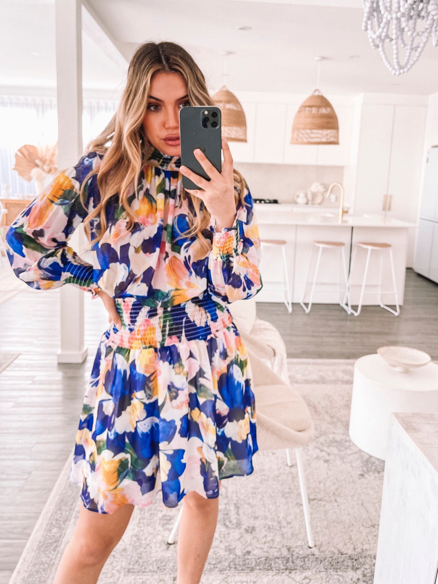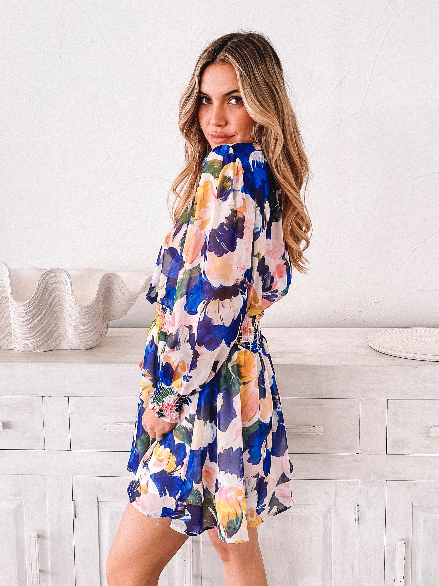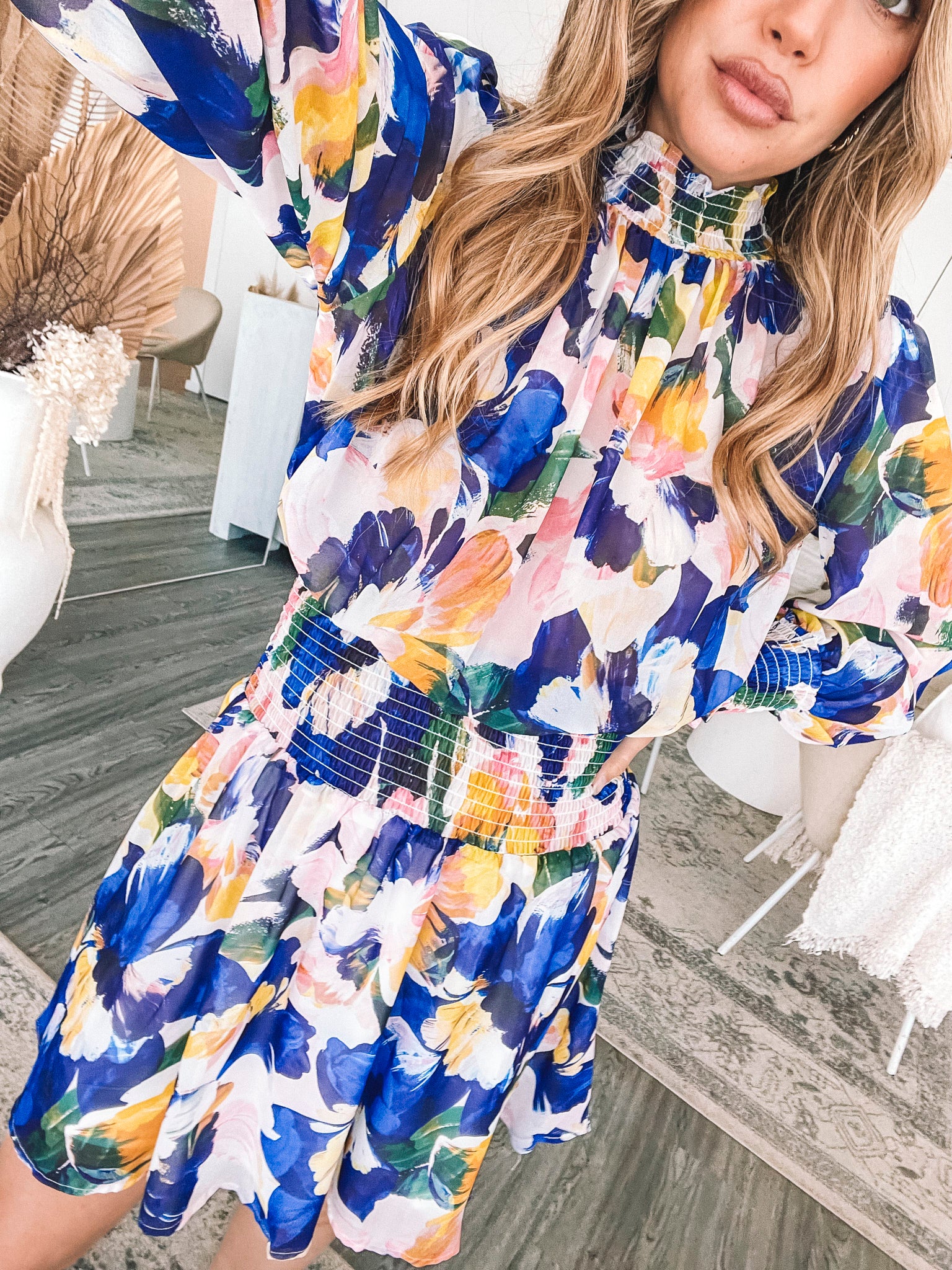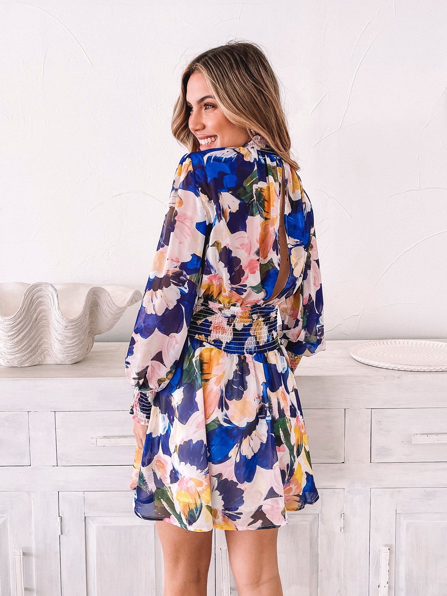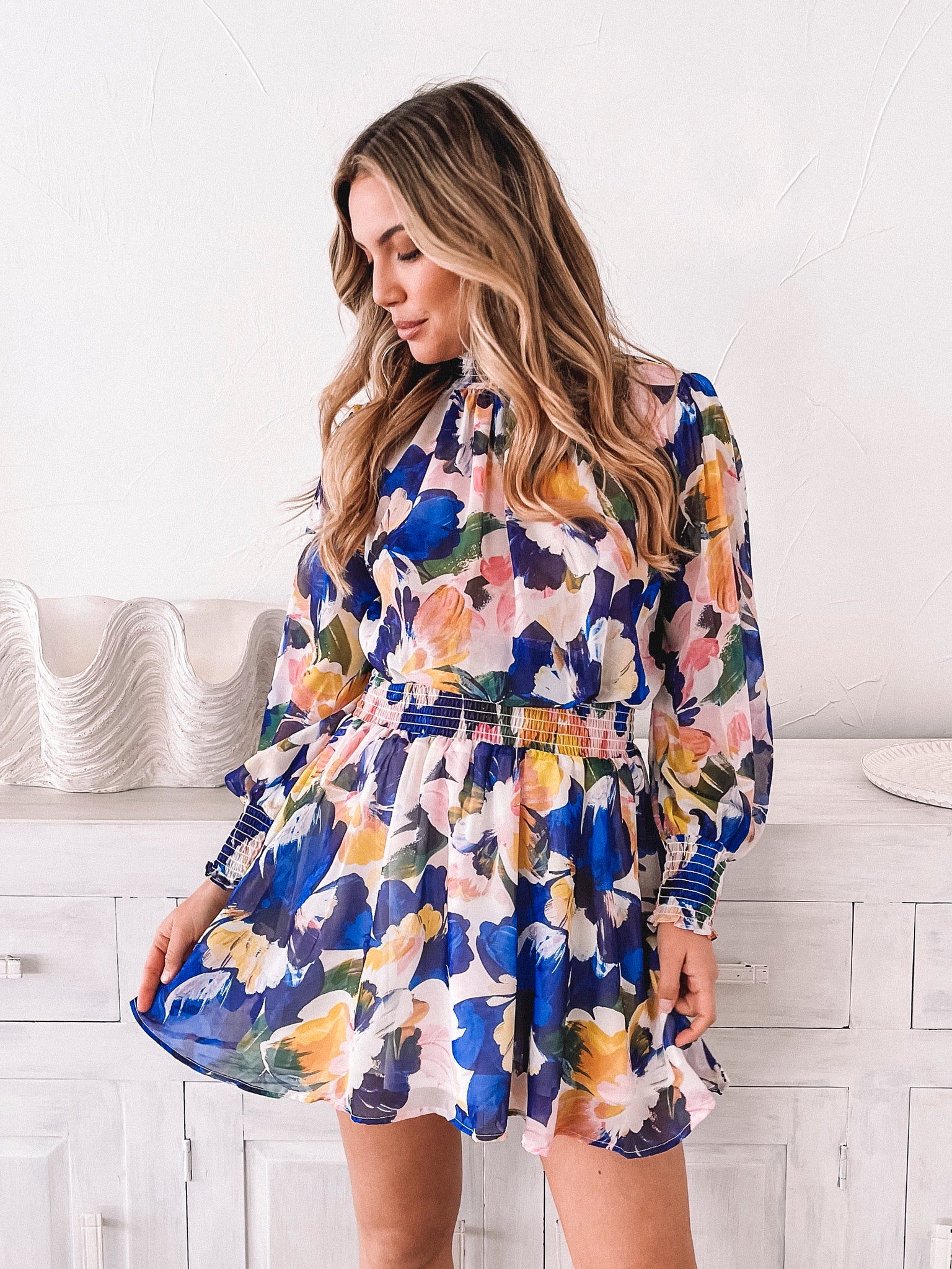 Our Neary Dress comes in a painted cobalt print. Indulge in an ultimate fashion experience with this number that features a high neckline, long sleeves with smocking on cuffs, gathered detailing and mini length. Look extra stylish with platform heels and diamond accessories!