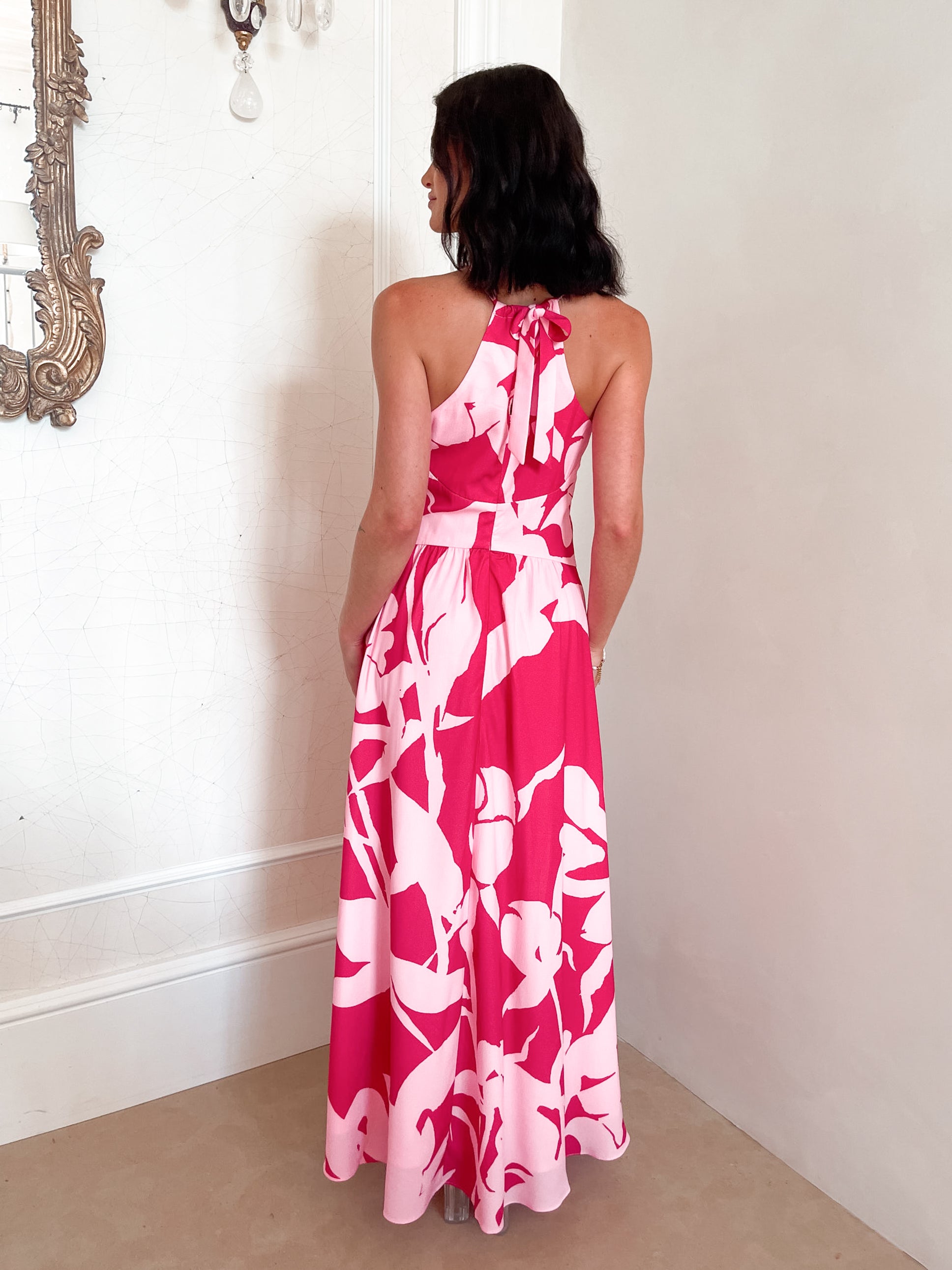 Our Nyra Dress comes in shades of red and pink. A declaration of style and confidence, this piece is designed with a halter neckline, flowy skirt and maxi length hem. Walk through a field of compliments with strappy slip on heels!