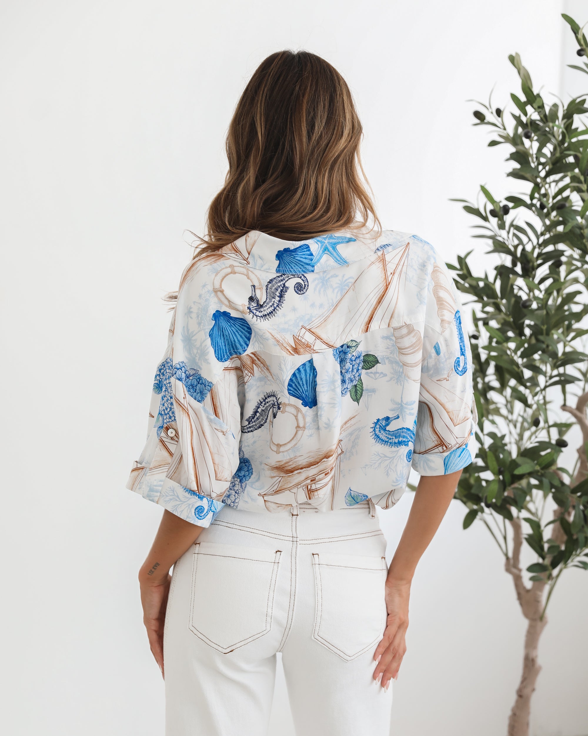 Our Pasheena Shirt comes in a white base with multicoloured prints. Blending classic tailoring with a modern edge, this top features a collar, centre-front buttons, bust pockets and elbow length sleeves. Style it with a pleated midi skirt, ballet flats, and pearl accessories for a soft, elegant ensemble!
