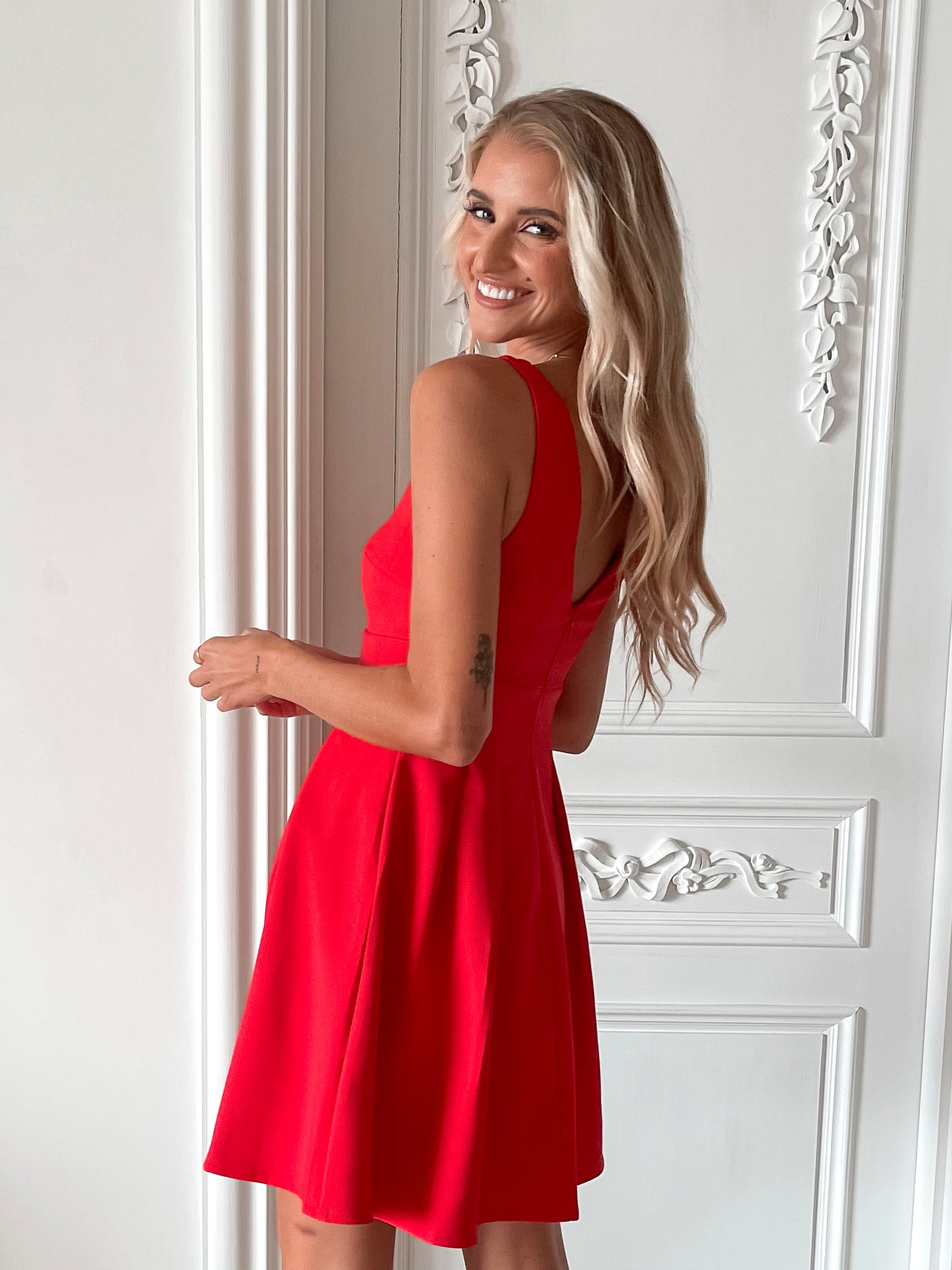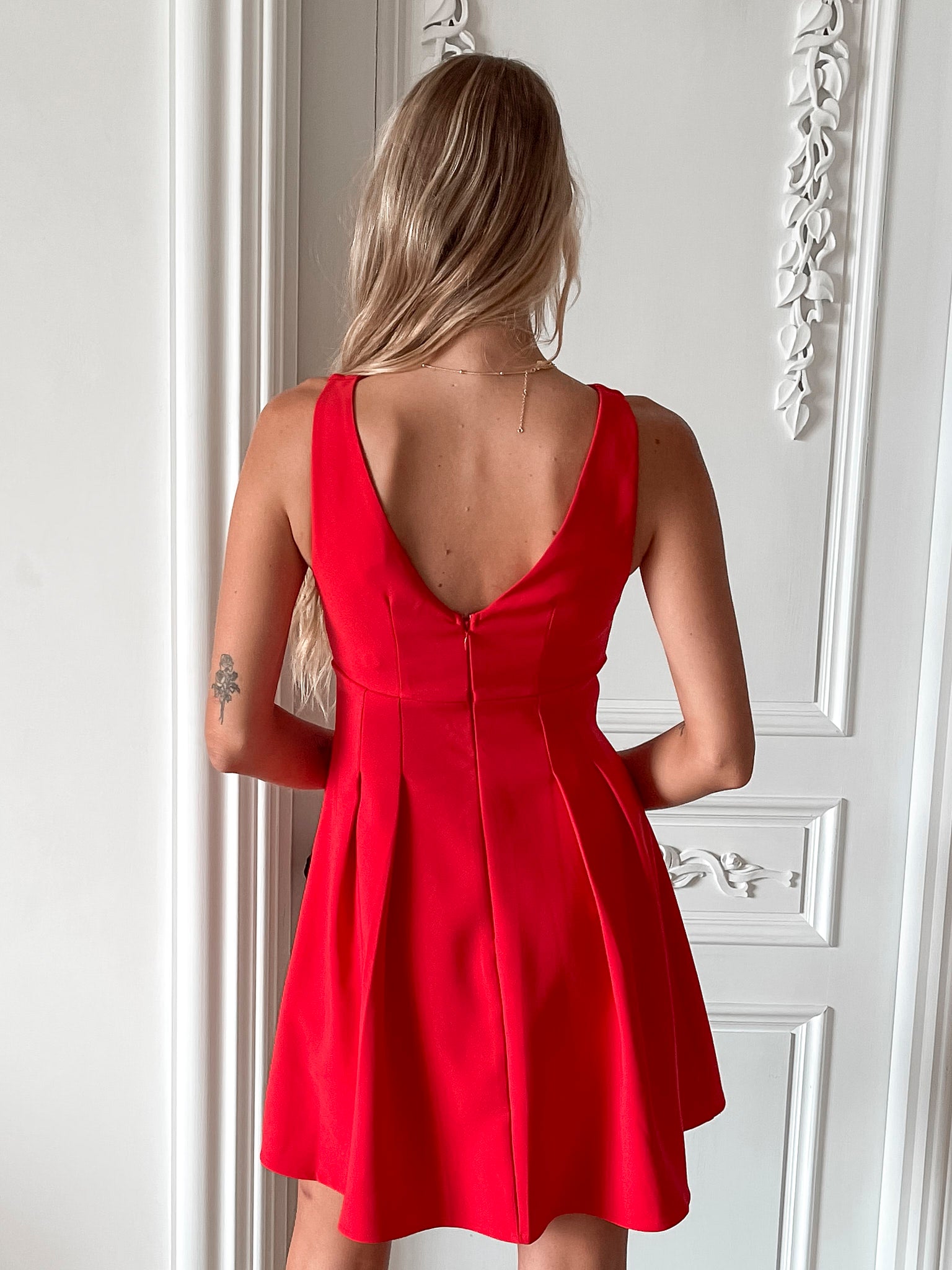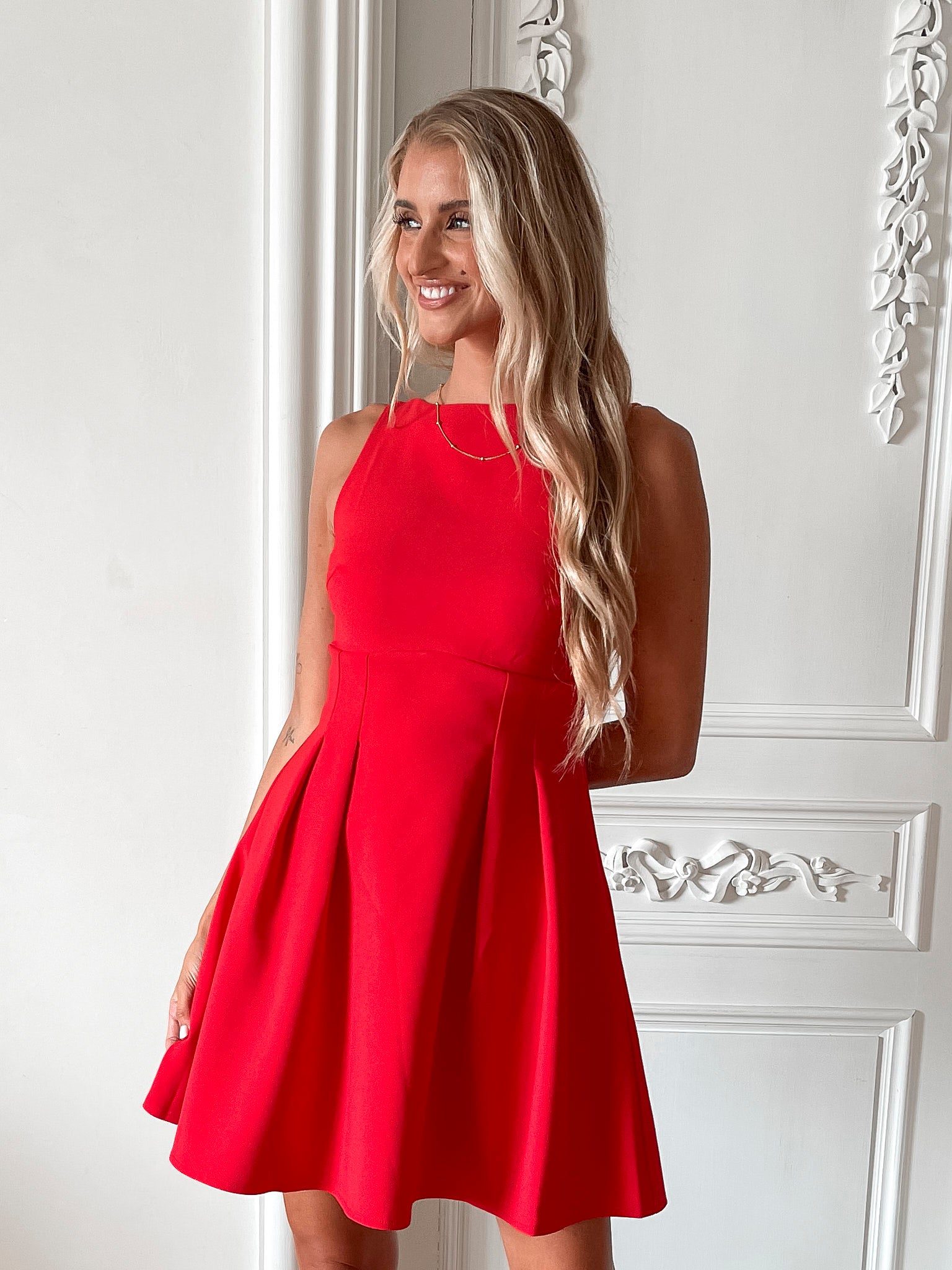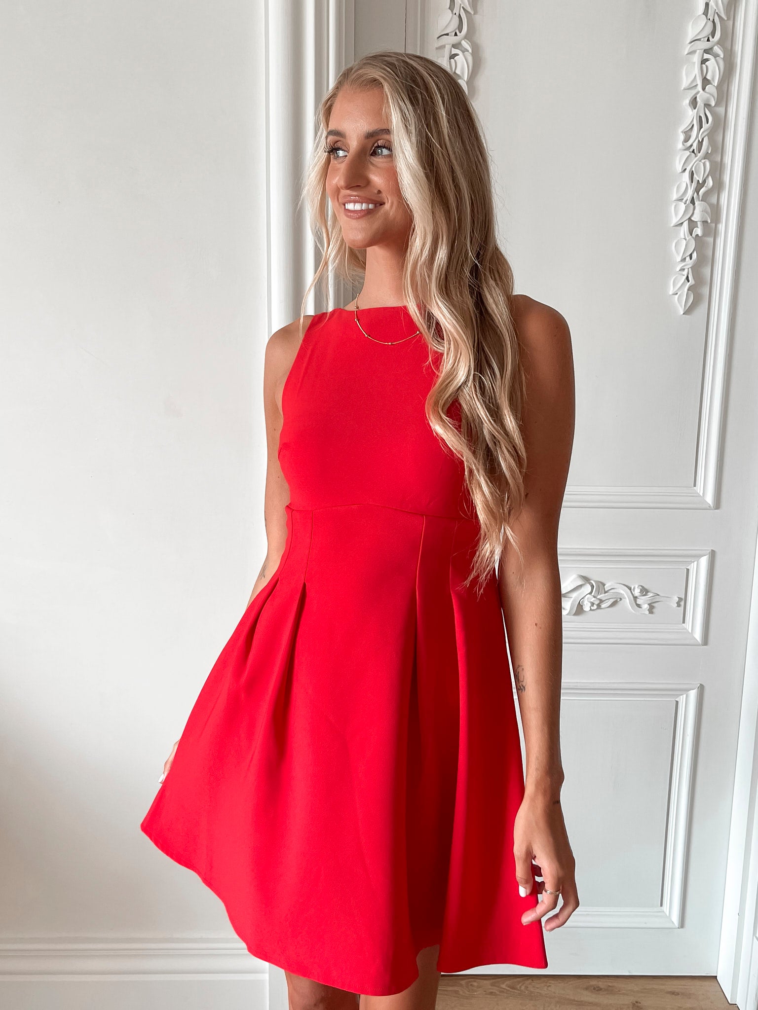 Our Petronia Dress comes in a red colour. Perfect for moonlit dinners or day out with your boo, this style is designed with a boat neckline, pleats on the waist, a-line skirt and mini length hem. Leave a lasting impression with stilettos and a classic handbag!