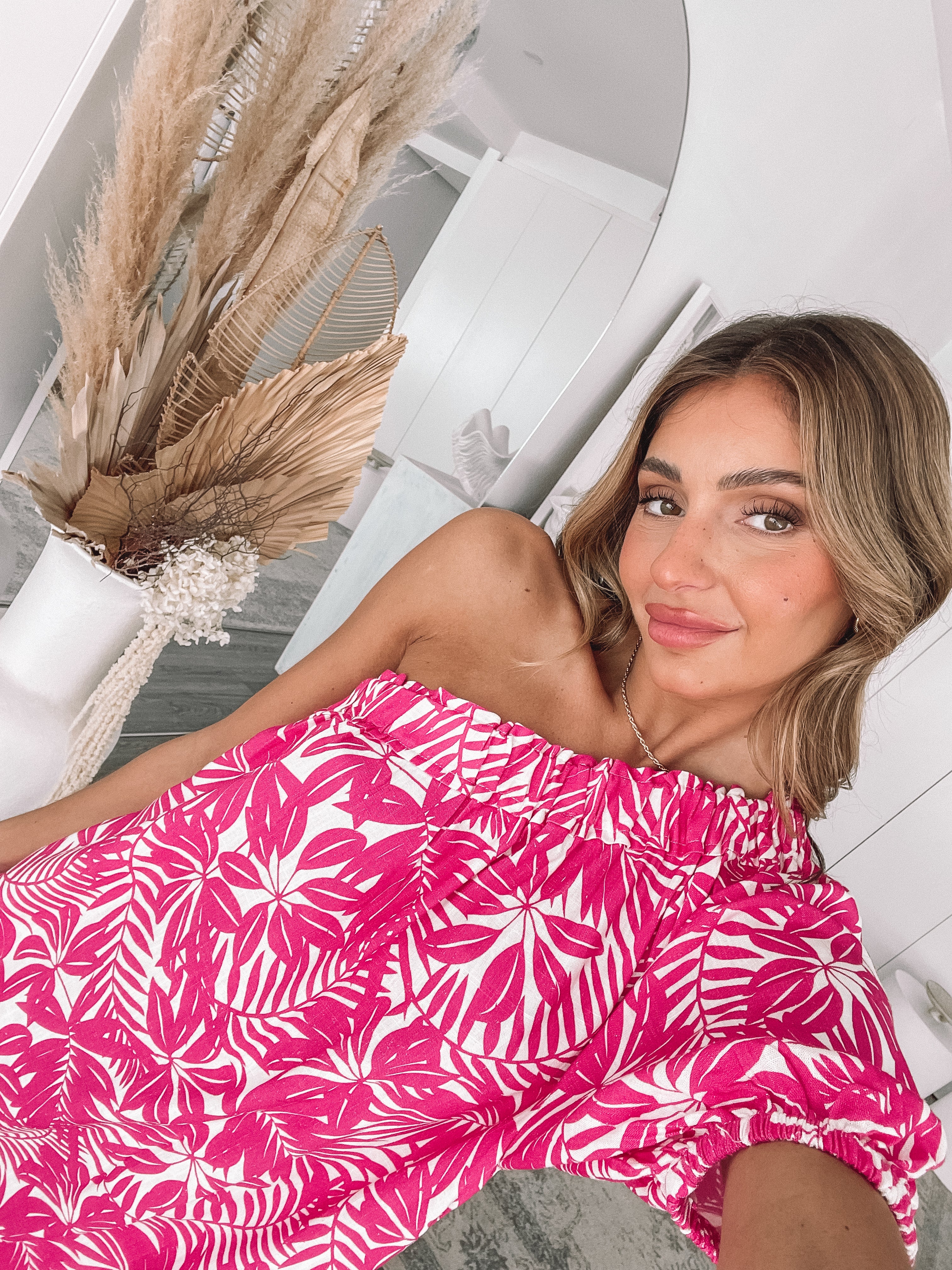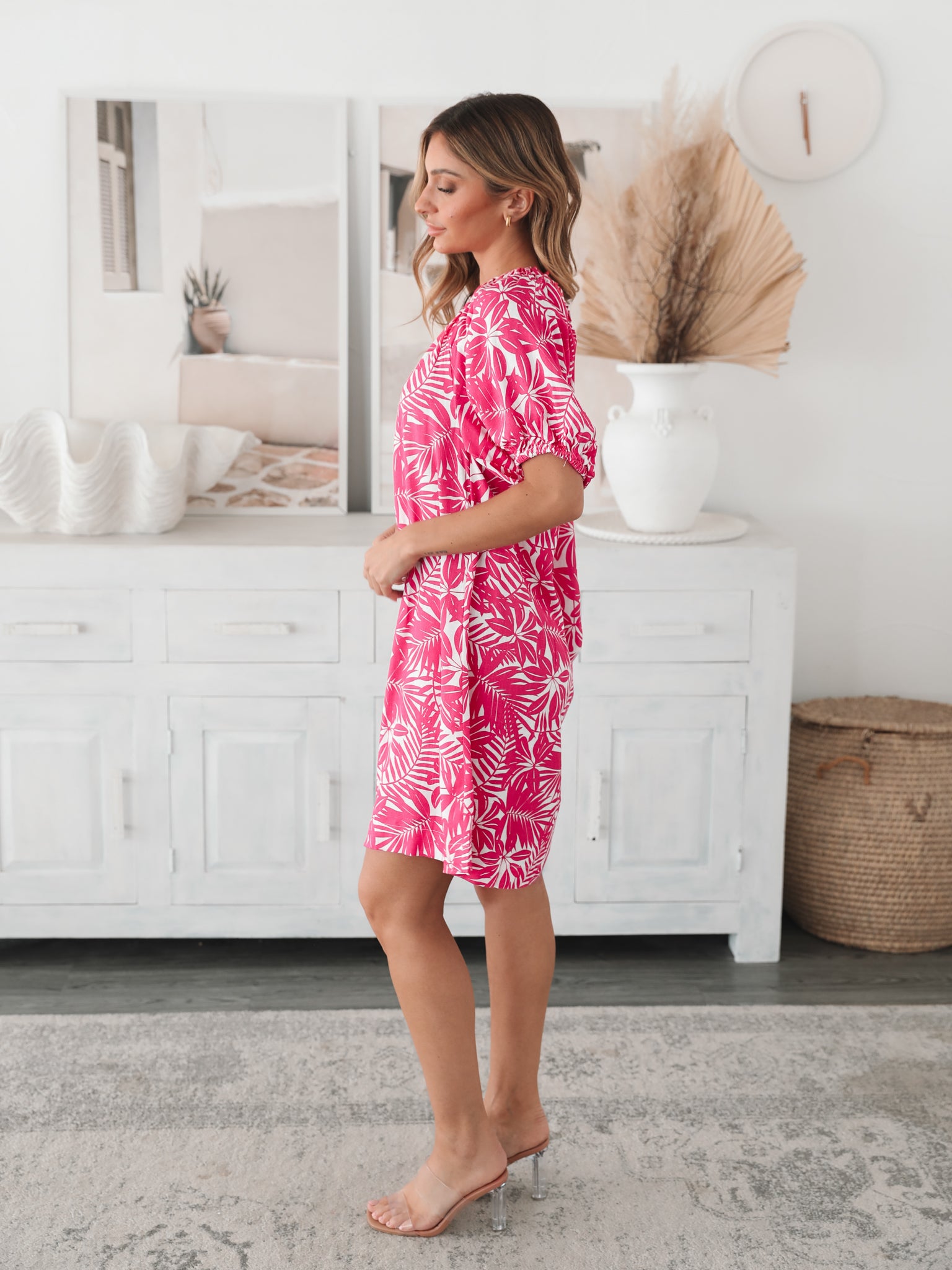 Our Raphaelle Dress comes in a pink base with multicoloured floral prints. Joining you in all your moments under the sun, this number is designed with a one shoulder neckline, single short sleeve, shift silhouette and mini length hem. Pair with a bracelet and a crescent shoulder bag!