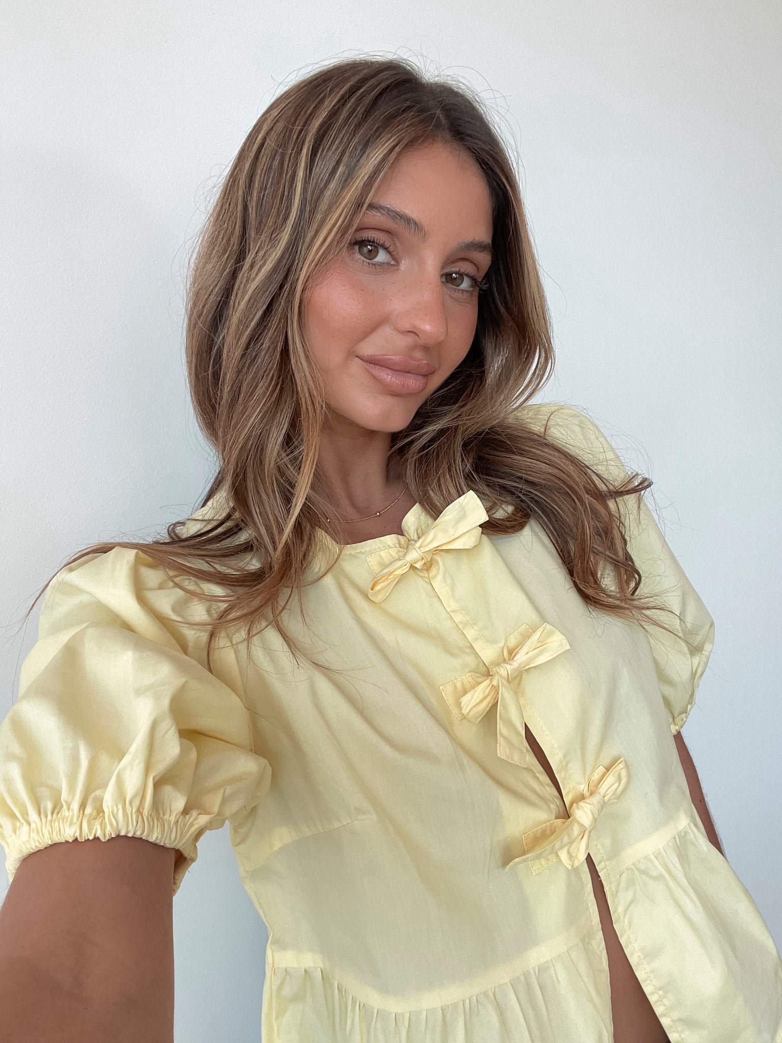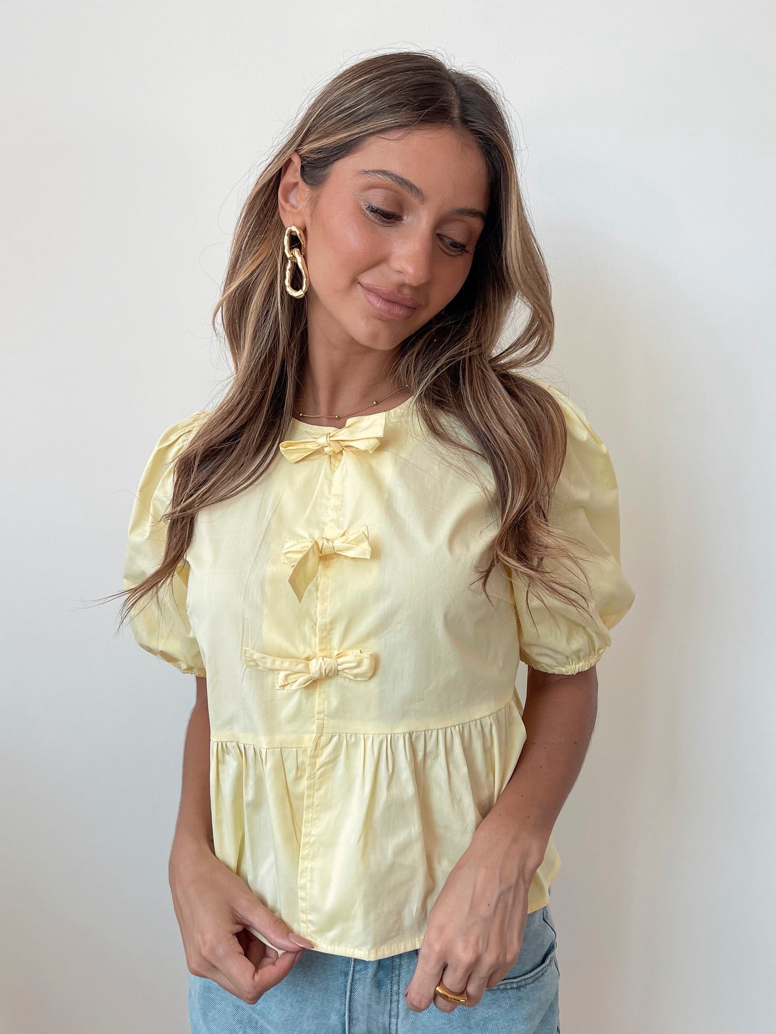 Our Rayanna Top comes in a yellow colour. Wrapping you in a playful charm, this piece features a round neckline, top front bow ties, short puff sleeves and peplum design. Layer delicate gold necklaces and add a few dainty bracelets for some subtle sparkle!