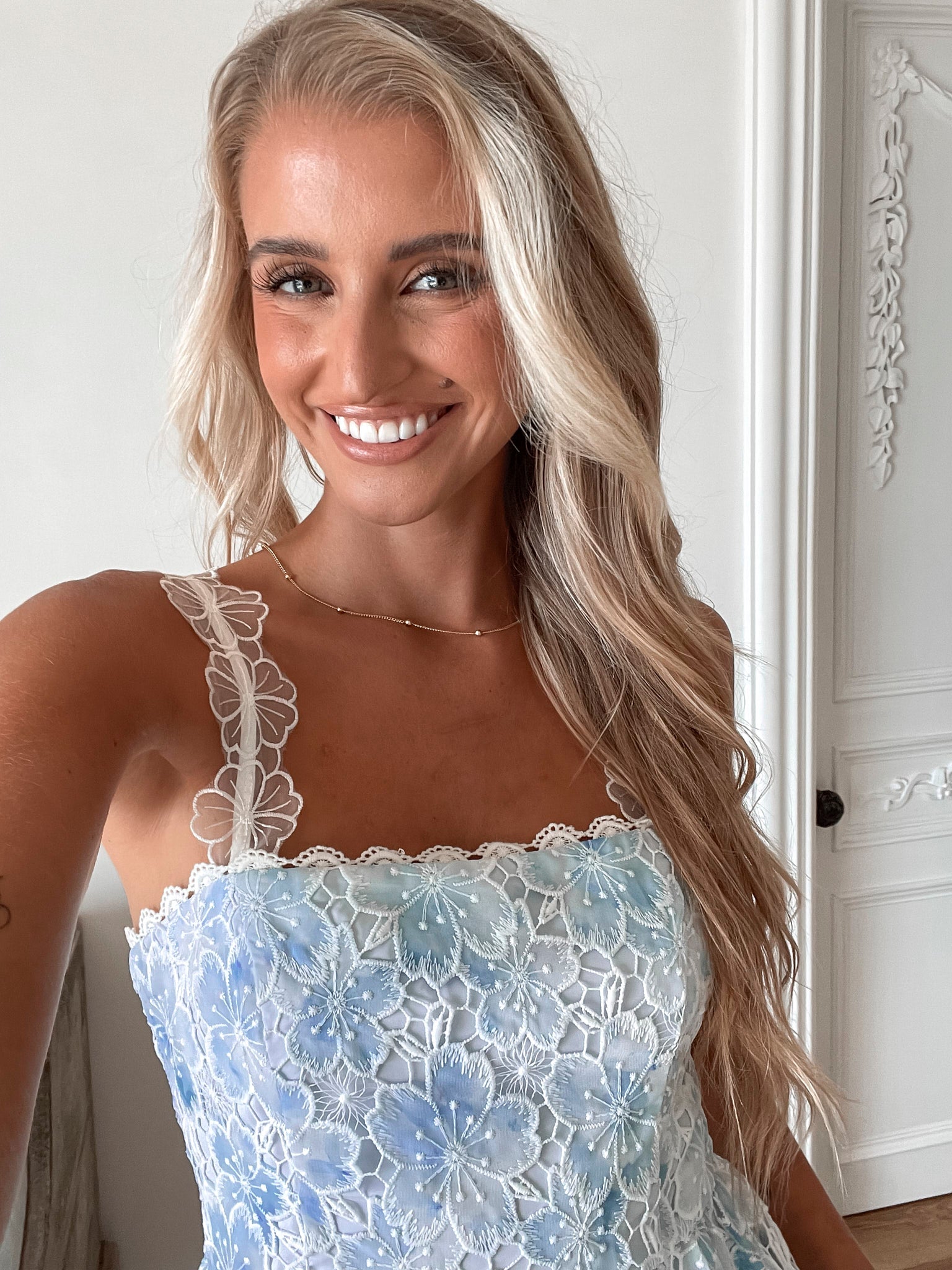 Our Riya Dress comes in tones of blue and white. A dreamy blend of elegance and romance, this number is designed with lace all over, a-line skirt and mini length hem. Bloom more with floral shaped accessories!
