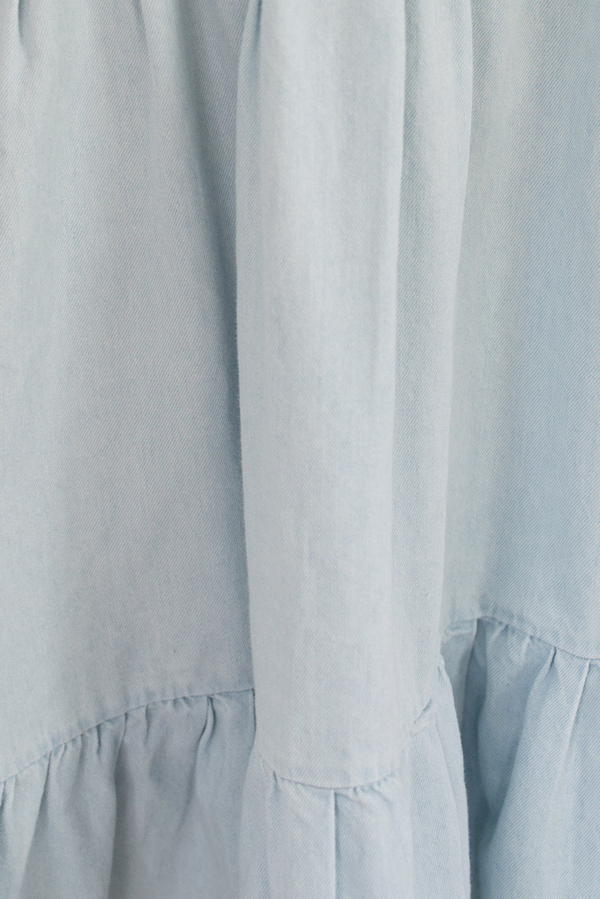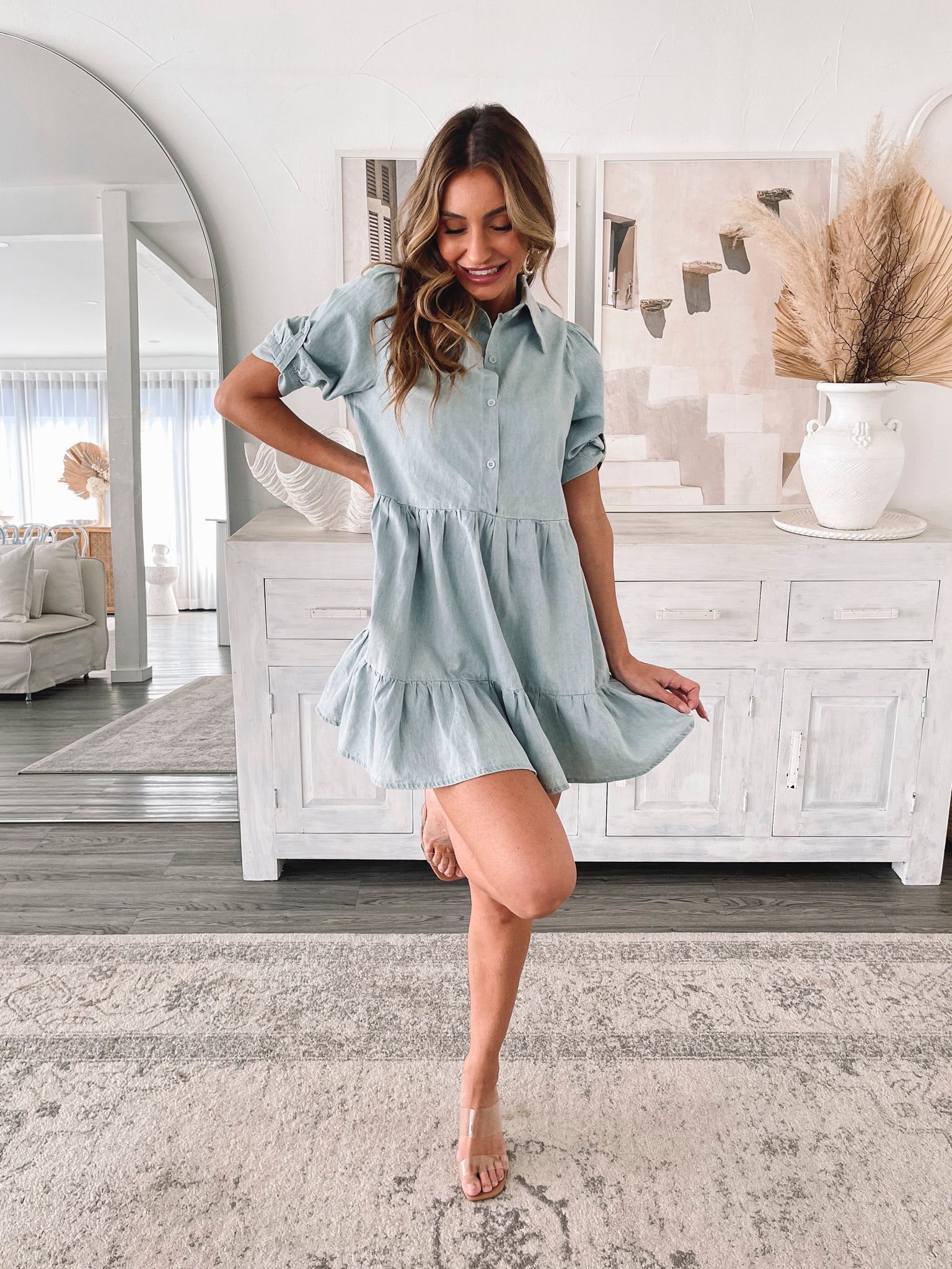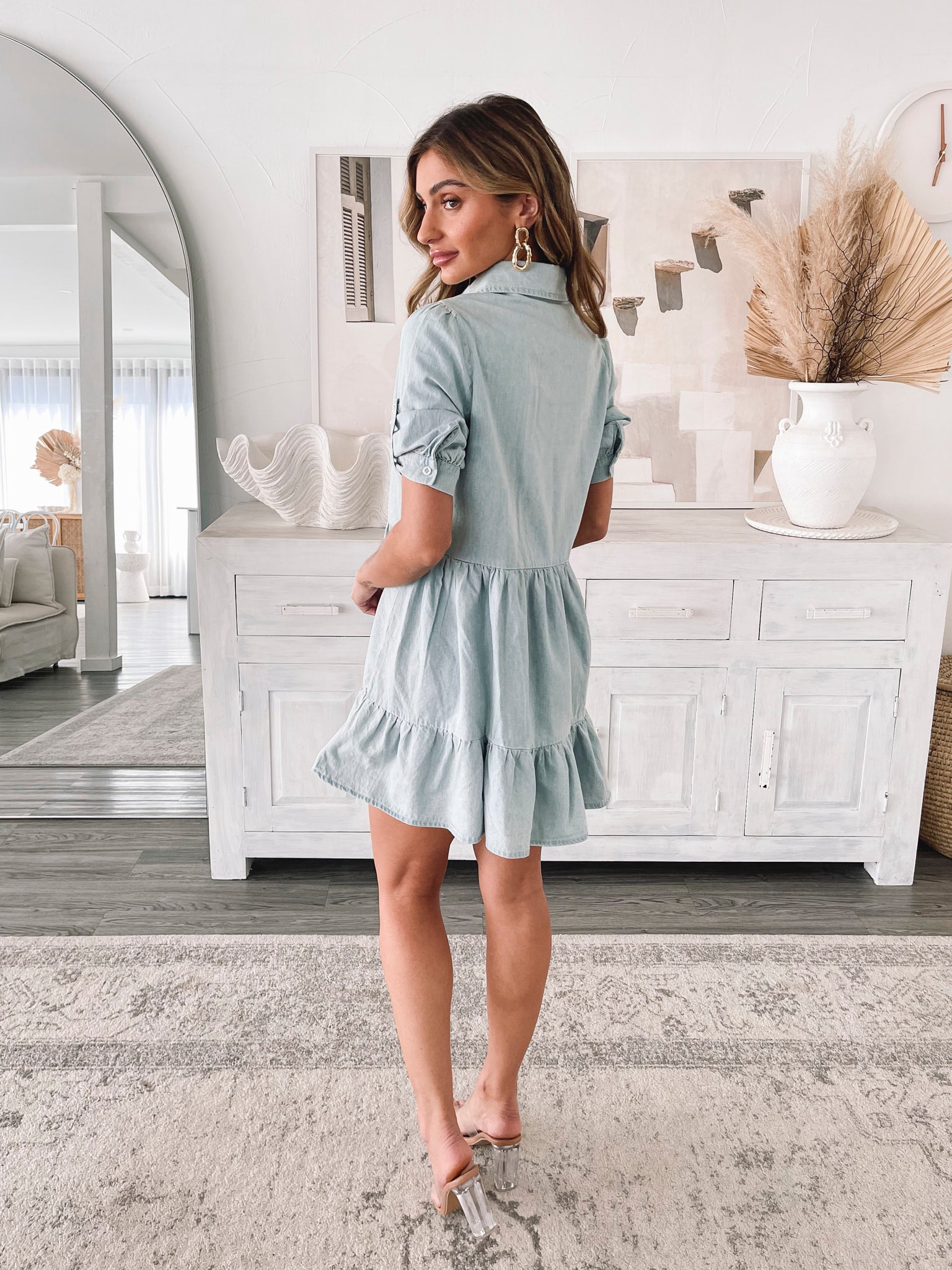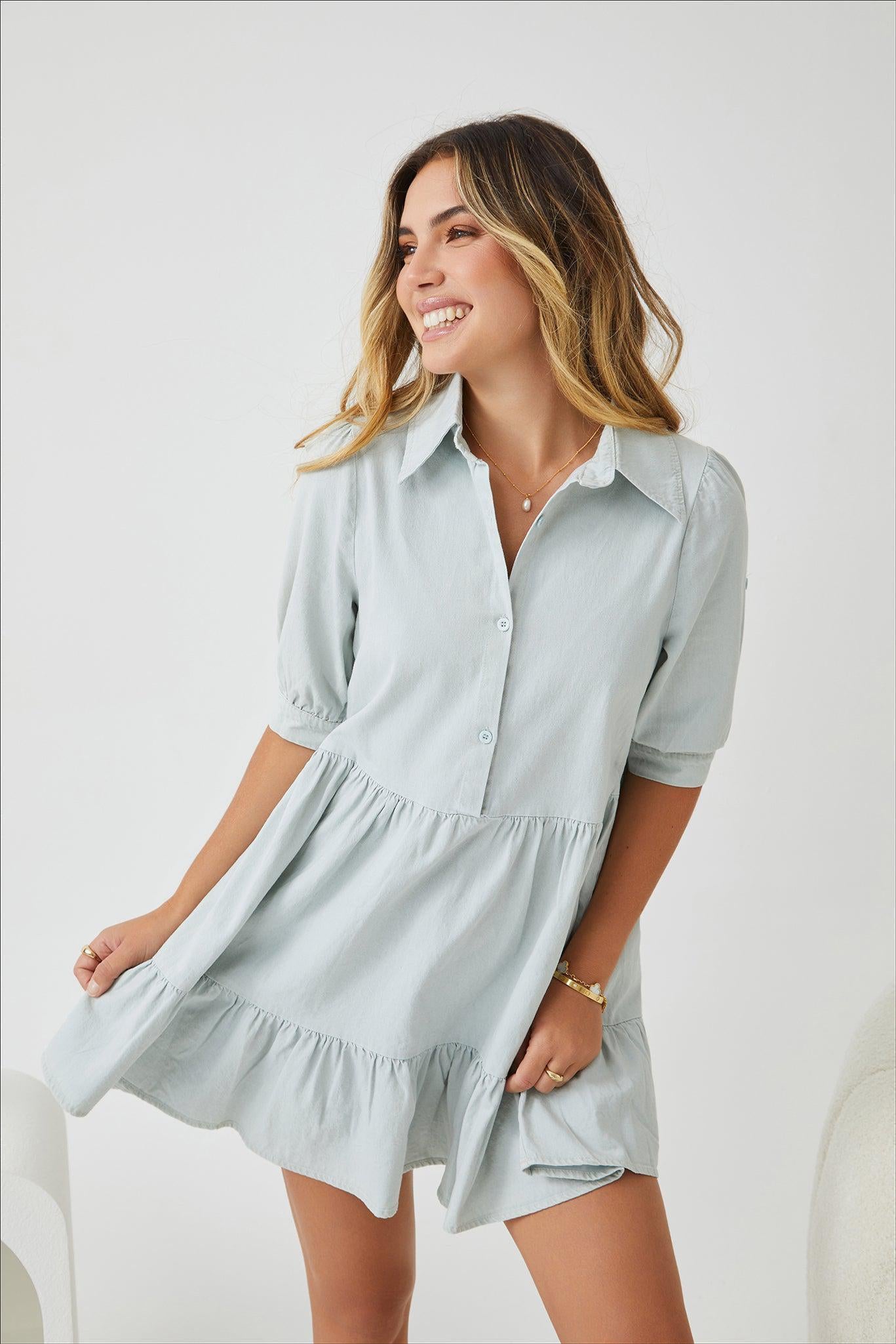 Our Sanaz Dress comes in a lovely light baby blue tone. This relaxed shirt dress features a collared V neckline, buttons on the bust, cinched long sleeves with buttons on the cuffs, and a tiered skirt with gathered detailing. This stunning mini could be dressed up or down for work or an off-duty look.