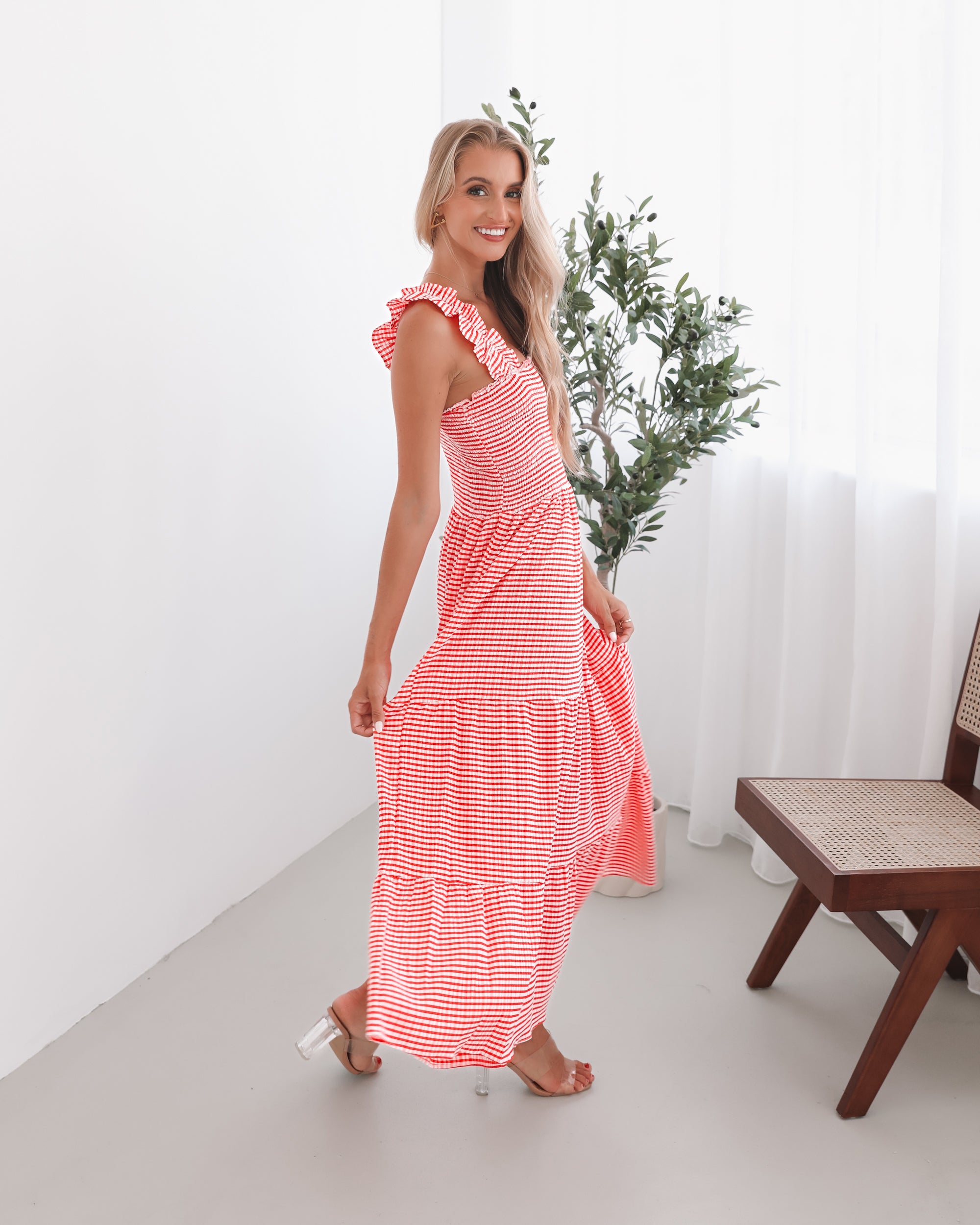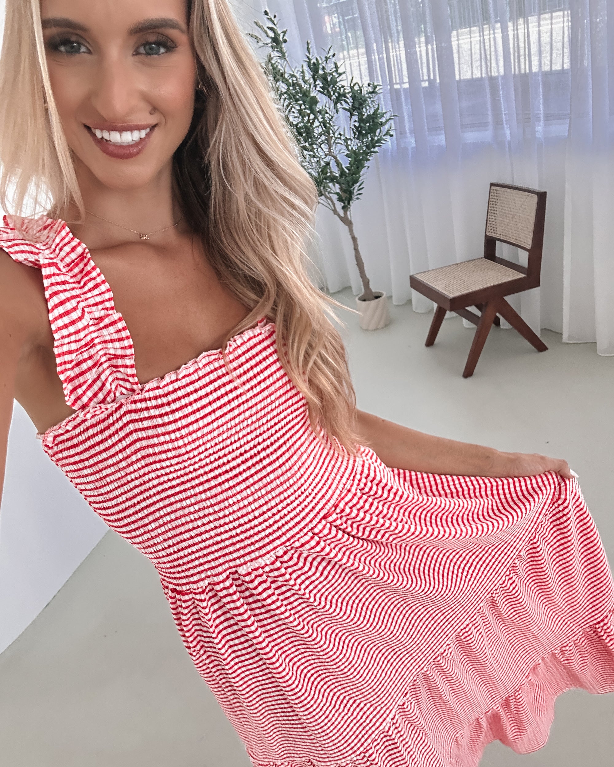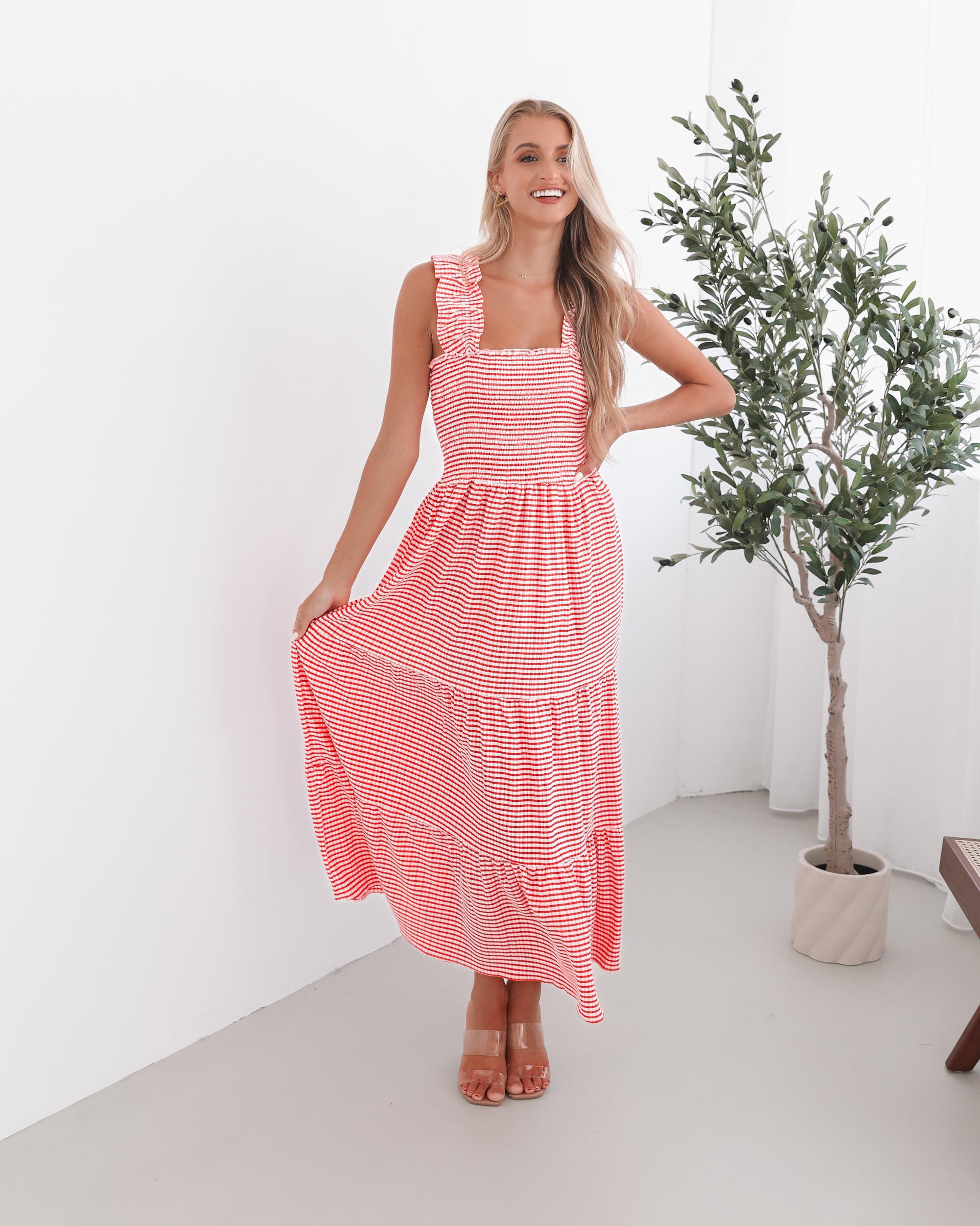 Our Sentosa Dress comes in red and white colours. Sun-drenched days call for the effortless charm of this piece that features a wide frilled straps, square neckline, stripe print, flowy skirt and midaxi length hem. Elevate the look with woven espadrilles and a rattan handbag for the ultimate vacation vibe!