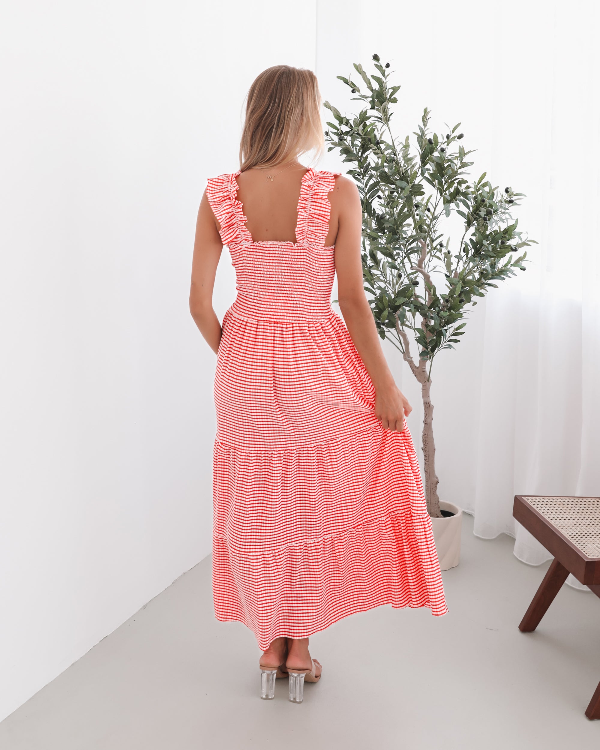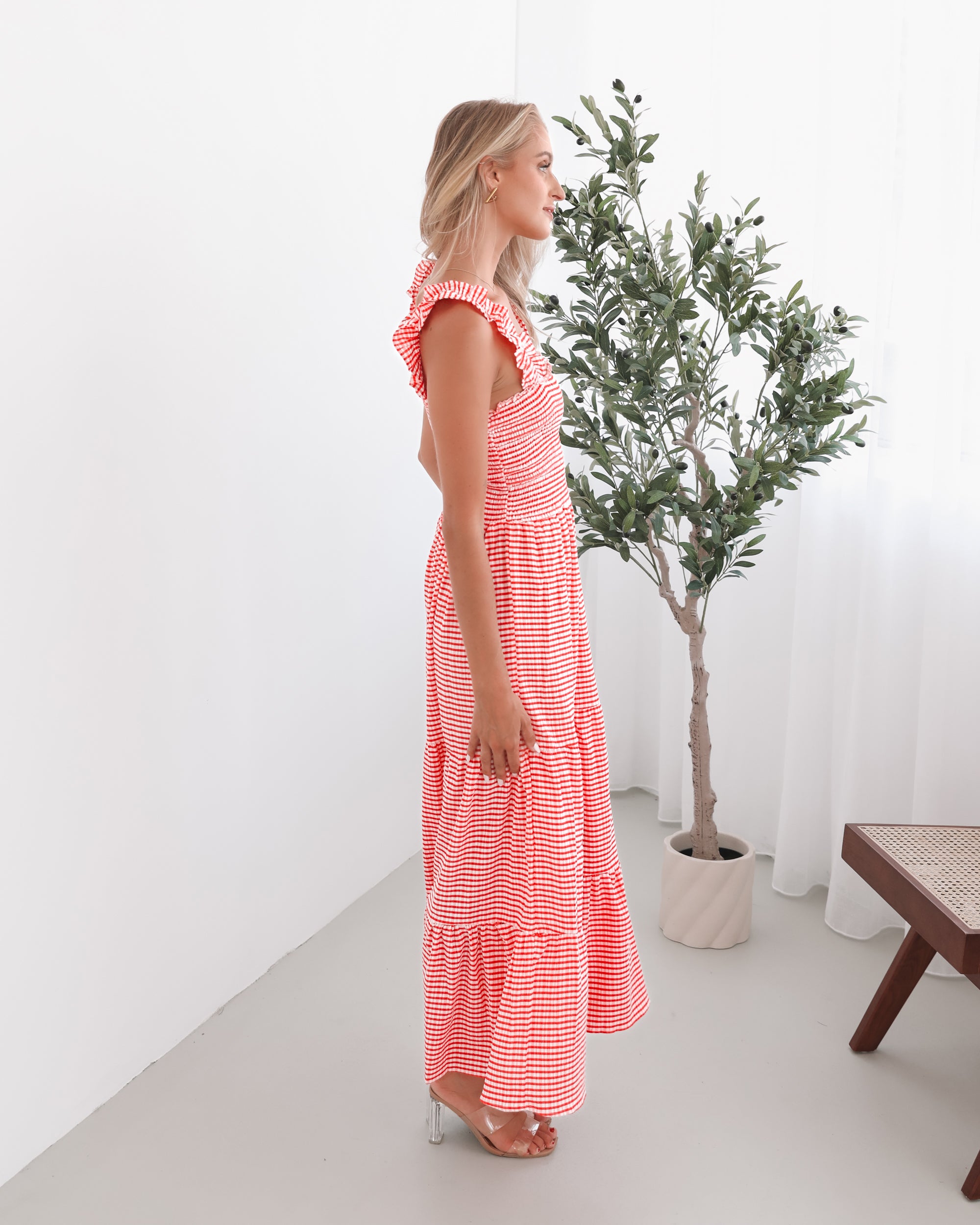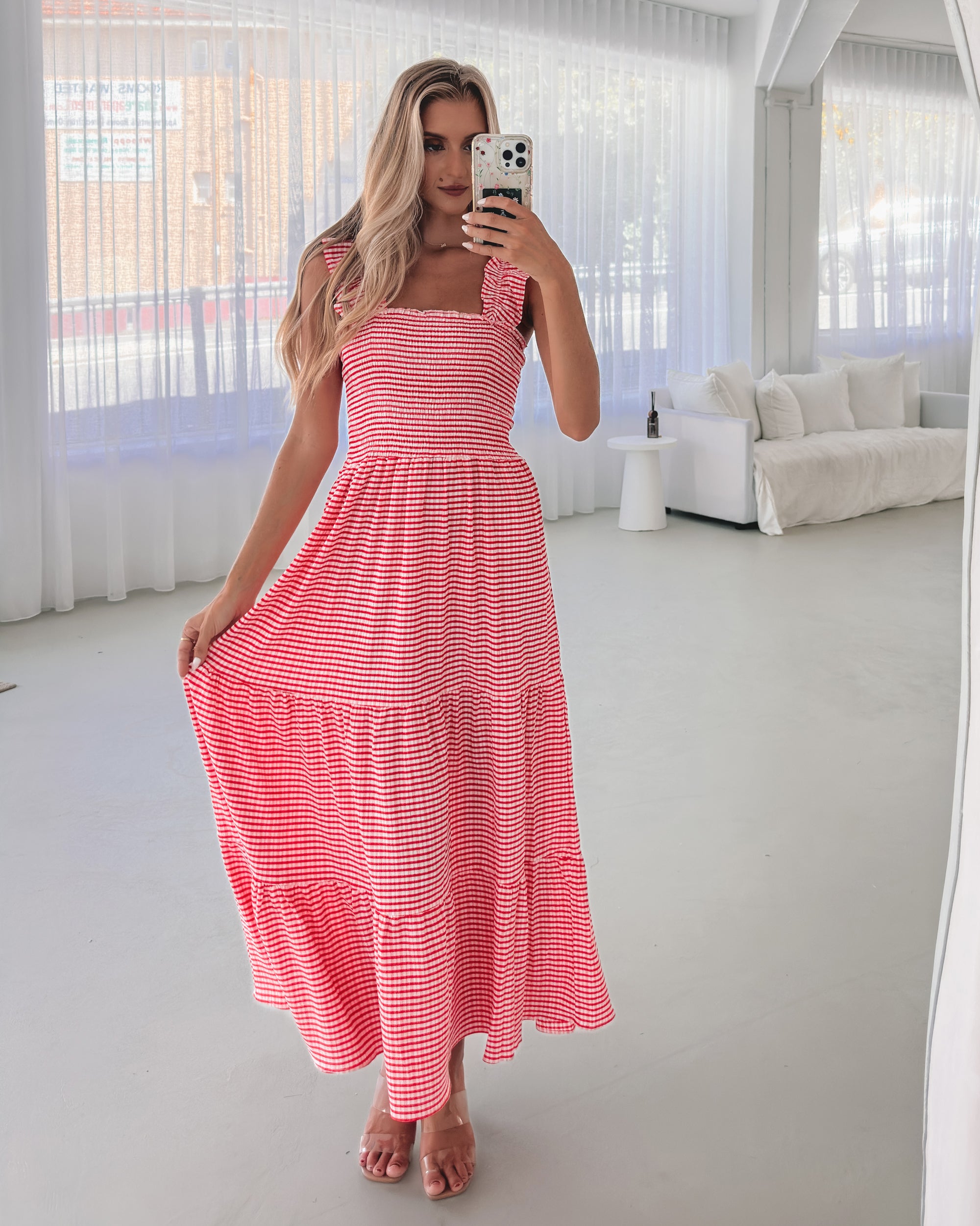 Our Sentosa Dress comes in red and white colours. Sun-drenched days call for the effortless charm of this piece that features a wide frilled straps, square neckline, stripe print, flowy skirt and midaxi length hem. Elevate the look with woven espadrilles and a rattan handbag for the ultimate vacation vibe!