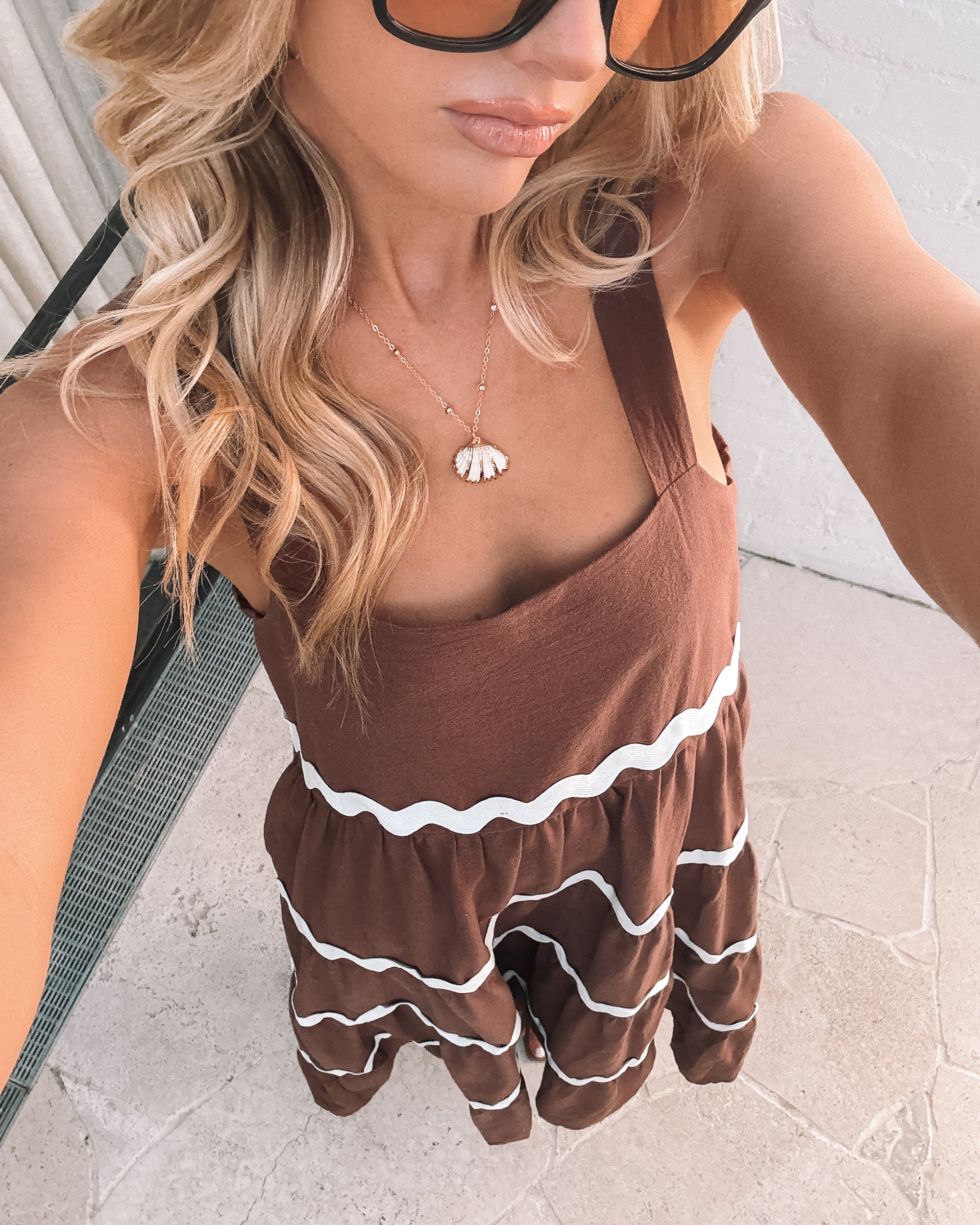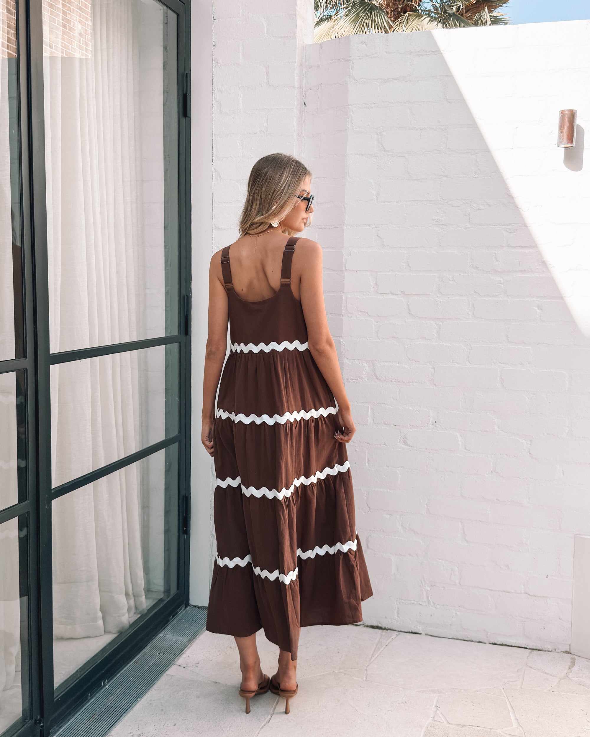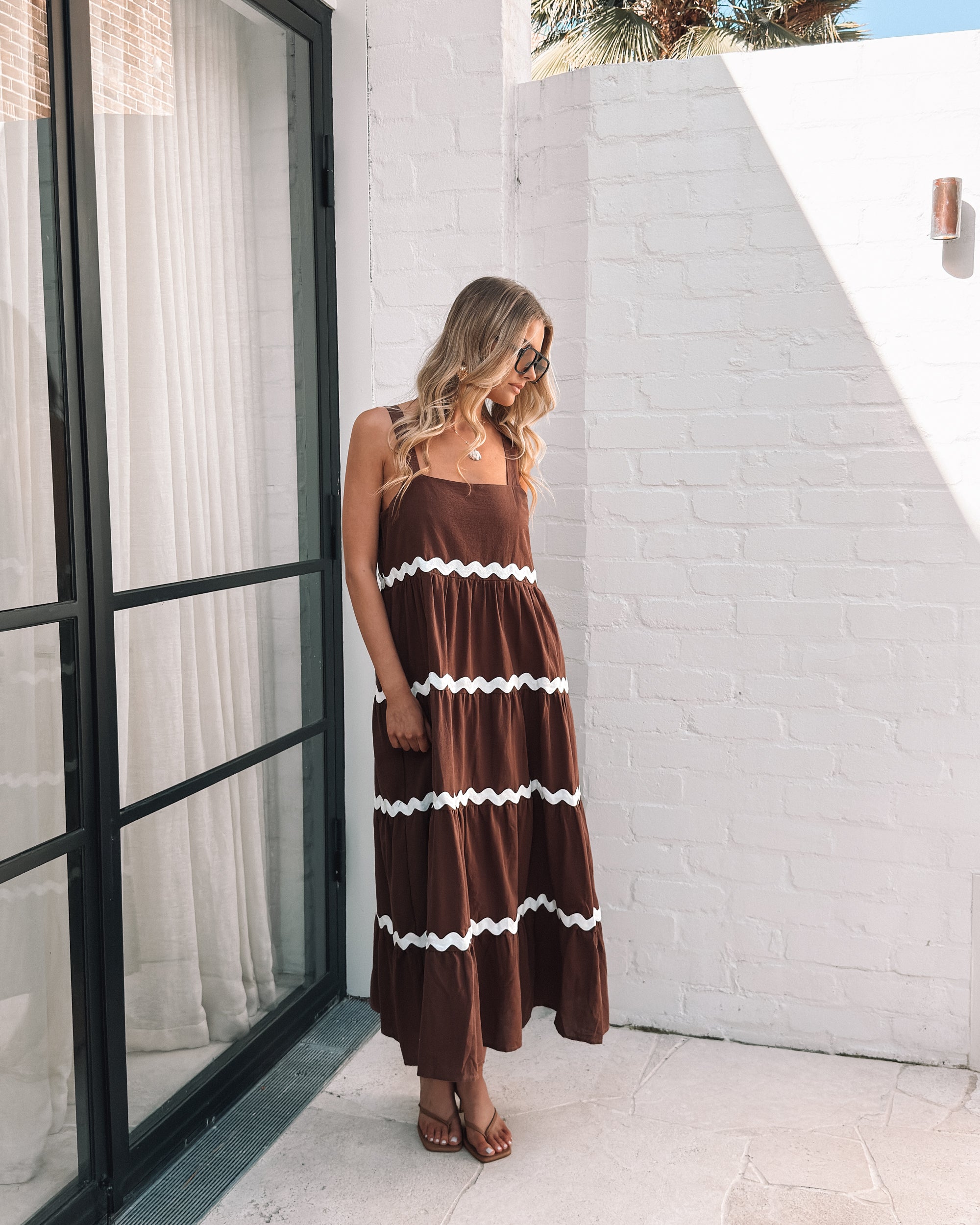 Our Taline Dress comes in shades of brown and white. Flowing beautifully with its relaxed silhouette, wide straps, square neckline and maxi length hem, this piece is perfect for casual outings or sunny adventures. Pair with simple slides, a tote bag, and a sun hat for effortless summer style.