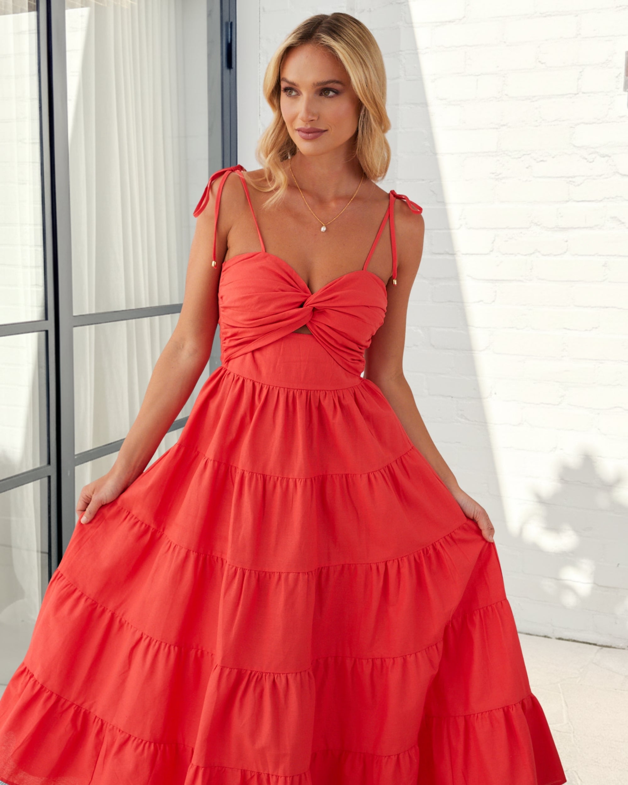Our Elan Dress comes in a red colour. A hot-girl spring look, this maxi is designed with a sweetheart neckline, slim self-tie straps, twisted bust, cut out above waist and long tiered skirt. Style with nude slip-on flats and a gold chain necklace!