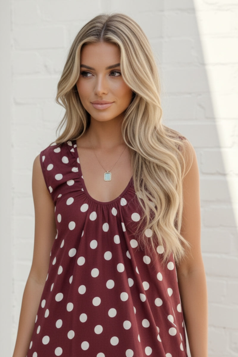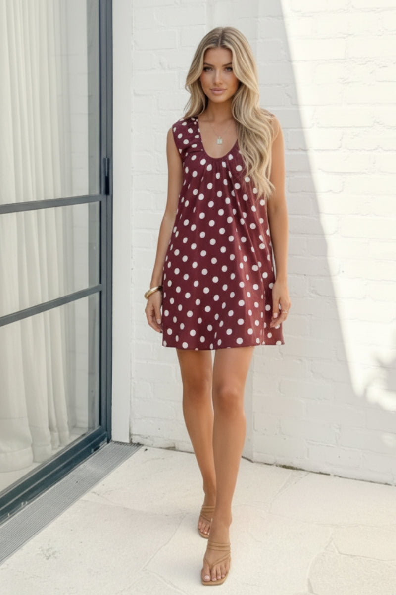 The Danika Dress in Burgundy Spot is a charming and playful mini dress, perfect for a relaxed yet stylish look. It features a flattering scoop neckline with subtle ruching details and a comfortable sleeveless design.