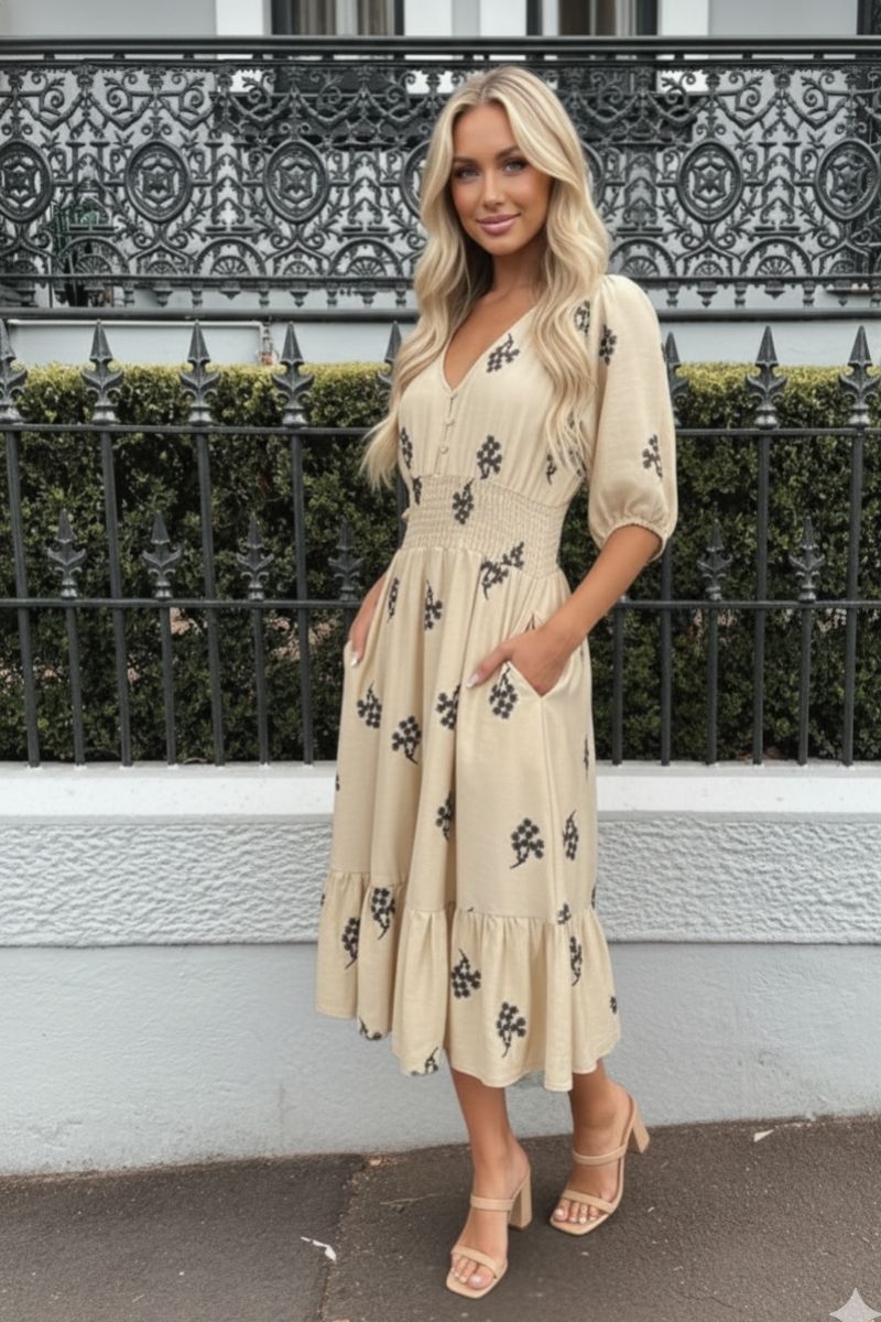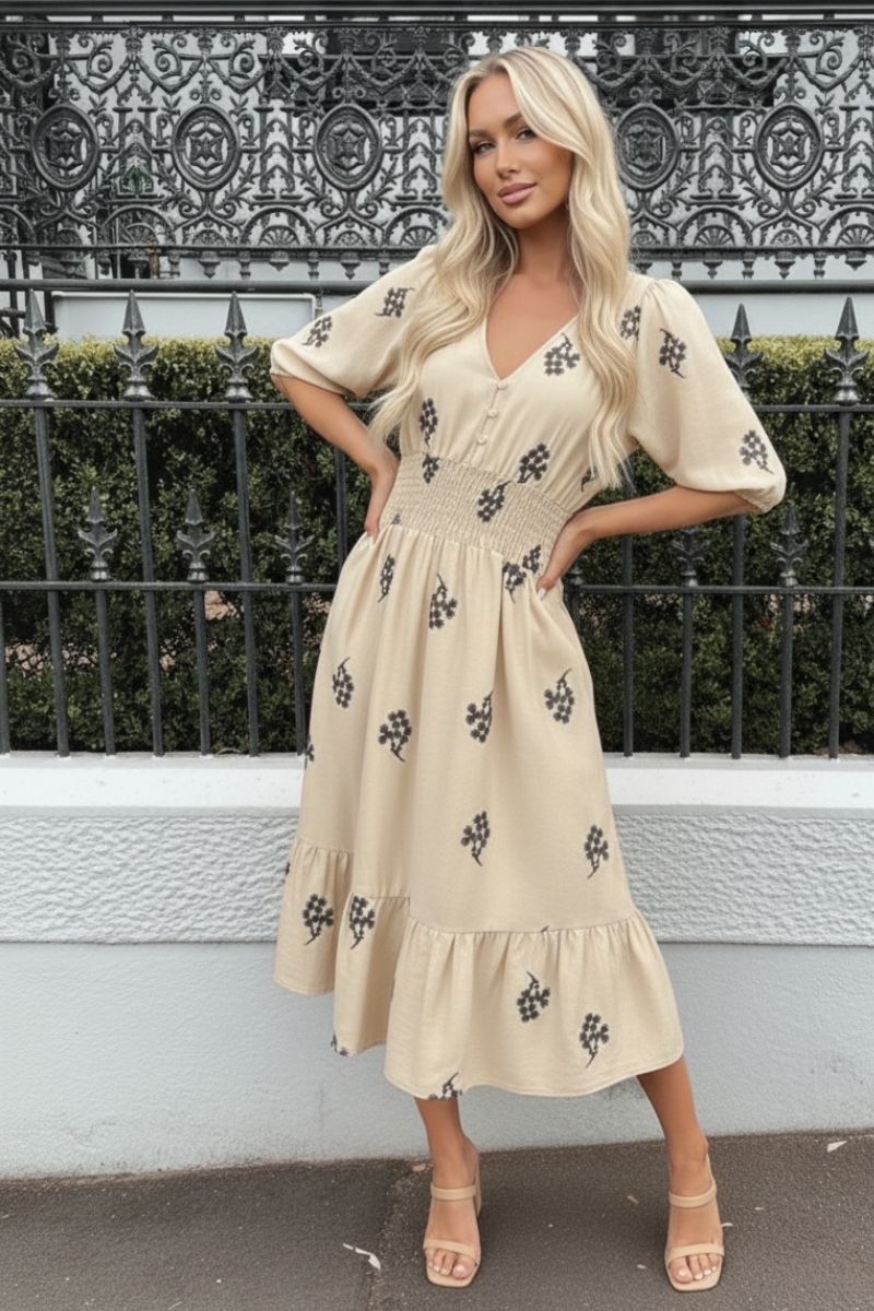 Our Adalia Dress - Beige Print comes in beige and black tones. Effortlessly feminine and timelessly chic, this beige midi dress features delicate black floral motifs that add a touch of charm to its flowy silhouette. The soft smocked waist flatters your figure, while the gentle ruffle hem and puff sleeves bring a breezy elegance. Pair it with strappy sandals and a woven tote for a relaxed daytime look, or elevate it with heeled mules and gold accessories for an effortless evening charm.