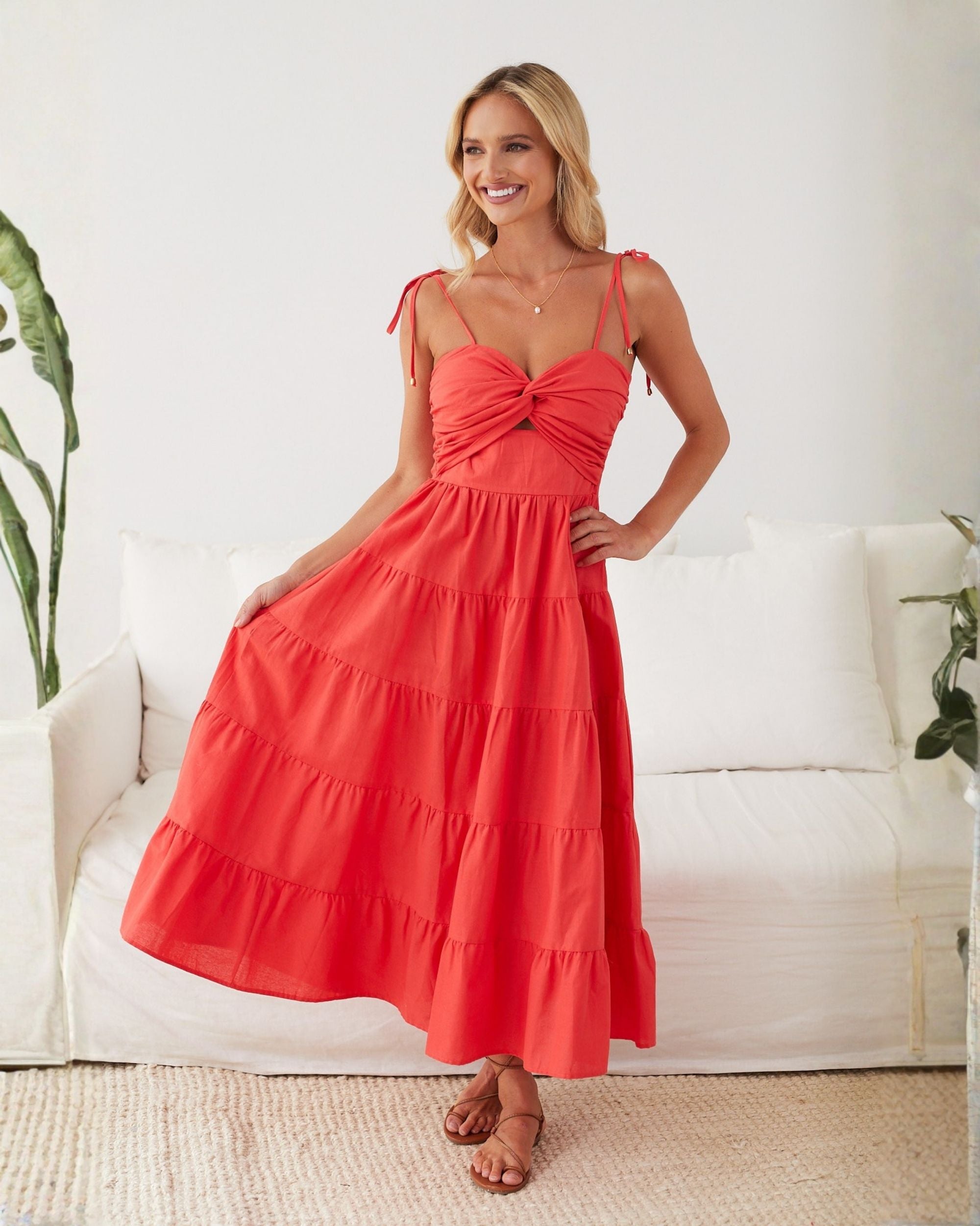 Our Elan Dress comes in a red colour. A hot-girl spring look, this maxi is designed with a sweetheart neckline, slim self-tie straps, twisted bust, cut out above waist and long tiered skirt. Style with nude slip-on flats and a gold chain necklace!