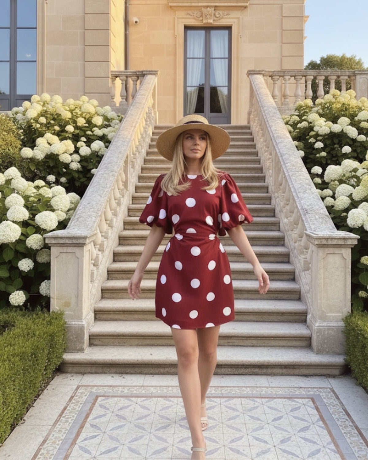 Our Shahnaz Dress comes in elegant wine and white tones, blending vintage charm with modern flair. Featuring bold puff sleeves and classic white polka dots, this mini dress offers a playful yet feminine silhouette. Style it with strappy heels or ankle boots and a structured handbag for an effortlessly chic look!