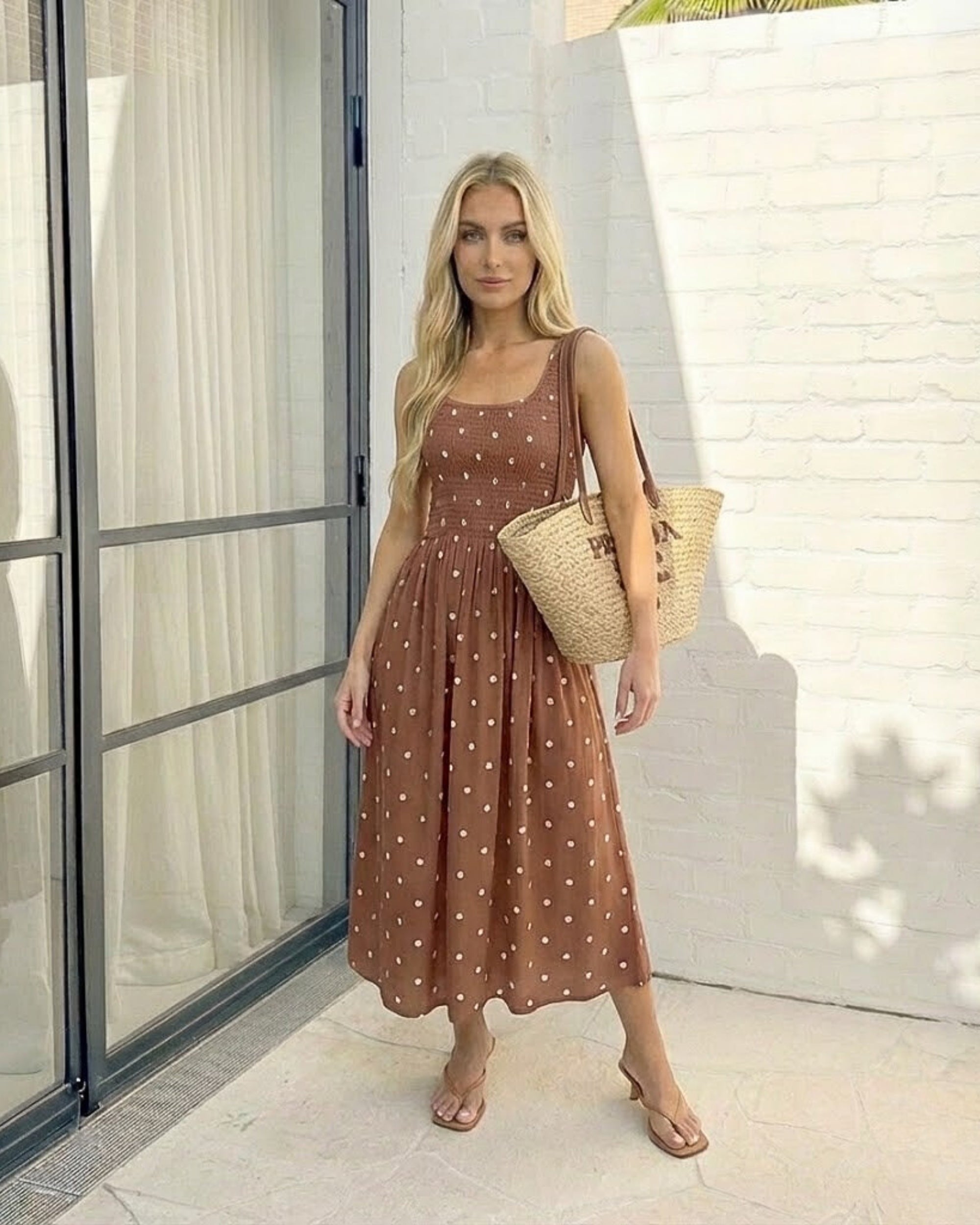 - Key Features: Features an eye-catching white polka dot pattern against a gorgeous rust (burnt orange/terracotta) background, creating a warm and inviting aesthetic that stands out. The beautifully shirred (smocked) bodice provides an incredibly flexible and flattering fit, gently adapting to your body shape while ensuring maximum comfort and ease of movement. A contemporary square neckline adds a touch of modern elegance, framing your collarbones and décolletage beautifully. The fitted bodice gracefully transitions into a relaxed, A-line midi skirt that drapes elegantly, offering a comfortable and effortlessly chic silhouette. Yes, it has pockets! Convenient side pockets are integrated seamlessly into the design, perfect for keeping your essentials close at hand. Designed with comfortable and stylish wide shoulder straps for excellent support and a polished finish. Crafted from a lightweight and soft fabric, ensuring you stay comfortable and stylish throughout the day.
