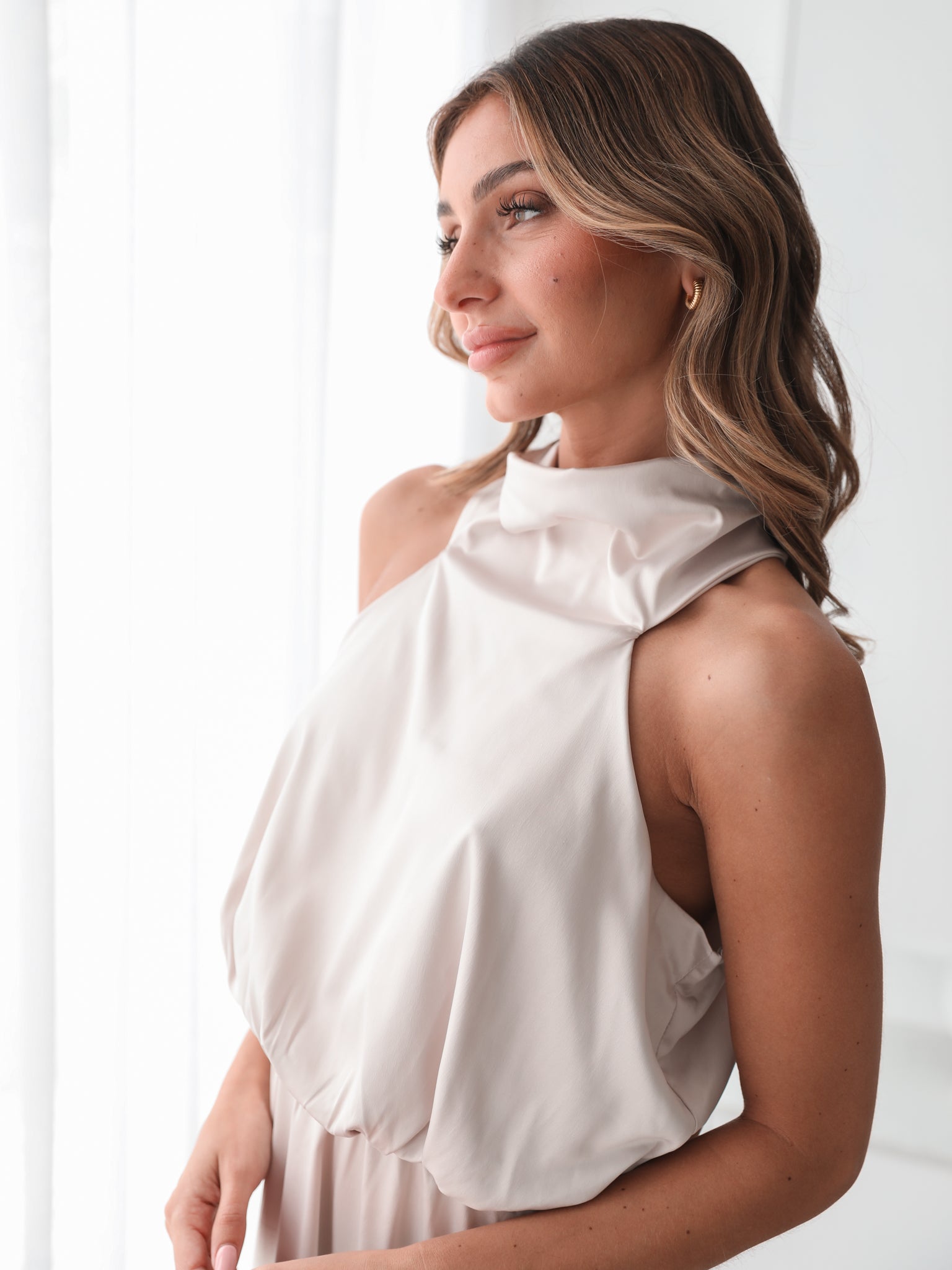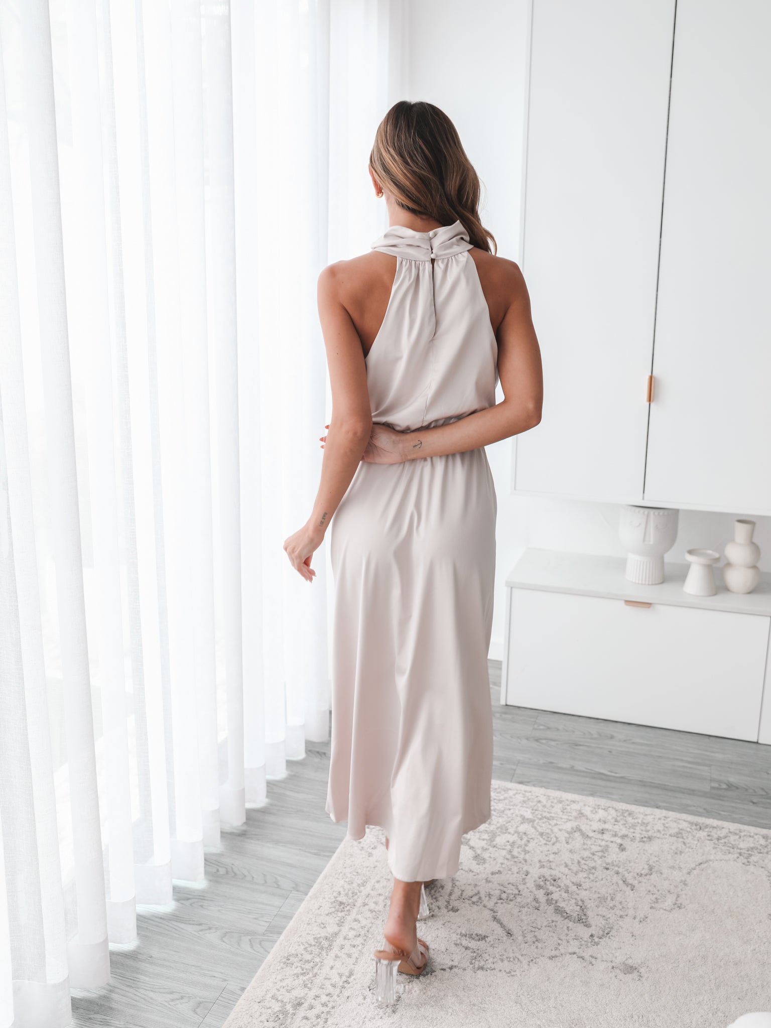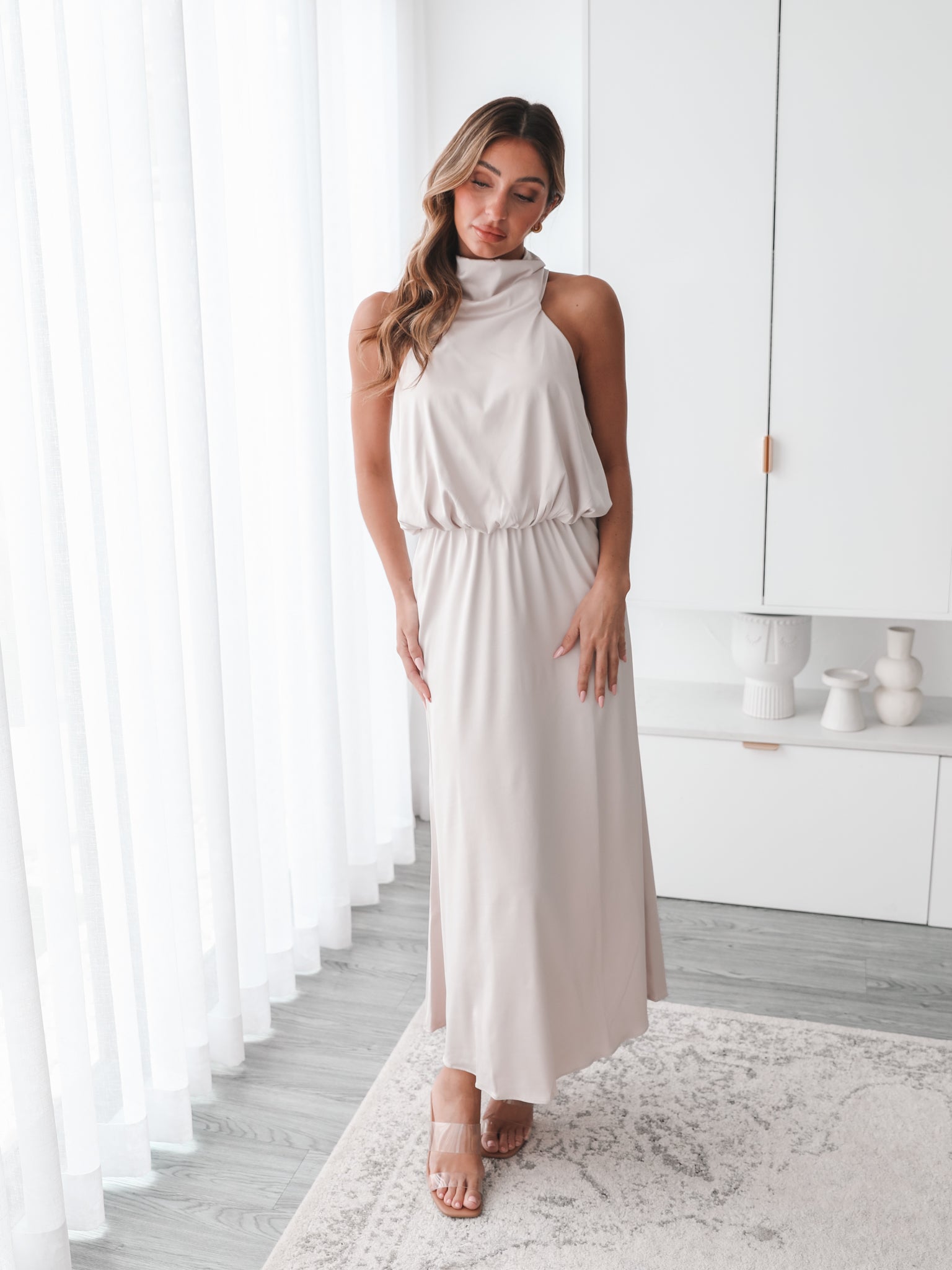 Our Martine Dress comes in a white colour. Screaming a whole lot of chicness and glam, this staple is designed with a gathered halter neckline, fit & flare silhouette, sheen fabrication and maxi length hem. Be extra luxurious with rhinestone earrings!