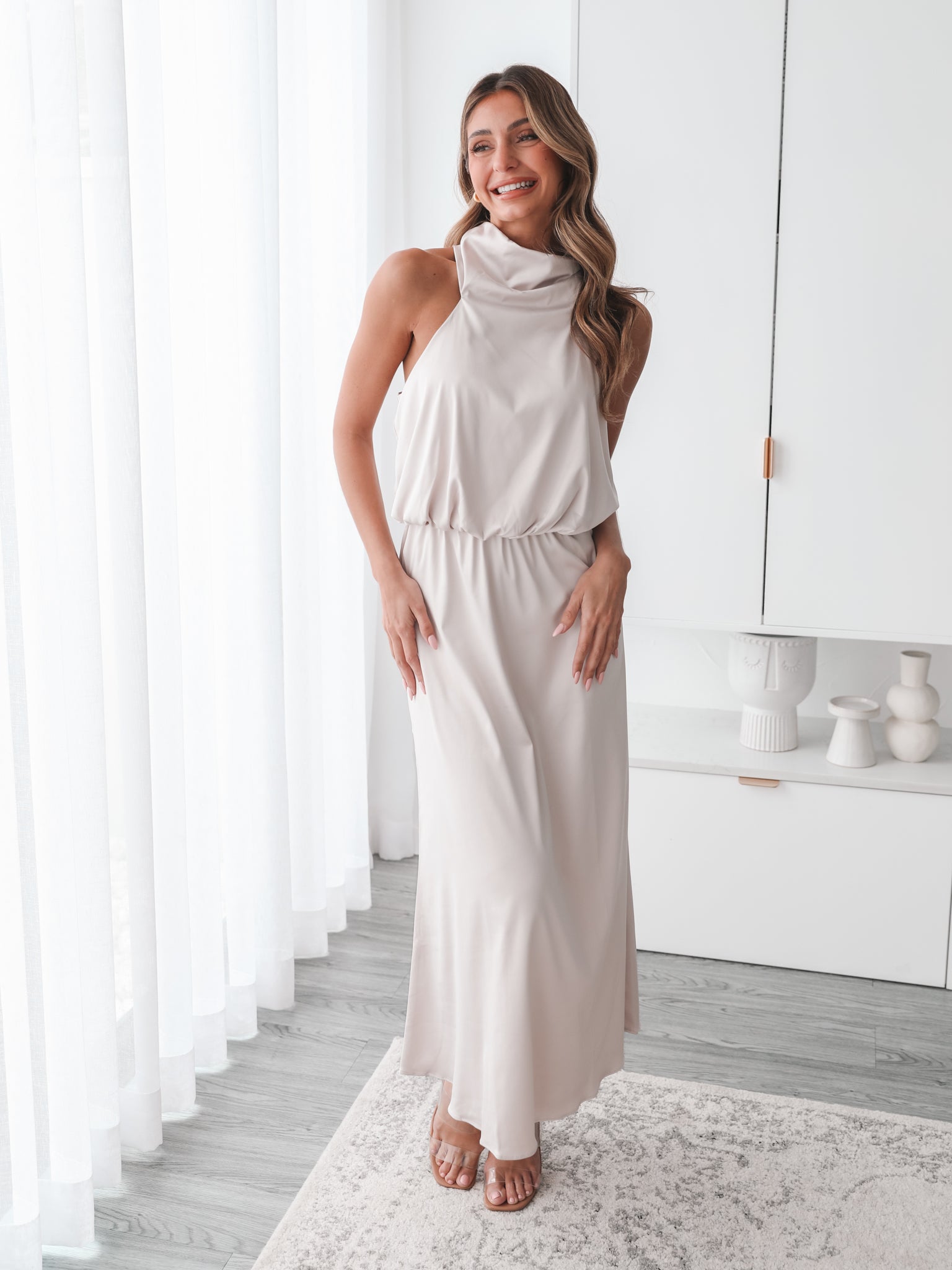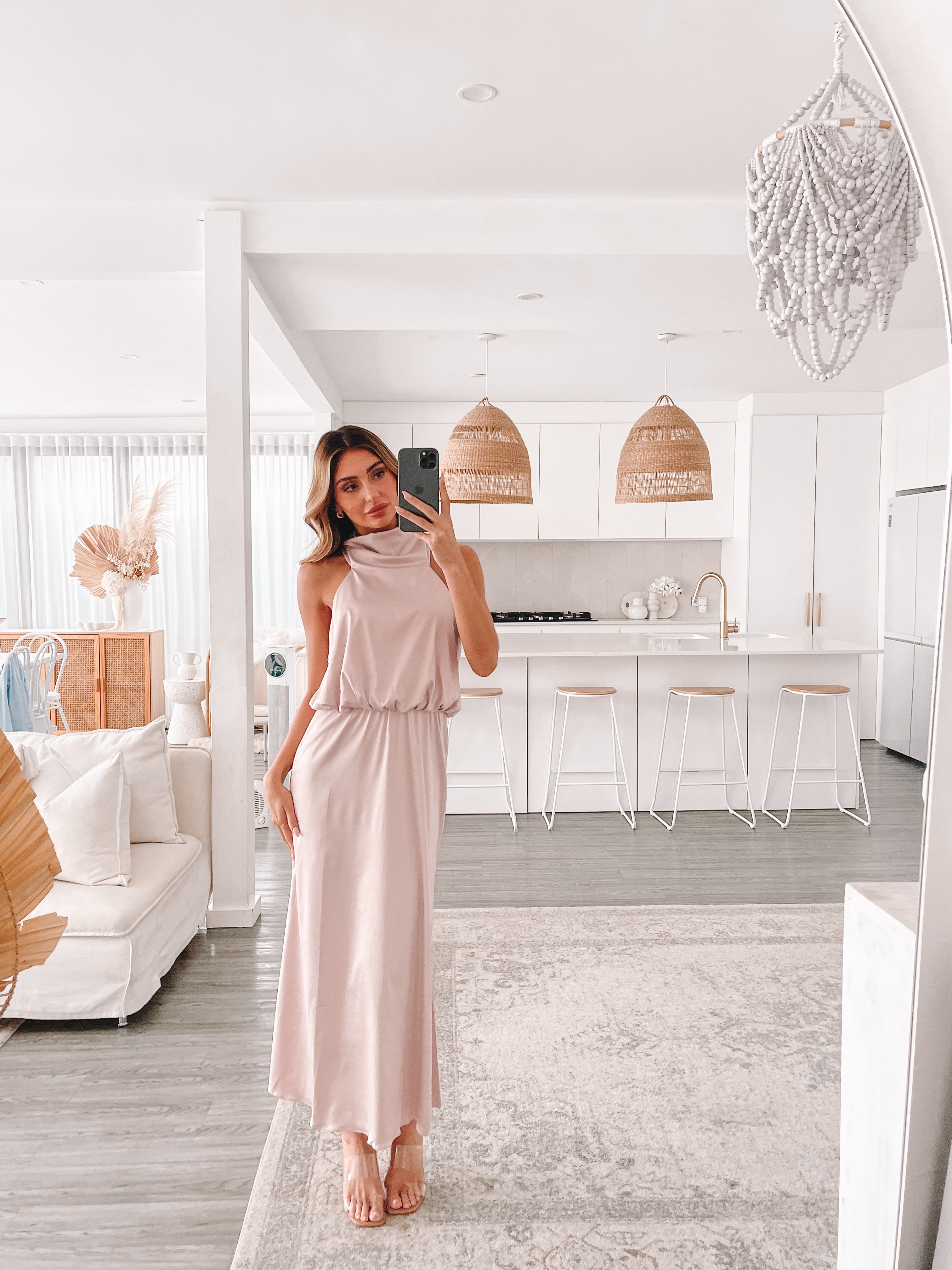 - Key Features: Gathered halter neckline. Fit & flare silhouette. Sheen fabrication. Maxi length hem.