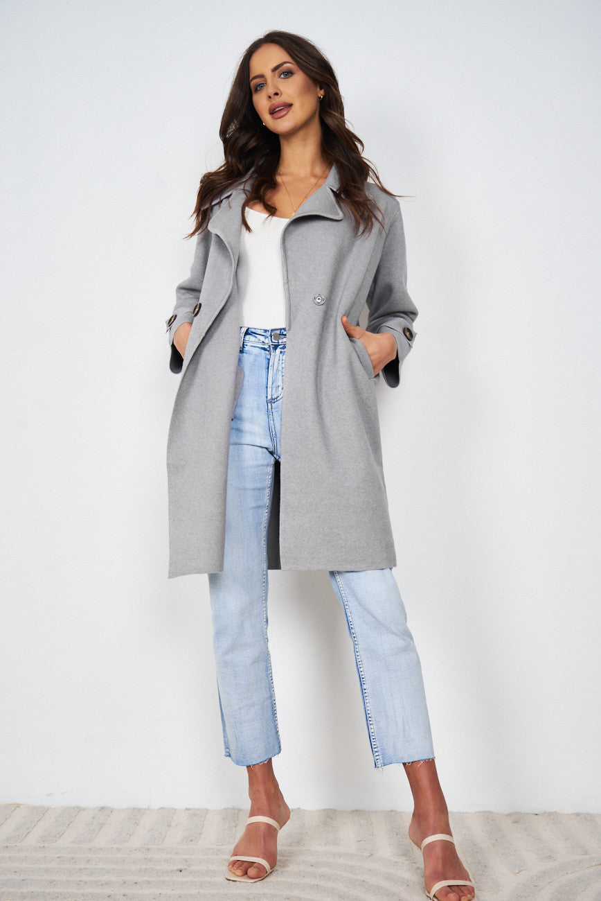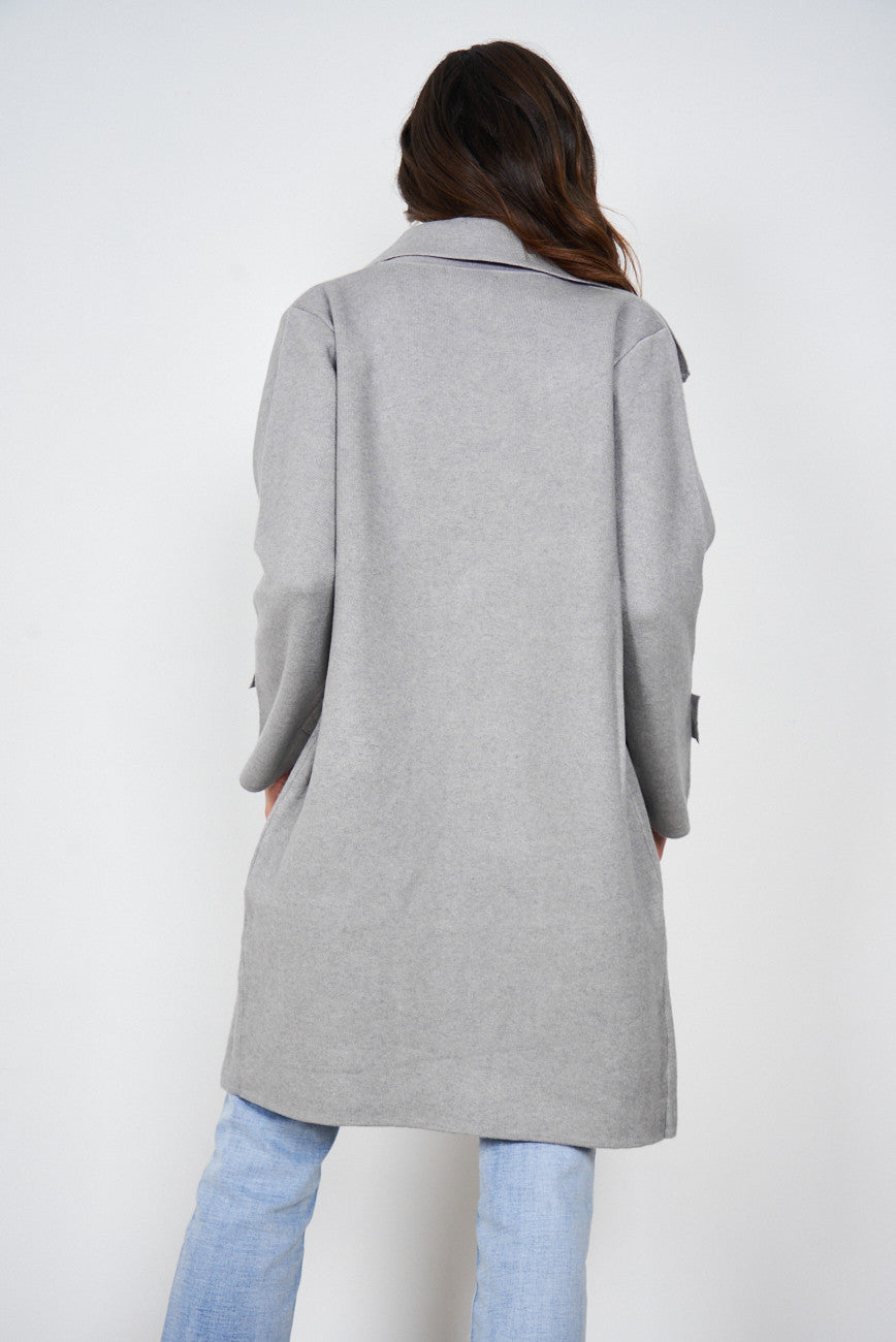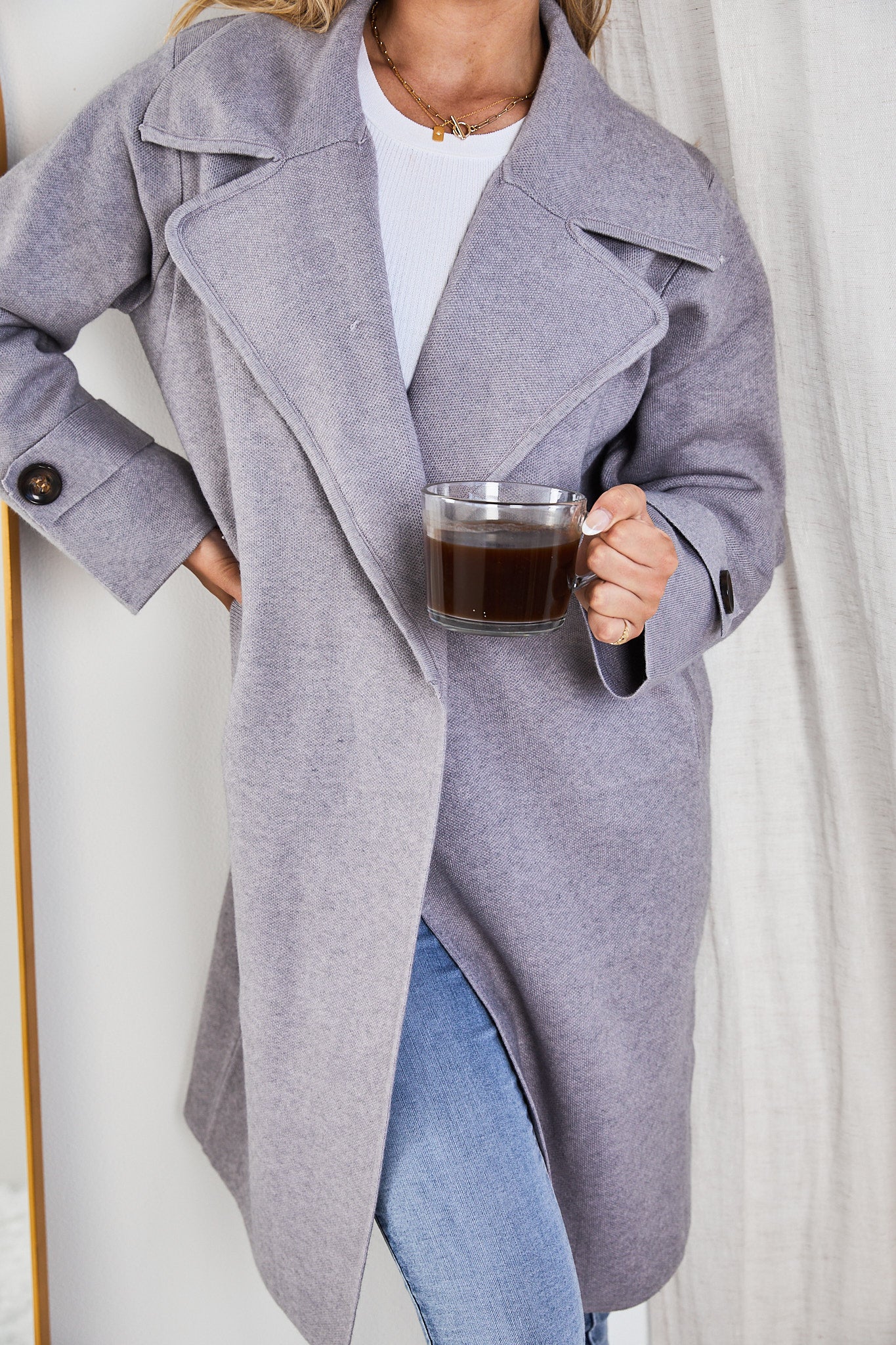 Our Fireplace Coat is a medium-weight, knitted trench style. This classic, open-style coat comes in a neutral grey tone. Featuring faux button details on the cuffs and on the front, and pockets. Pair with your favourite pair of relaxed pants for a classy winter look!