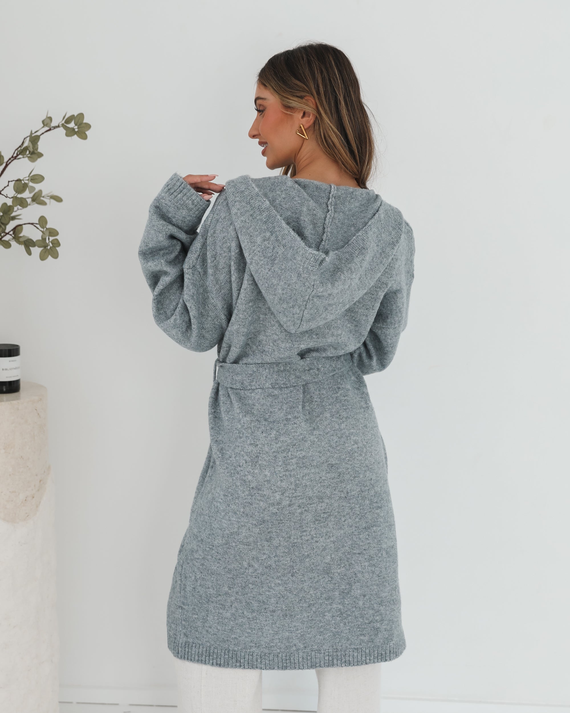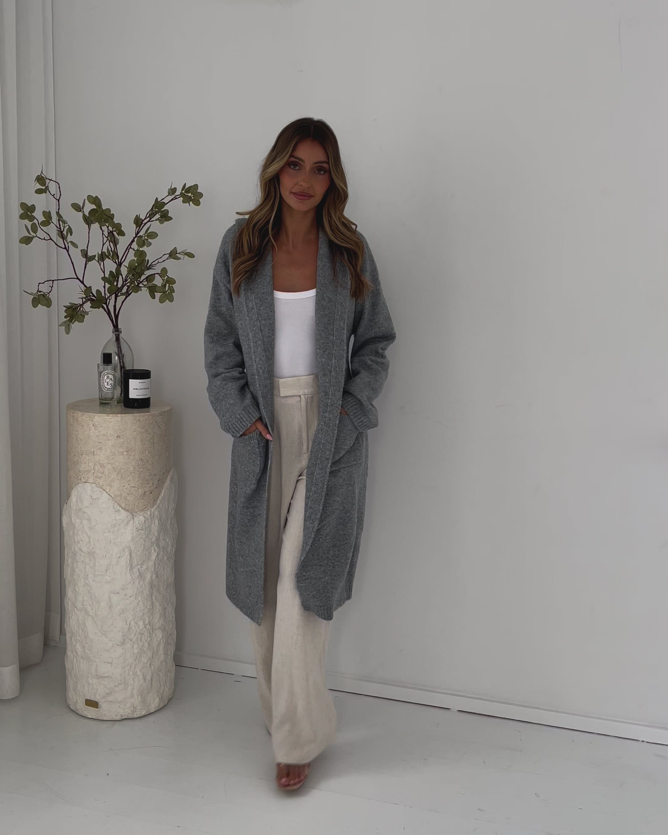 Our Johanne Coatigan comes in a grey colour. The wardrobe MVP that blurs the line between polished outerwear and cosy knitwear, this piece features an open front with belt closure, long sleeves, side pocket and knee length hem. Make it effortlessly chic with a ribbed midi dress & knee-high boots!