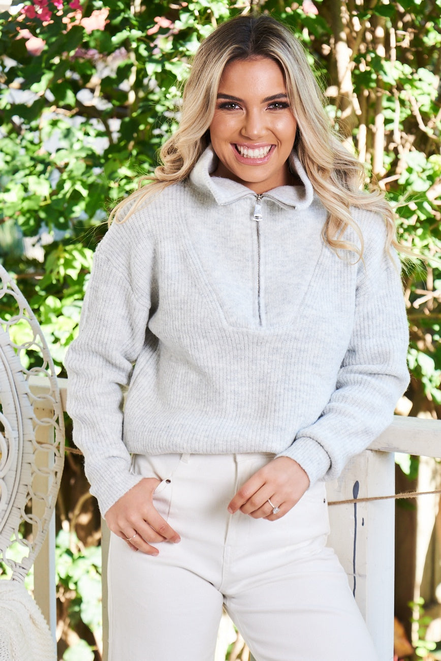 Our Merete Knit comes in a neutral grey tone. It features a high collar that comes together with a zipper, long relaxed sleeves and a contrasting rib knit pattern all over the garment. This relaxed knit is perfect for layering during the colder months ahead!