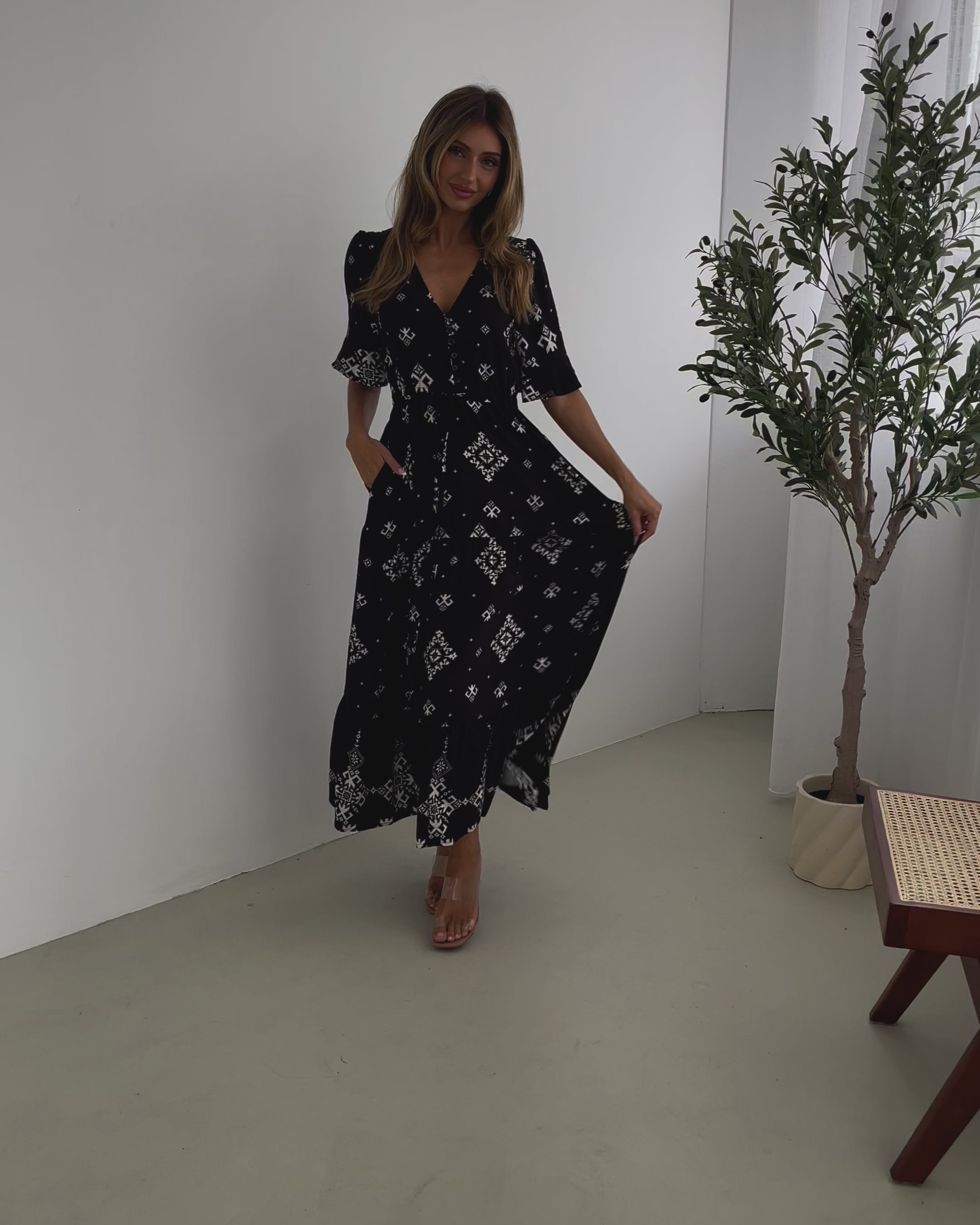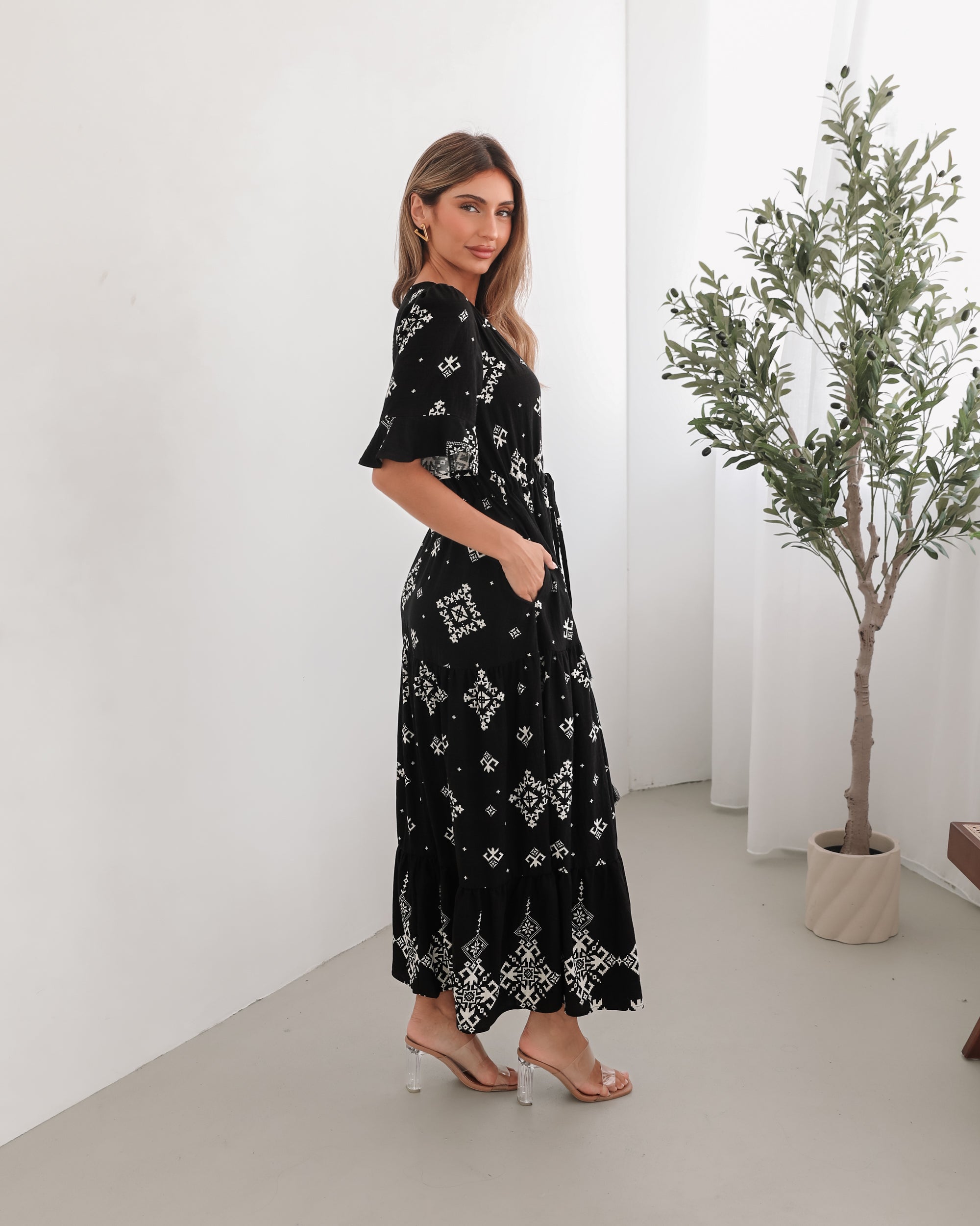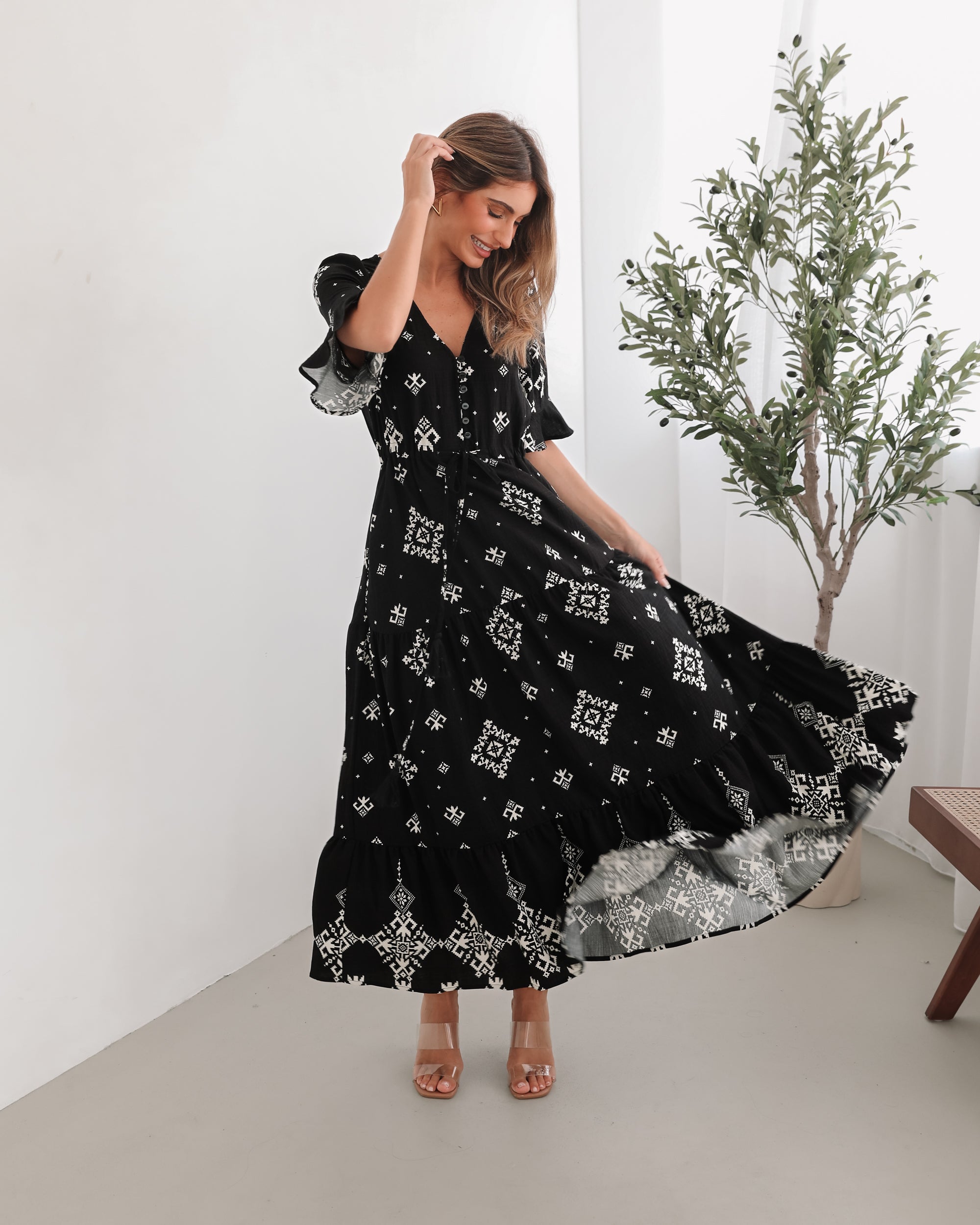 Our Ortensia Dress comes in a black base with white prints. Dark hue, soft movement, and a silhouette that feels as good as it looks, this piece features a v-neckline, short sleeves with flounce, top-front buttons, flowy skirt and midi length hem. Dress it up with ankle boots and a diamond accessory!