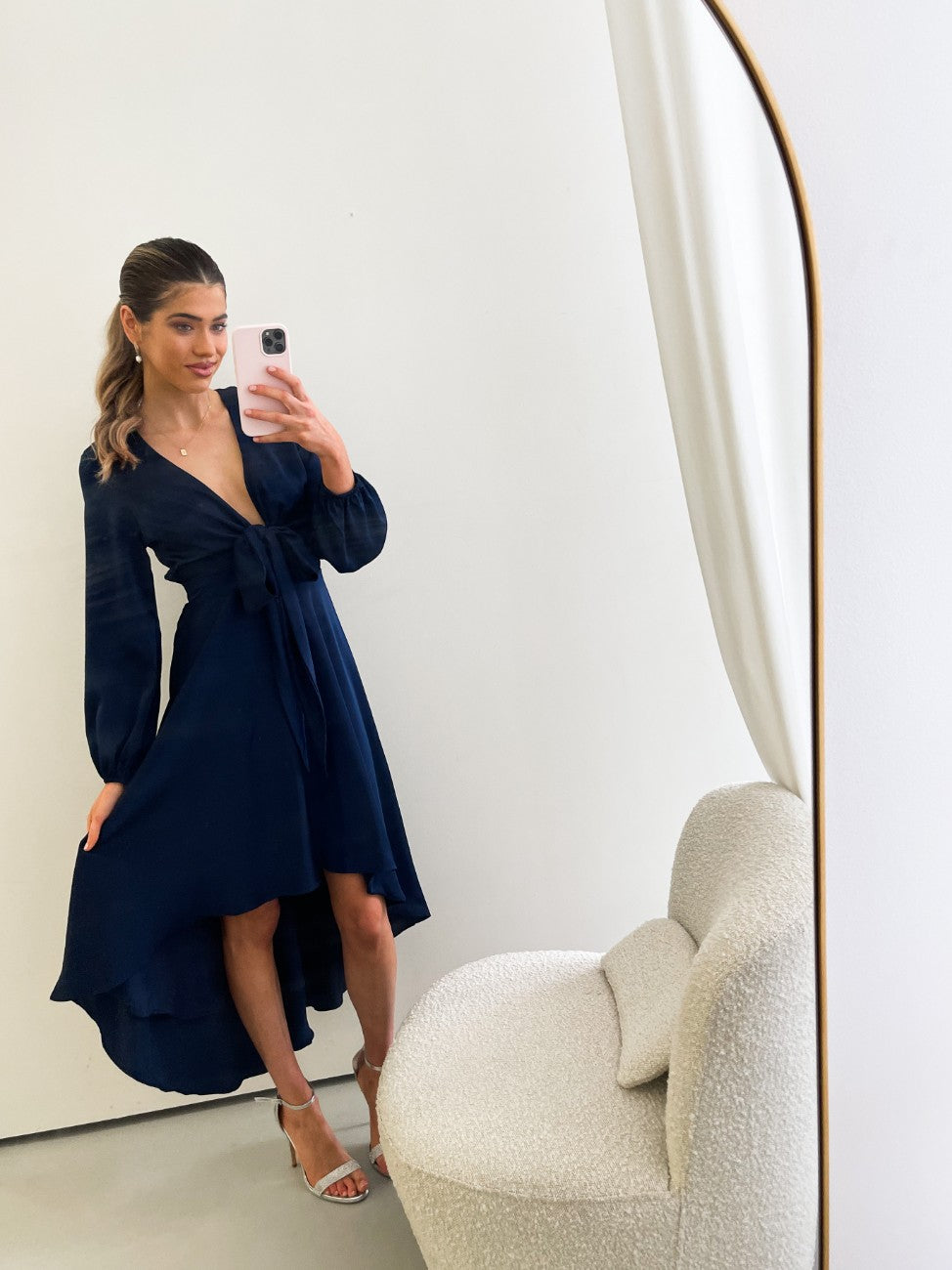 Our Bryleigh Dress comes in a navy blue tone. It features a v neckline and long bishop sleeves, coming together at the front with a fabric tie. This flowy midi pairs beautifully with heels for an effortless trans seasonal look!