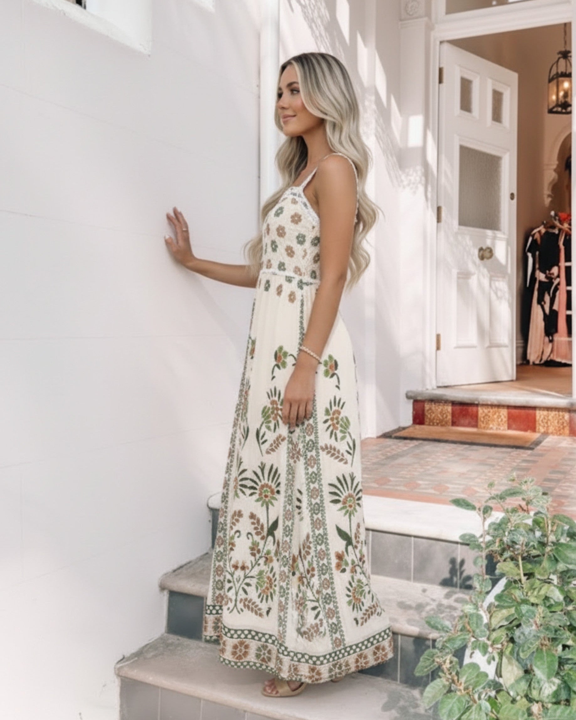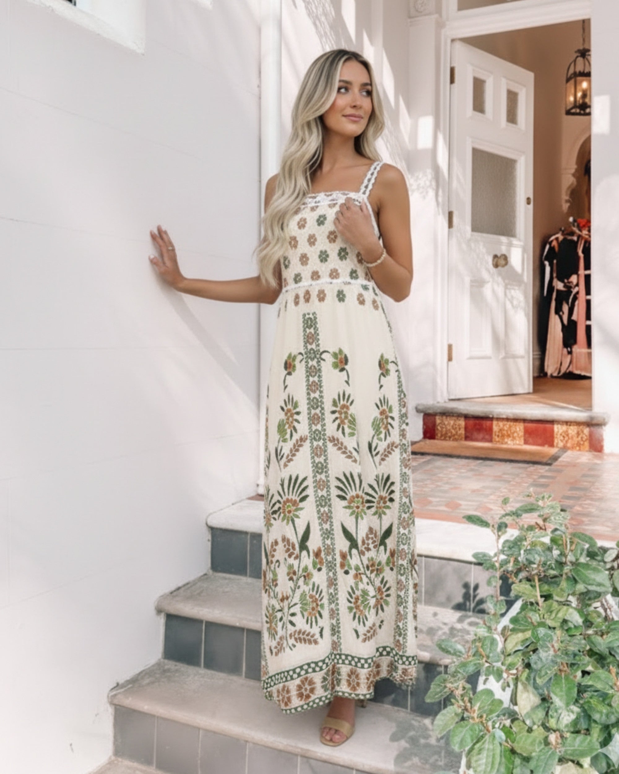 Embrace your inner earth goddess with the captivating Ione Dress - Green Multi. This piece is a celebration of bohemian luxury, featuring a stunning, intricate block-style print in rich, muted tones of sage green, olive, taupe, and rust. It evokes a beautiful, vintage textile feel that looks incredible in natural light.