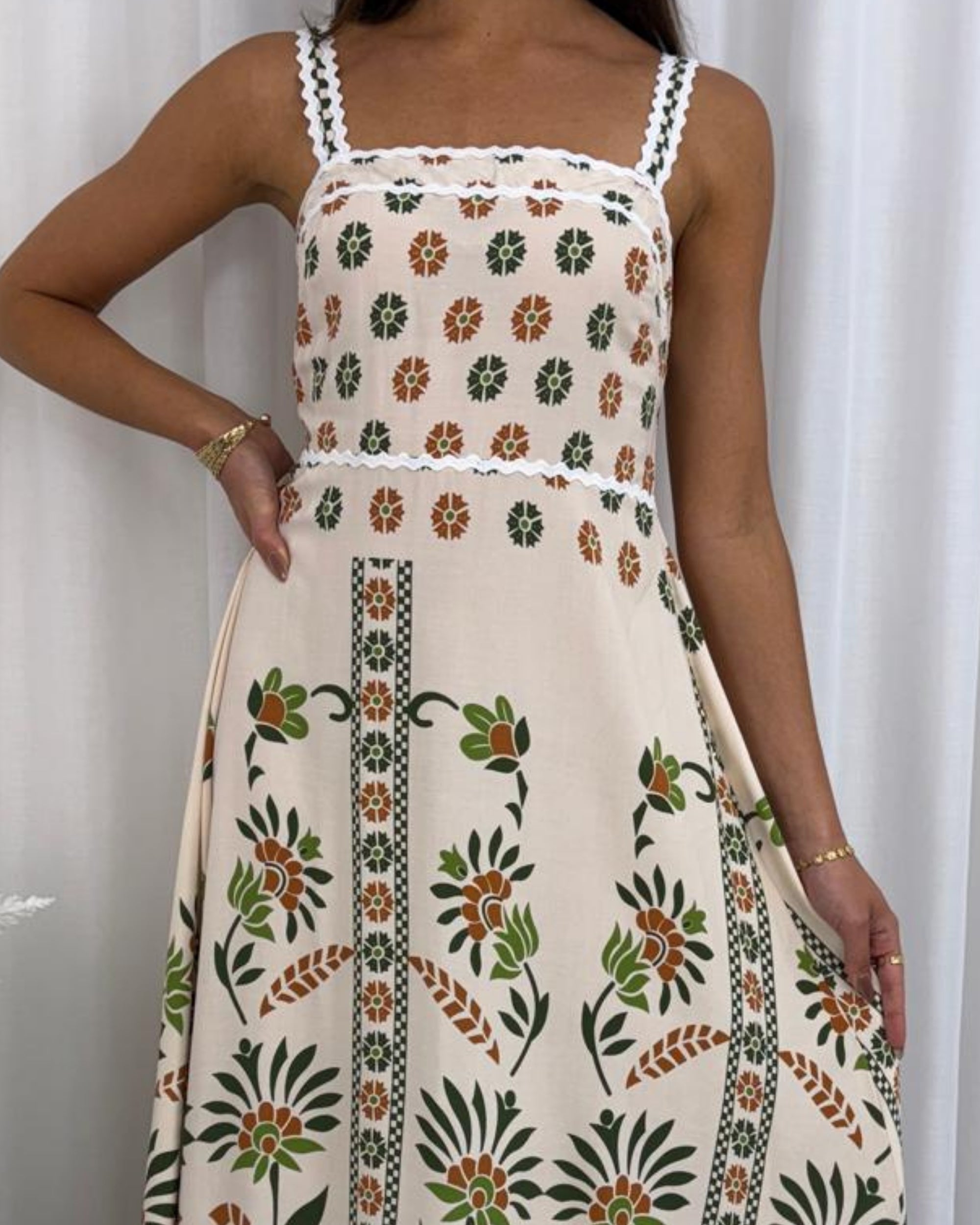 • Key Features: The dress is designed with a comfortable, universally flattering silhouette: wide, detailed straps lead to a gently smocked bodice that cinches the waist, before flowing into a gorgeous full maxi skirt. The vertical pattern detailing adds length, while the intricate border print at the bottom gives it a sophisticated, finished look.
